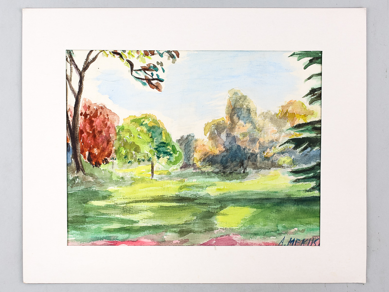 1 pastel sous passe-partout, format , signée A. Mekusa, s.d. [ circa 1967 ], avec son cachet A. Mekusa Artiste peintre Paris au verso (de l'aquarellel et du passe-partout), portant au verso, au stylo la mention : 1028 Vue au Parc Montsouris Commentaire : Bon exemplaire.