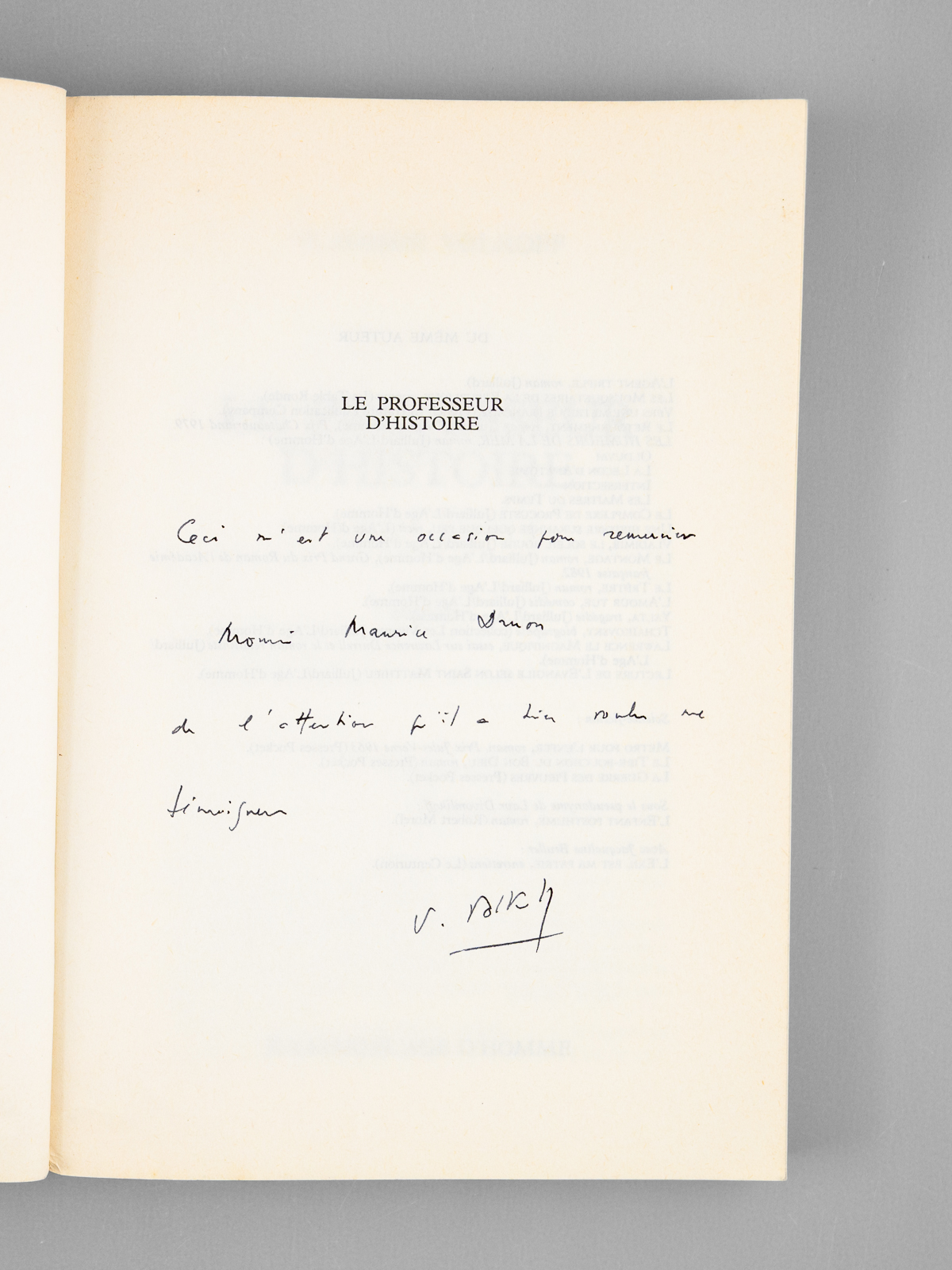 Commentaire : Etat très satisfaisant pour ces exemplaires d'une origine prestigieuse.. Envois manuscrits de l'auteur à l'académicien Maurice Druon : 'A Monsieur Maurice Druon, respectueux et reconnaissants souvenirs de l'auteur.'; 'Ceci m'est une occasion pour remercier Monsieur Maurice Druon de l'attention qu'il a bien voulu me témoigner' (Le professeur d'histoire) ; 'A Monsieur Maurice Druon, en respectueux hommage, cette histoire d'un prince maudit' (Le Montage) ; A Monsieur Maurice Druon, respectueux hommage' (Le Bouclage). Maurice Druon (1918-2009) , neveu de Joseph Kessel, fut résistant, écrivain auteur notamment de la saga historique des Rois maudits, et homme politique. Elu à l'Académie Française en 1968, il en devint le Secrétaire Perpétuel en 1985. Prix pour l'ensemble.