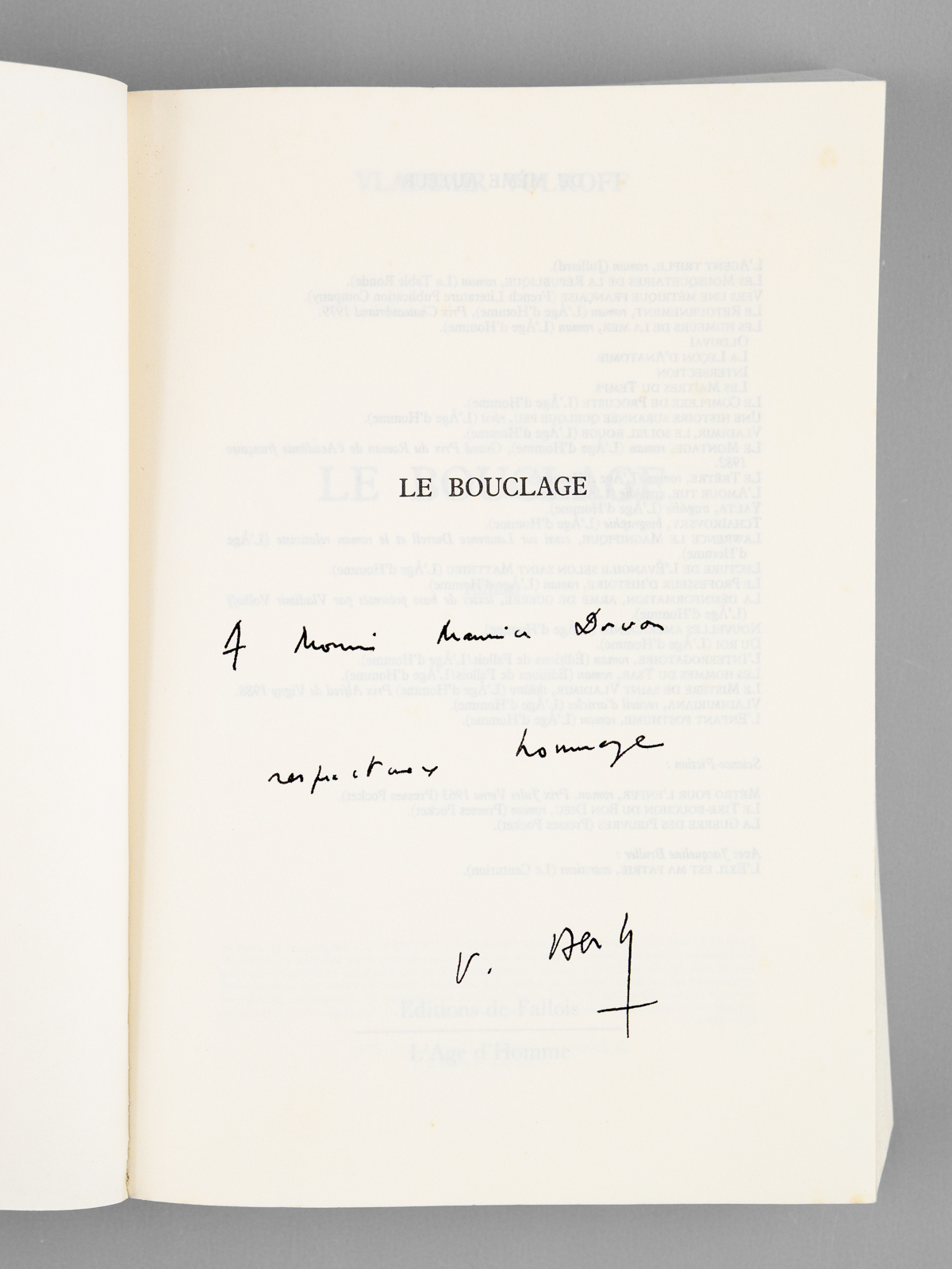 Envois ms. de l'auteur, 4 vol. dont 3 in-8 br. et un in-12 br., Julliard - l'Age d'Homme, éditions de Fallois, l'Age d'Homme, 1986, 1985, 1982 et 1990, 241 pp., 255 pp., 348 pp. et 588 pp.