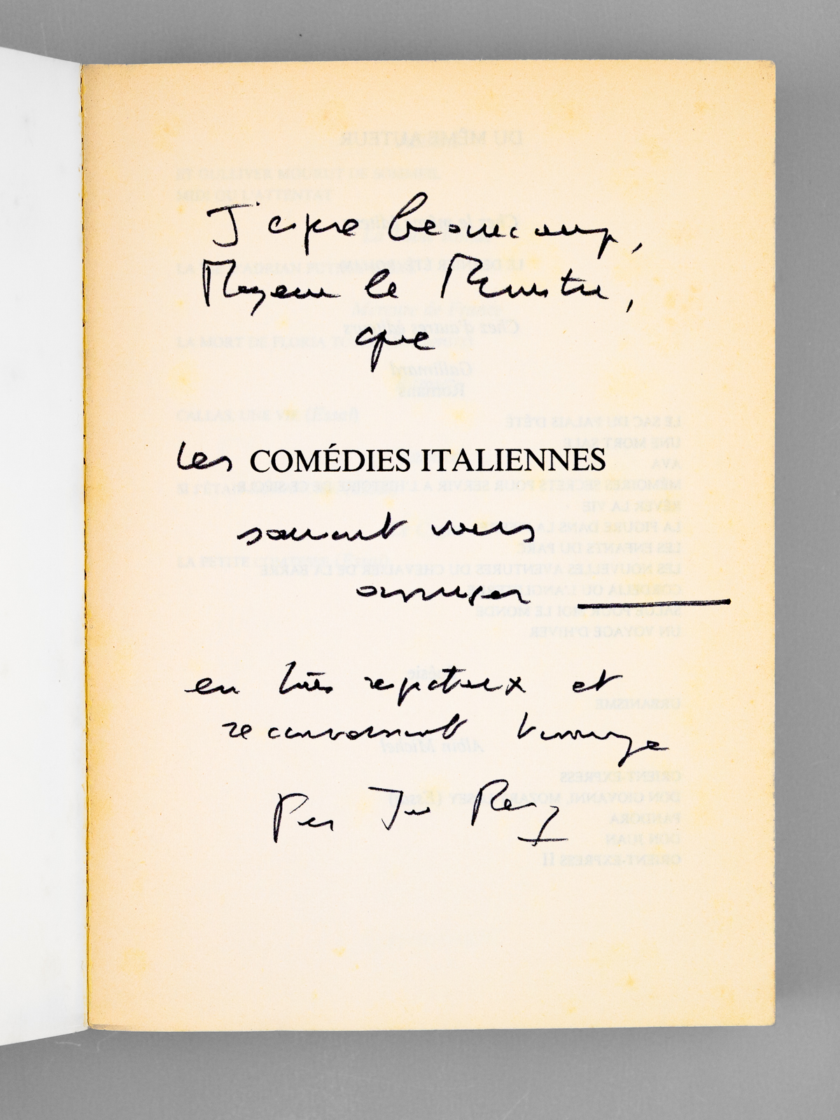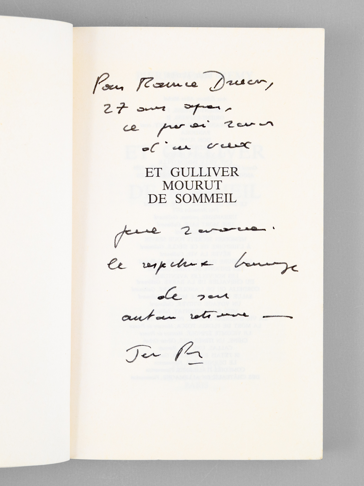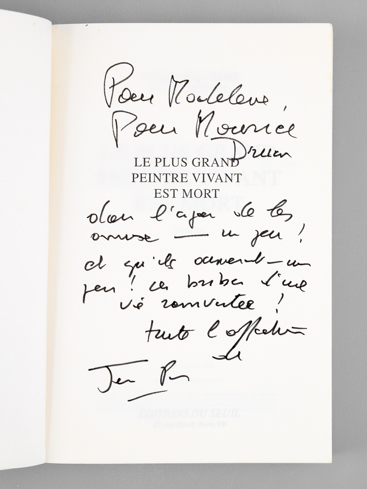 4 vol. in-8 br., Flammarion, 1987, Seuil, 2007, Julliard, 1988 Commentaire : Bon ensemble réunissant ces 4 romans, tous enrichis d'une belle dédicace de Pierre-Jean Rémy à Maurice Druon (et à son épouse). Bon état (qq. petits frott. en couv. et qq. rouss. sur tranches) pour cet ensemble de provenance prestigieuse : de la bibliothèque du grand écrivain Maurice Druon, Secrétaire Perpétuel de l'Académie Française de 1985 à 1999, auteur des 'Rois Maudits' et co-auteur avec son oncle Joseph Kessel du 'Chant des Partisans'. Conformément à sonhabitude, Maurice Druon a replié dans 2 volumes l'angle des feuillets dont la lecture avait plus particulièrement retenu son attention.