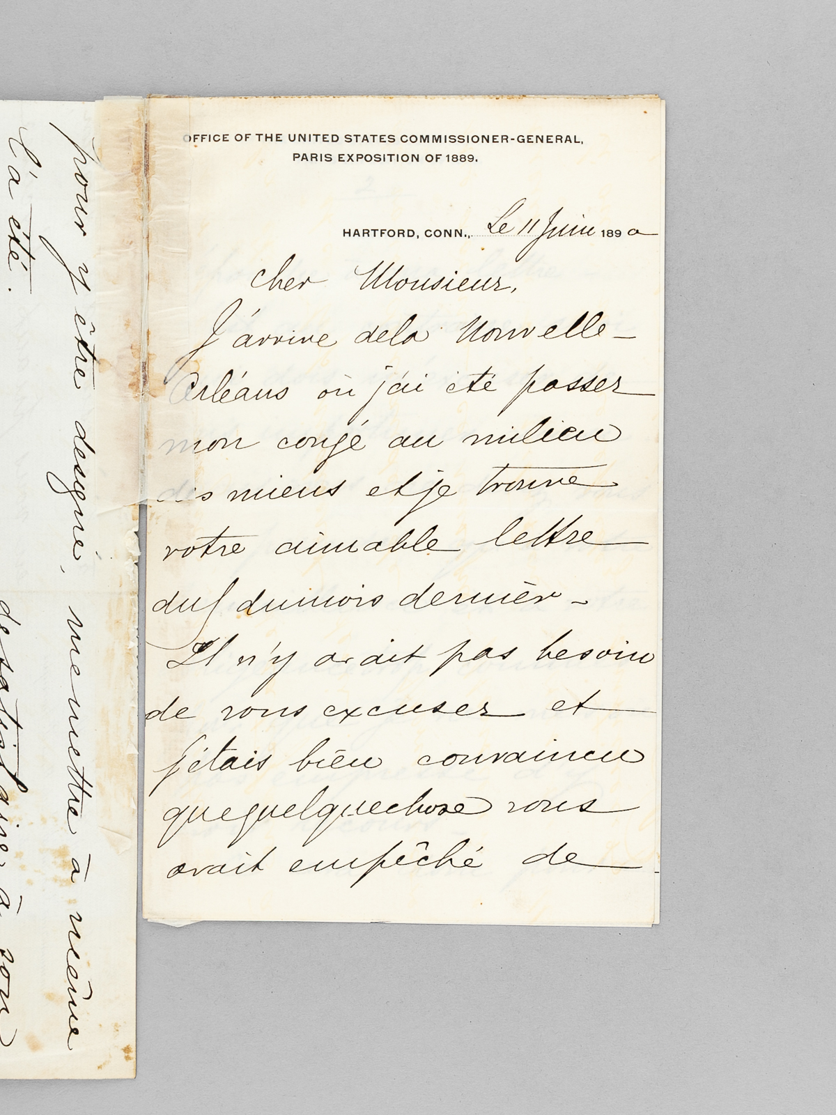 2 lettres autographes signées à en-tête du Commissariat Général des Etats-Unis d'Amérique Exposition Universelle [ Office of the United States Commissioner-General Paris Exposition of 1889 ] 1 LAS datée du 1