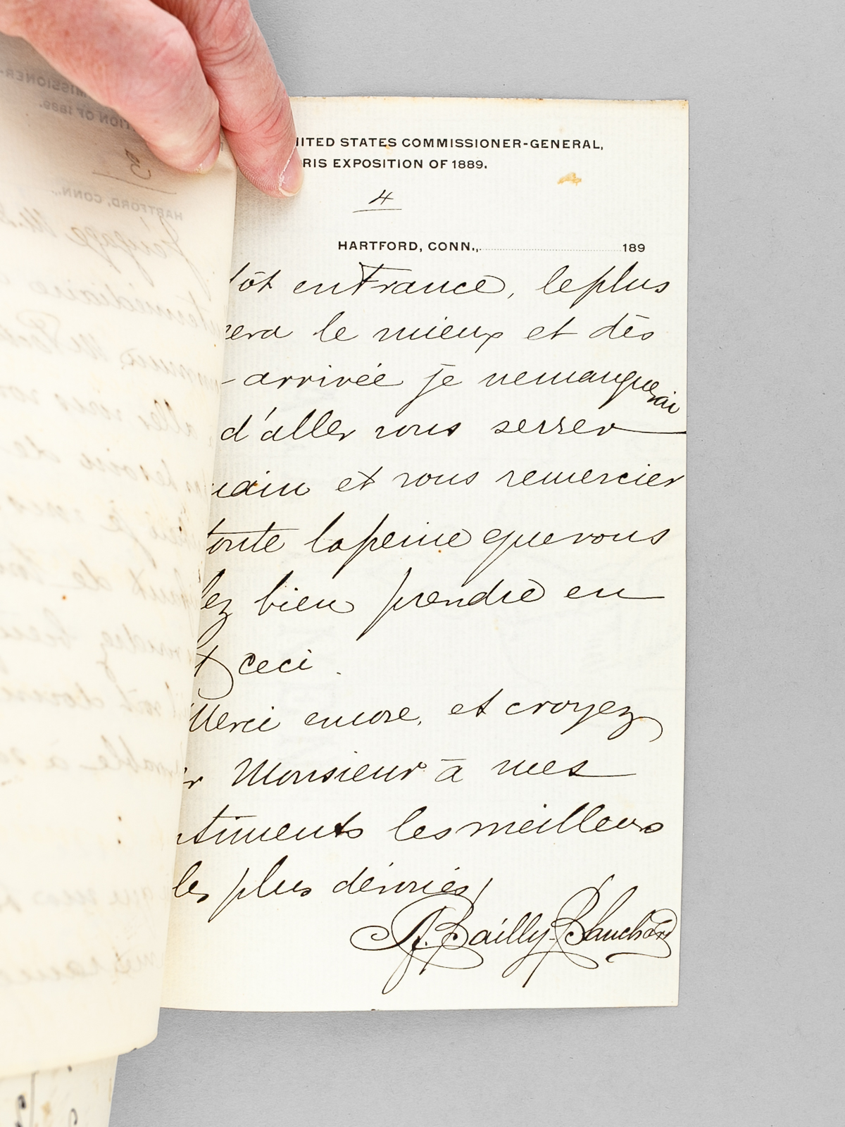 2 lettres autographes signées à en-tête du Commissariat Général des Etats-Unis d'Amérique Exposition Universelle [ Office of the United States Commissioner-General Paris Exposition of 1889 ] 1 LAS datée du 1 - Auteur: BAILLY-BLANCHARD, Arthur ; [ BAILEY-BLANCHARD ] - Année d'édition: 1889