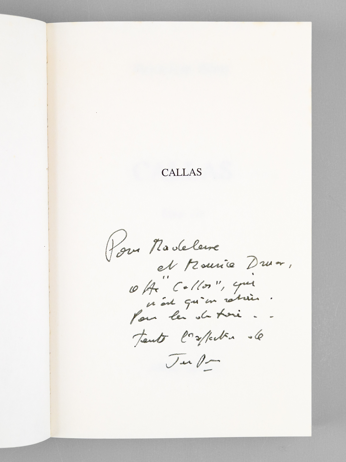 Commentaire : Bel envoi de l'auteur pour 'Madeleine et Maurice Druon, ce 'La Callas', qui n'est qu'un retiré. Pour les distraire... Toute l'affection de Jean Pierre' pour cet ouvrage de provenance prestigieuse : de la bibliothèque du grand écrivain Maurice Druon, Secrétaire Perpétuel de l'Académie Française de 1985 à 1999, auteur des 'Rois Maudits' et co-auteur avec son oncle Joseph Kessel du 'Chant des Partisans'.