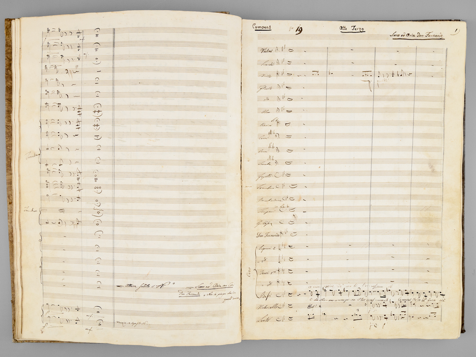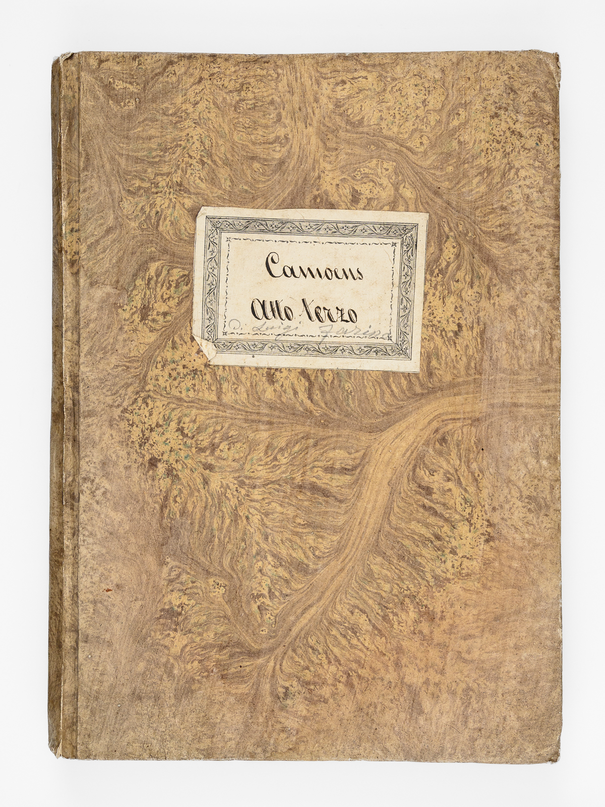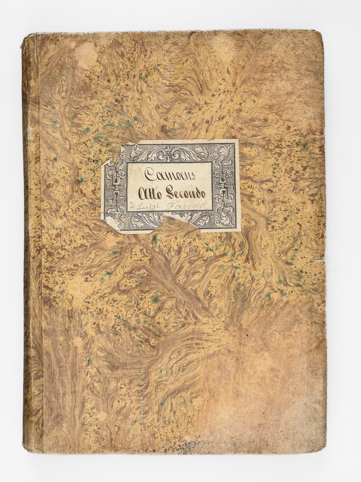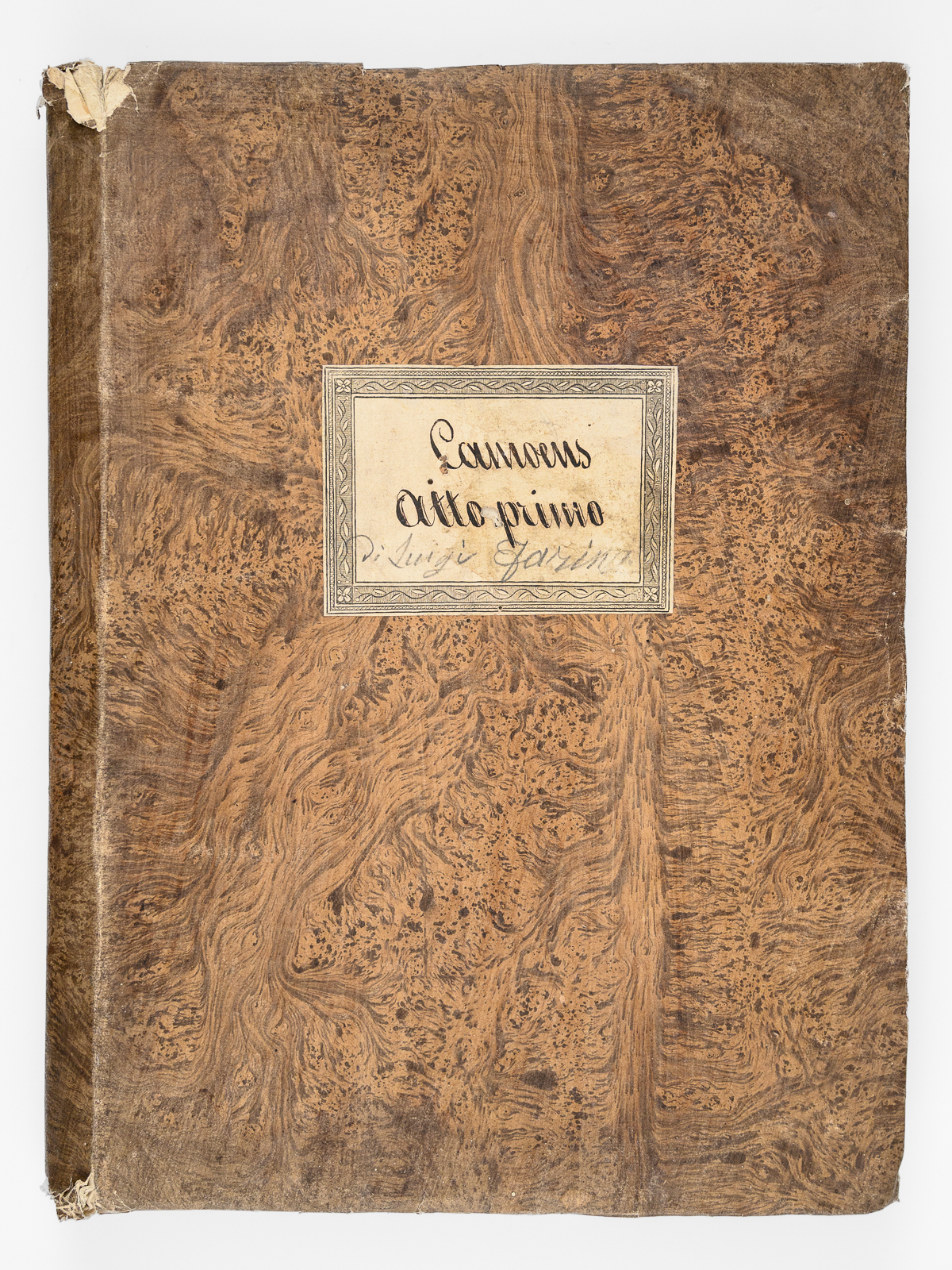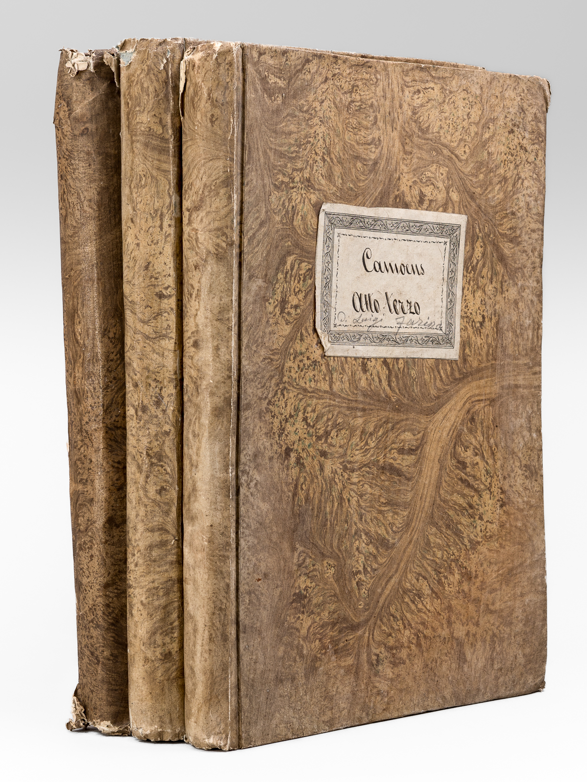 3 vol. in-folio (28 x 40 cm) cartonnage recouvert de papier imitation veau raciné, papier au filigrane à Aigle à deux têtes couronnées et initiales D. V. C., Venezia, 1856 - 1857, 134 ff. ; 142 ff. ; 96 ff. Commentaire : Impressionnant manuscrit musical, vraisemblablement rédigé sous la direction et peut-être de la main de Luigi Farina. Certaines parties paraissent inachevées, et l'écriture semble de plusieurs mains ; on relève deux dates, la première située à 'Venezia' le 25 avril 1856 (Acte I, scène 6), la dernière le 6 février 1857 (fin de l'acte III). Les paroles correspondent précisément à celles du livret imprimé vers juin 1857 à Padoue (Tipografia Crescini) dans le 'Camoens. Dramma lirico in tre parti. Musica espressamente scritta da Luigi Farina pel Teatro Nuovo di Padova nell'occasione della Fiera del Santo'. L'argument, souvent repris par les compositeurs italiens au XIXe siècle, est celui des amours de Camoëns et de 'Donna Catterina di Atayde' (Domenico Bolognese en proposera une version en 1873 et précisera en préface : '... molti autori italiani e stranieri han trattato prima di me il medesimo soggetto, seguendo la cronaca tradizionale degli amori et delle sventure del poeta portoghese...'). Bon état général (accrocs en coiffes, qq. mouill. et cahiers faibles)