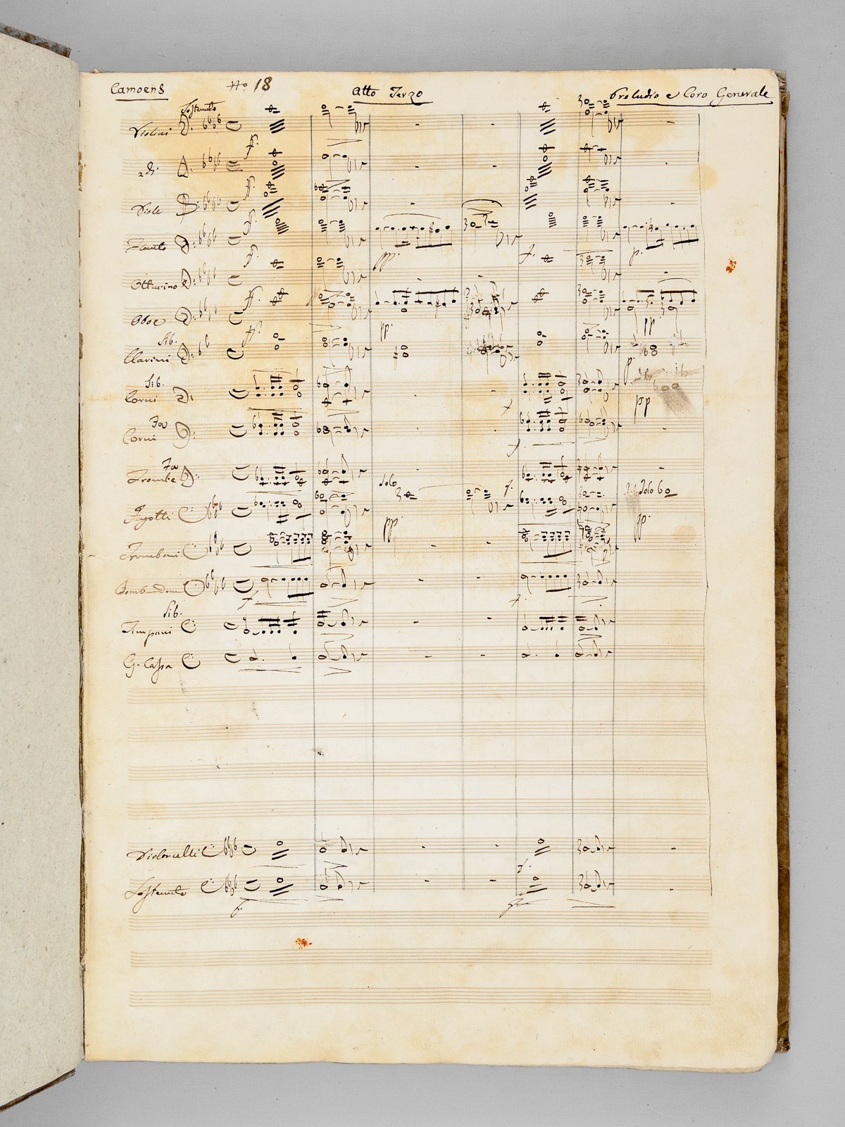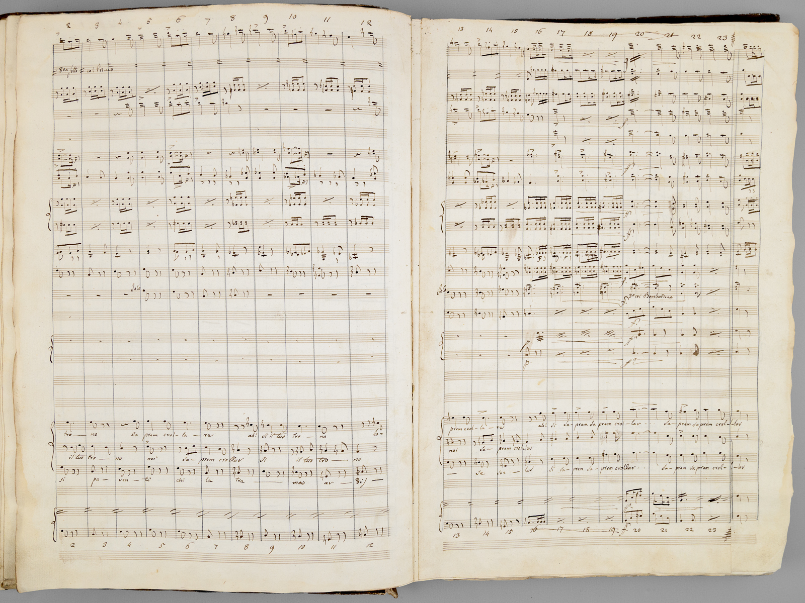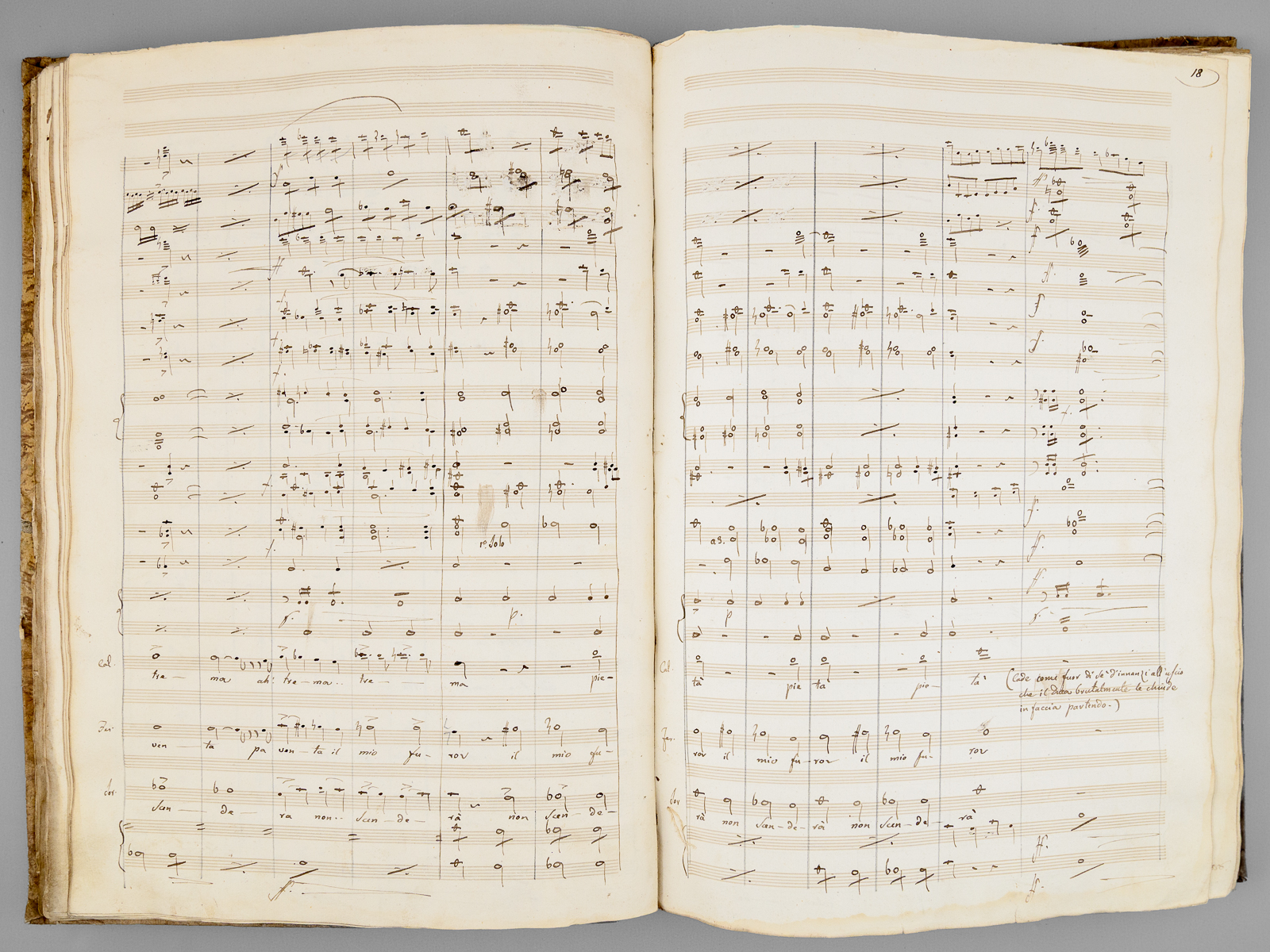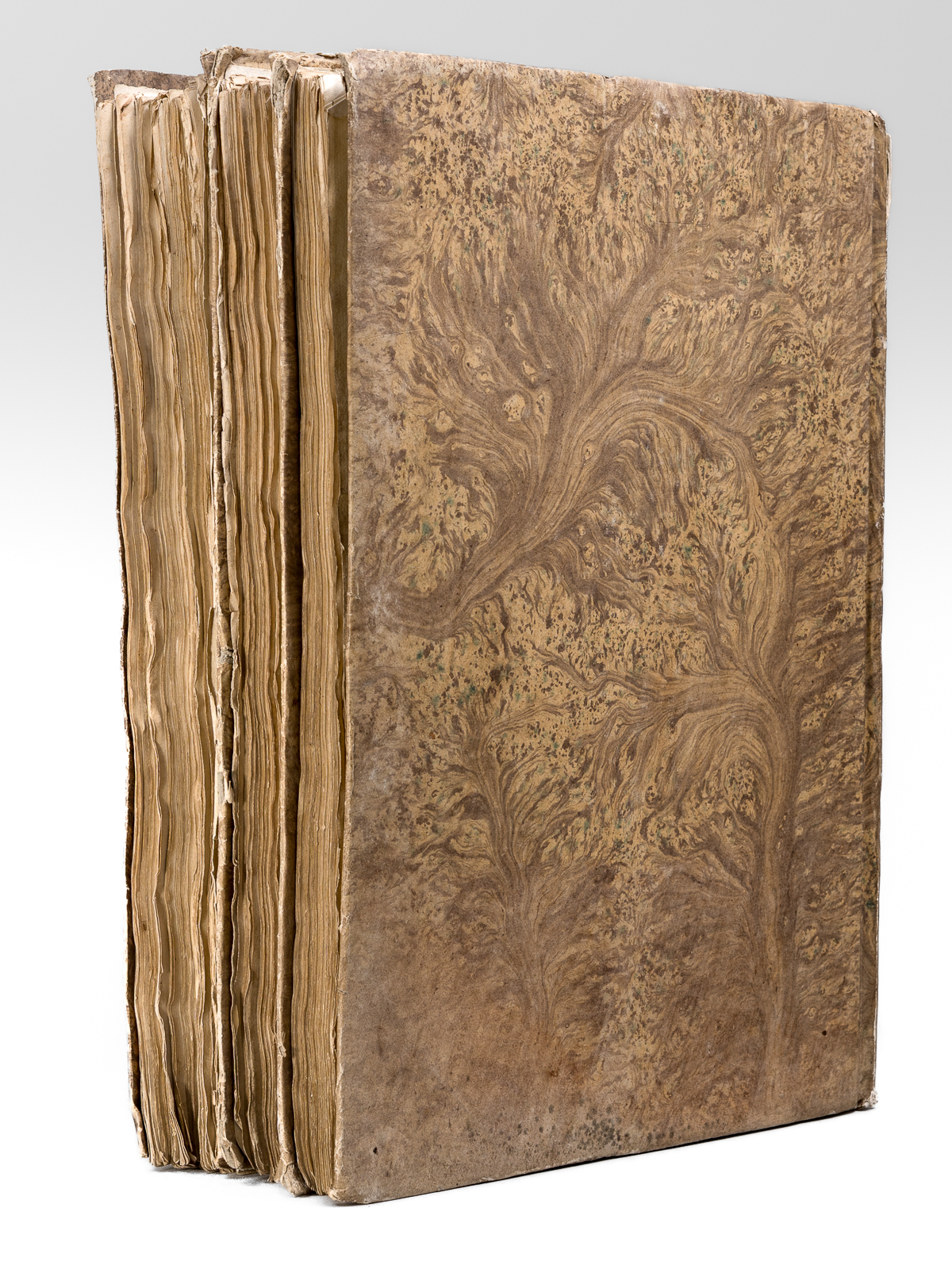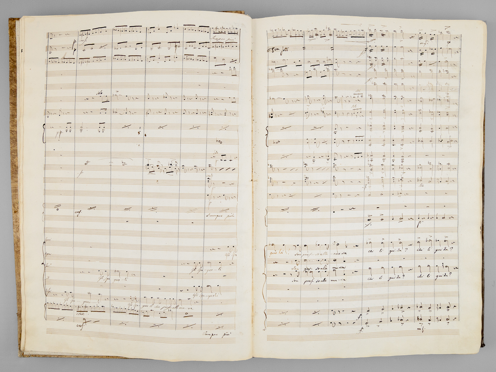 3 vol. in-folio (28 x 40 cm) cartonnage recouvert de papier imitation veau raciné, papier au filigrane à Aigle à deux têtes couronnées et initiales D. V. C., Venezia, 1856 - 1857, 134 ff. ; 142 ff. ; 96 ff. Commentaire : Impressionnant manuscrit musical, vraisemblablement rédigé sous la direction et peut-être de la main de Luigi Farina. Certaines parties paraissent inachevées, et l'écriture semble de plusieurs mains ; on relève deux dates, la première située à 'Venezia' le 25 avril 1856 (Acte I, scène 6), la dernière le 6 février 1857 (fin de l'acte III). Les paroles correspondent précisément à celles du livret imprimé vers juin 1857 à Padoue (Tipografia Crescini) dans le 'Camoens. Dramma lirico in tre parti. Musica espressamente scritta da Luigi Farina pel Teatro Nuovo di Padova nell'occasione della Fiera del Santo'. L'argument, souvent repris par les compositeurs italiens au XIXe siècle, est celui des amours de Camoëns et de 'Donna Catterina di Atayde' (Domenico Bolognese en proposera une version en 1873 et précisera en préface : '... molti autori italiani e stranieri han trattato prima di me il medesimo soggetto, seguendo la cronaca tradizionale degli amori et delle sventure del poeta portoghese...'). Bon état général (accrocs en coiffes, qq. mouill. et cahiers faibles)