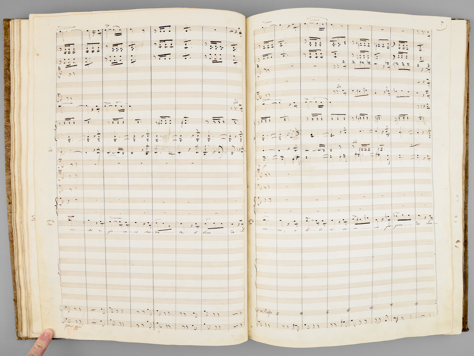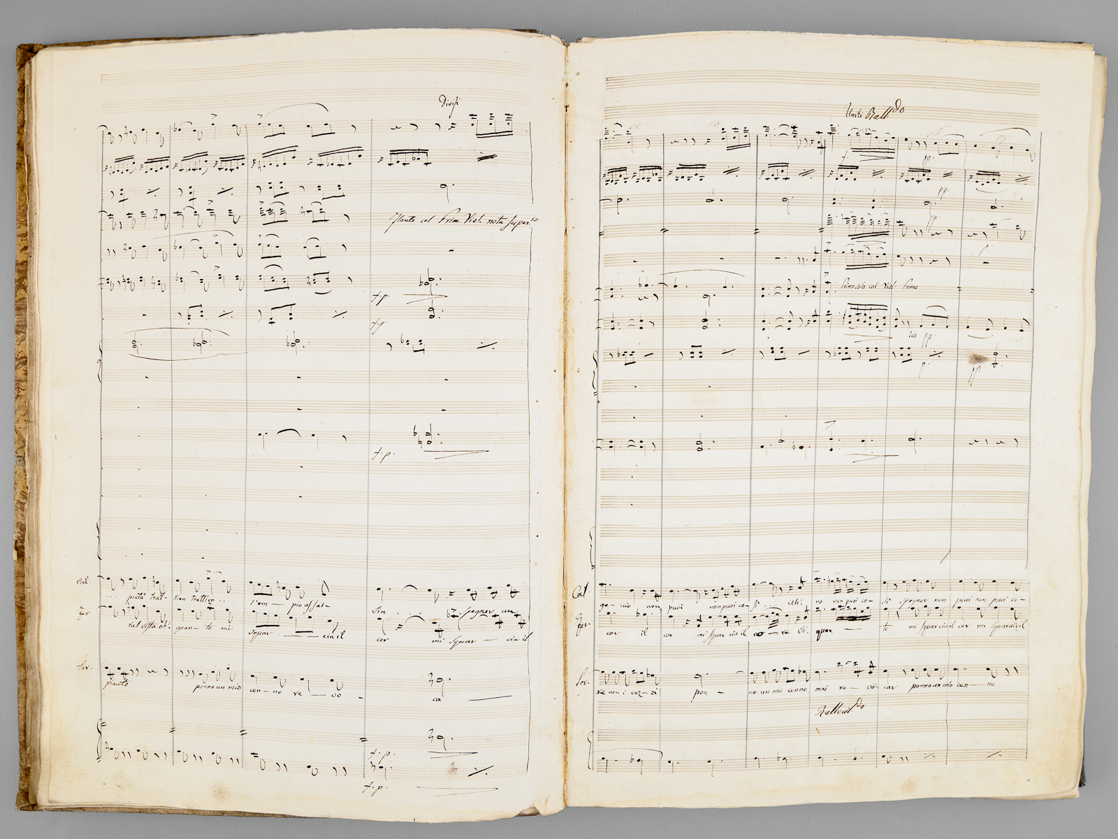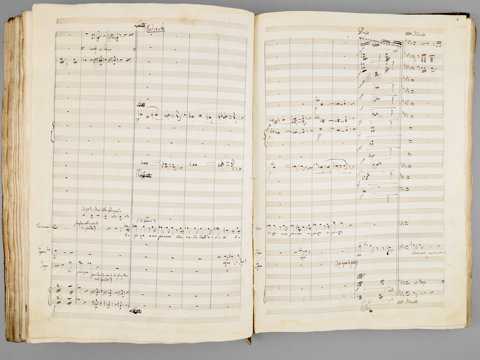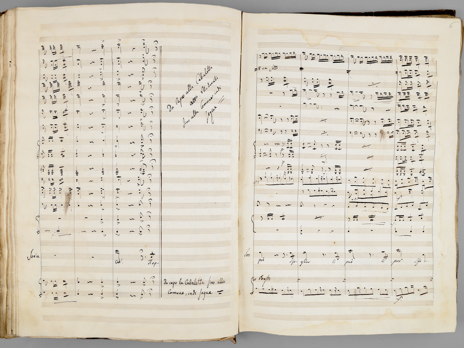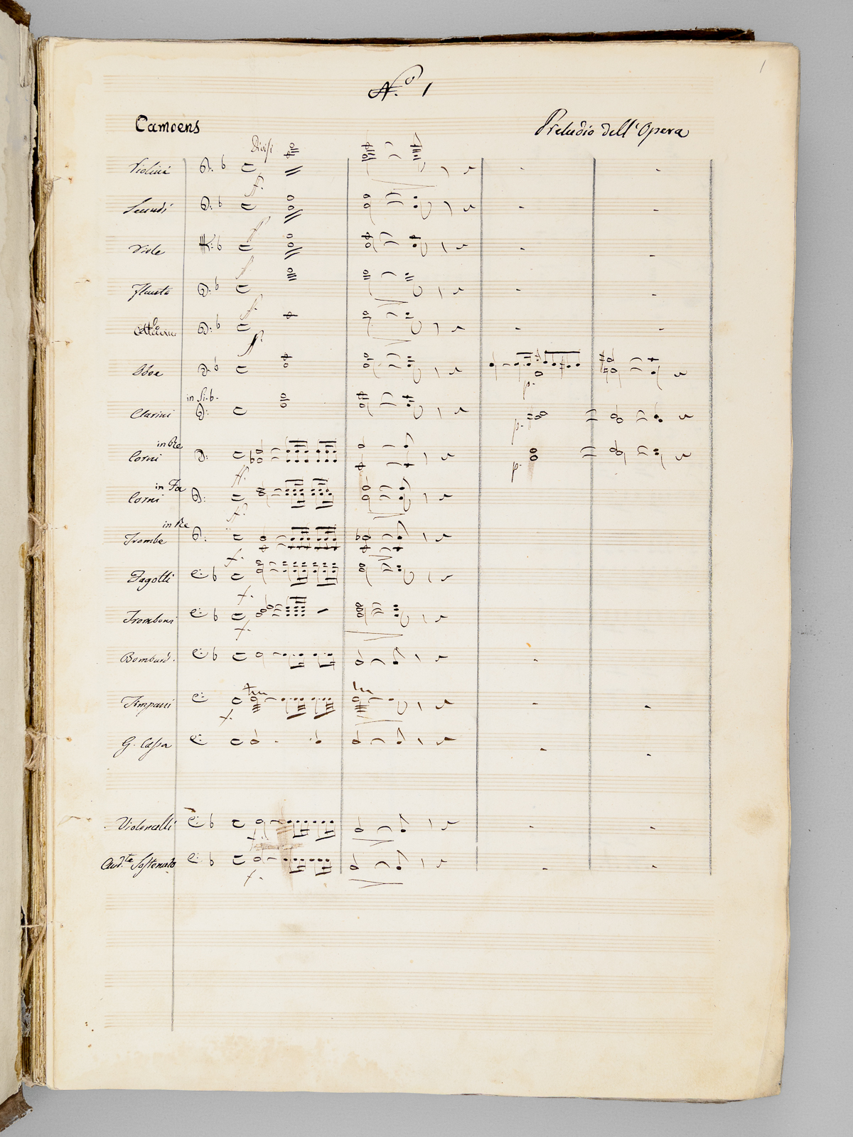 3 vol. in-folio (28 x 40 cm) cartonnage recouvert de papier imitation veau raciné, papier au filigrane à Aigle à deux têtes couronnées et initiales D. V. C., Venezia, 1856 - 1857, 134 ff. ; 142 ff. ; 96 ff. Commentaire : Impressionnant manuscrit musical, vraisemblablement rédigé sous la direction et peut-être de la main de Luigi Farina. Certaines parties paraissent inachevées, et l'écriture semble de plusieurs mains ; on relève deux dates, la première située à 'Venezia' le 25 avril 1856 (Acte I, scène 6), la dernière le 6 février 1857 (fin de l'acte III). Les paroles correspondent précisément à celles du livret imprimé vers juin 1857 à Padoue (Tipografia Crescini) dans le 'Camoens. Dramma lirico in tre parti. Musica espressamente scritta da Luigi Farina pel Teatro Nuovo di Padova nell'occasione della Fiera del Santo'. L'argument, souvent repris par les compositeurs italiens au XIXe siècle, est celui des amours de Camoëns et de 'Donna Catterina di Atayde' (Domenico Bolognese en proposera une version en 1873 et précisera en préface : '... molti autori italiani e stranieri han trattato prima di me il medesimo soggetto, seguendo la cronaca tradizionale degli amori et delle sventure del poeta portoghese...'). Bon état général (accrocs en coiffes, qq. mouill. et cahiers faibles)