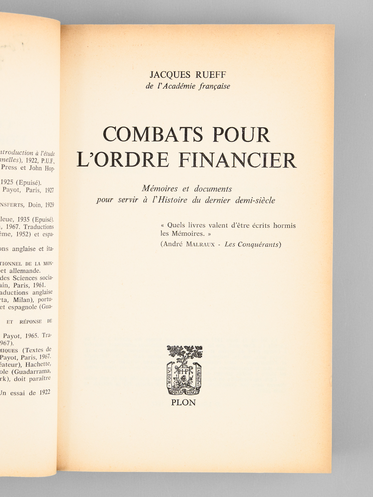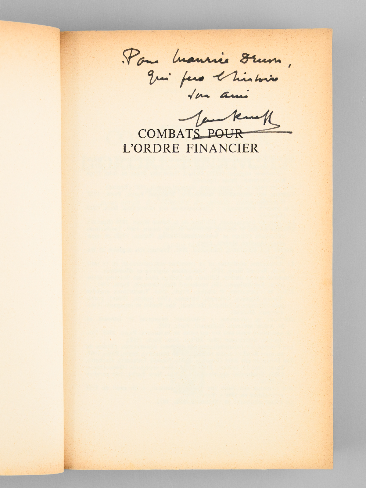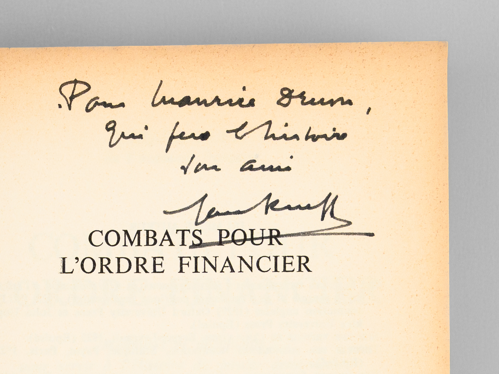 Envoi ms. de l'auteur, 1 vol. in-8 br., Plon, Paris, 1972, 480 pp. Commentaire : Avec un bel envoi : 'Pour Maurice Druon, qui fera l'histoire, son ami'. Maurice Druon (1918-2009), neveu de Joseph Kessel, fut résistant, écrivain auteur notamment de la saga des Rois maudits, homme politique. Elu à l'Académie Française en 1968, il en devint le Secrétaire Perpétuel en 1985. Jacques Rueff, quant à lui, avait été élu à l'Académie en 1964. Etat très satisfaisant (rares annotations en marge par Maurice Druon) pour cet exemplaire d'une origine prestigieuse.