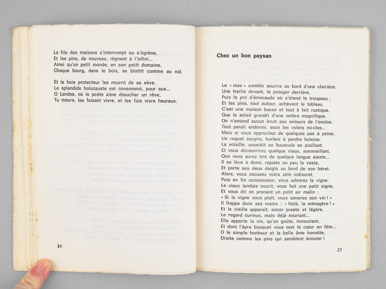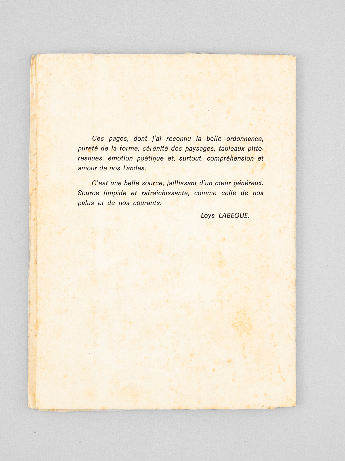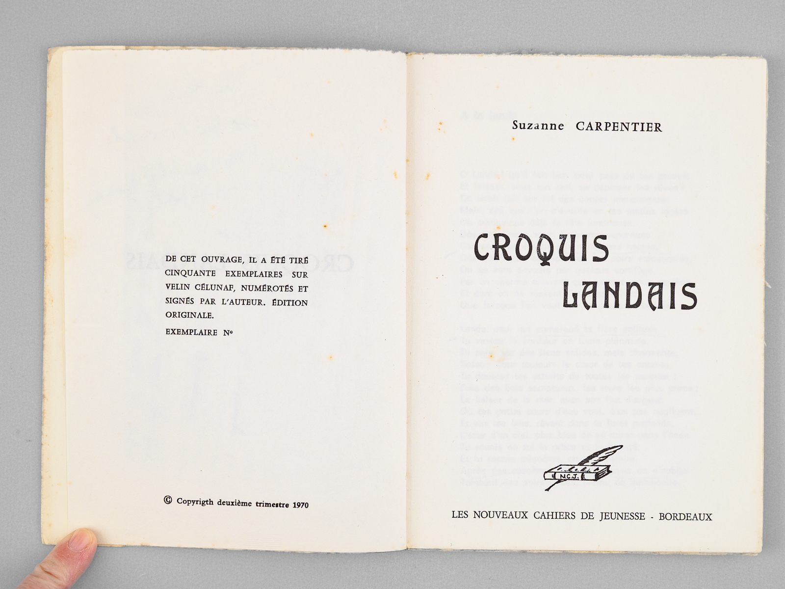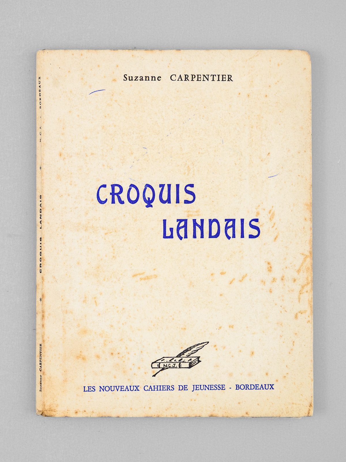 1 vol. in-12 br., Les Nouveaux Cahiers de Jeunesse, Bordeaux, 1970, 69 pp. Commentaire : L'ouvrage est enrichi de 2 belles L.A.S. de l'auteur (une lettre et une carte, rédigées recto-verso). Le destinataire, non précisé, est le professeur René Cuzacq. Suzanne Carpentier le remercie chaleureusement, évoque certains noms (Duffau, Loys Labèque),etc... Ces poèmes évoquant des thèmes landais ('Avec un résinier', 'la gemme', 'le foie gras') ou des lieux ('La Chalosse et le Maransin', 'Mont-de-Marsan', 'Dax', 'Saint-Sever', 'Hossegor', etc...). Etat très satisfaisant pour cet exemplaire annoté, comme à son habitude, par René Cuzacq.