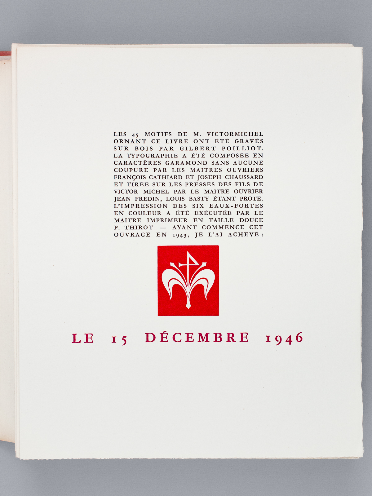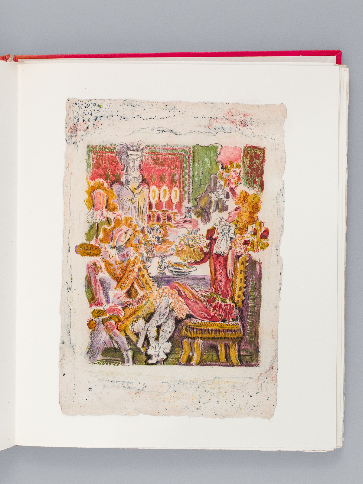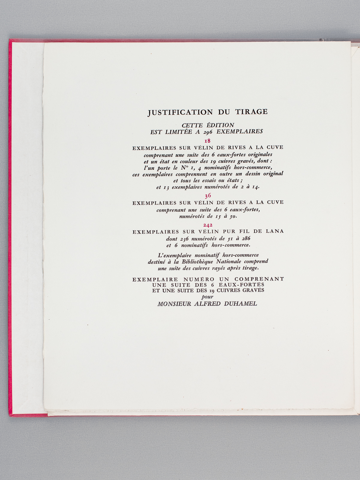 Exemplaire numéro un du tirage à 296 exemplaires, un des 18 exemplaires sur vélin de Rives à la Cuve comprenant une suite des 6 eaux-fortes originales et un état en couleur des 19 cuivres gravés, un des 5 exemplaires comprenant en outre un dessin original et tous les essais ou états, exemplaire nominatif pour M. Alfred Duhamel, 1 vol. in-4 en feuillets sous chemise, chemise cartonnée et étui, Victor Michel, Compagnie Française des Arts Graphiques, Paris, 1946, 186 pp. et 1 f. avec une aquarelle originale signée, un dessin original, 3 suites des illustrations (6 eaux-fortes originales, suite de 13 essais ou états, décomposition en couleurs en 25 planches).