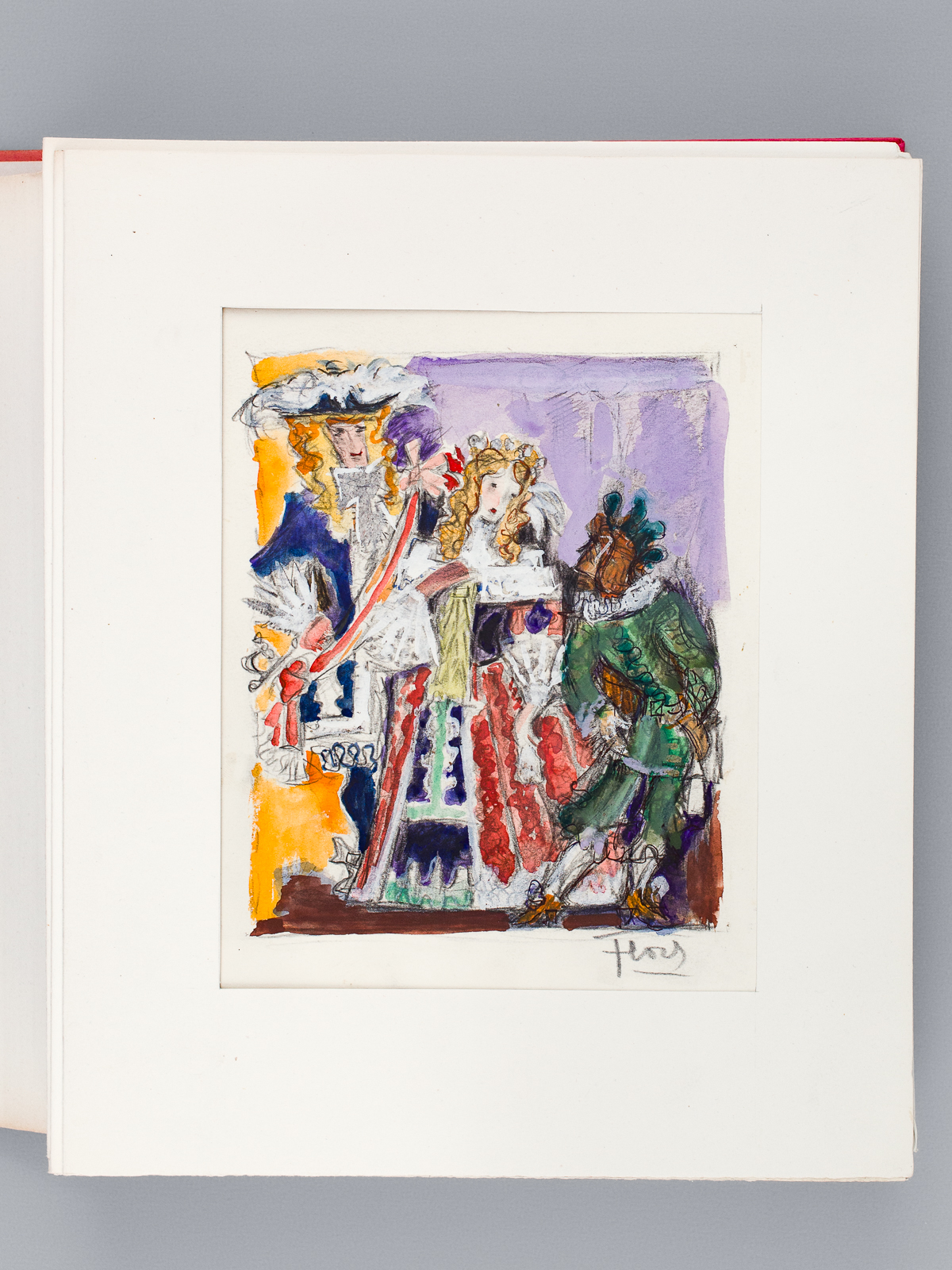 Commentaire : Exemplaire unique, le numéro 1 imprimé pour Alfred Duhamel, dédicacé à celui-ci par Edmond Pognon, par l'éditrice Monique Victor-Michel et par l'illustrateur Pedro Florès (1897-1967), artiste de l'Ecole de Paris. Il contient 6 eaux-fortes en couleurs et est enrichi d'une aquarelle originale signée, d'un dessin original, de la suite des 6 eaux-fortes originales, d'une suite d'essai ou états (13 gravures en noir ou en couleurs) et d'une suite de 25 gravures (décomposition en couleurs des 6 eaux-fortes). Etat très satisfaisant (chemise et étui usagés, petit accroc à la chemise brochée, très bon état par ailleurs pour cet exemplaire méritant d'être établi dans une reliure de qualité).