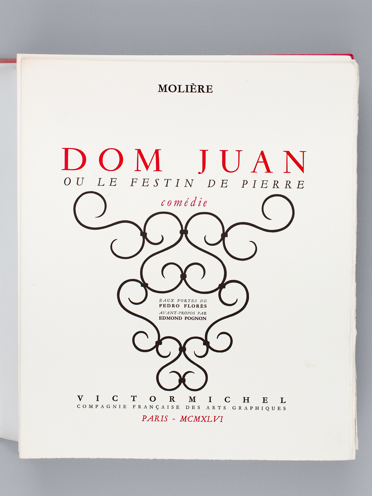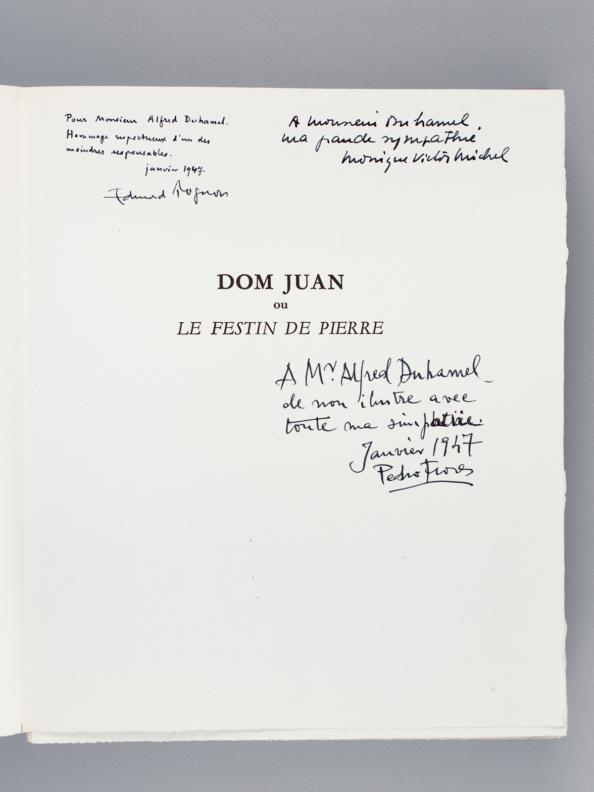 Dom Juan ou Le Festin de Pierre [ Exemplaire numéro Un, dédicacé par l'illustrateur et les éditeurs, enrichi d'une aquarelle originale signée et d'un dessin original ] - Auteur: MOLIERE ; FLORES, Pedro Victor ; POGNON, Edmond - Année d'édition: 1946 |