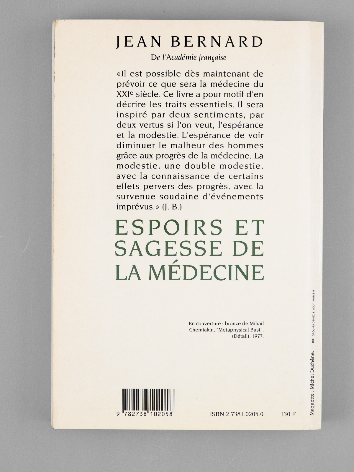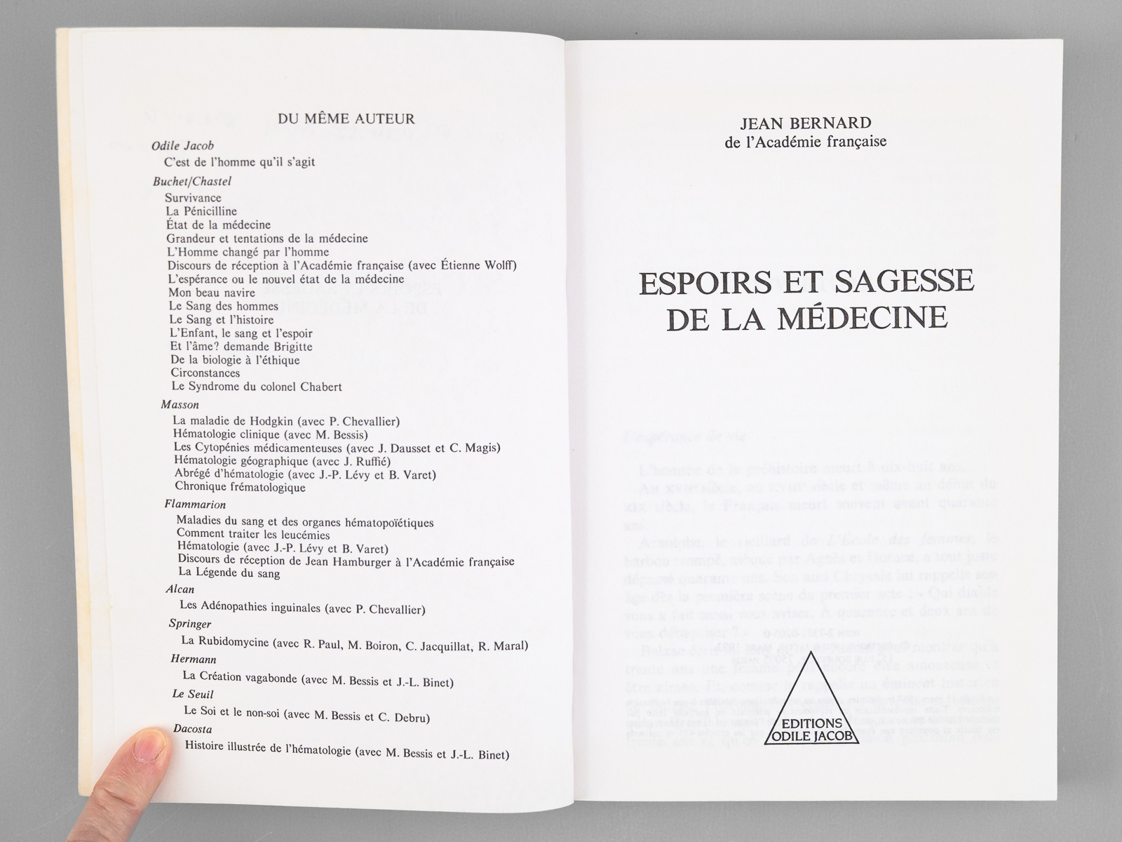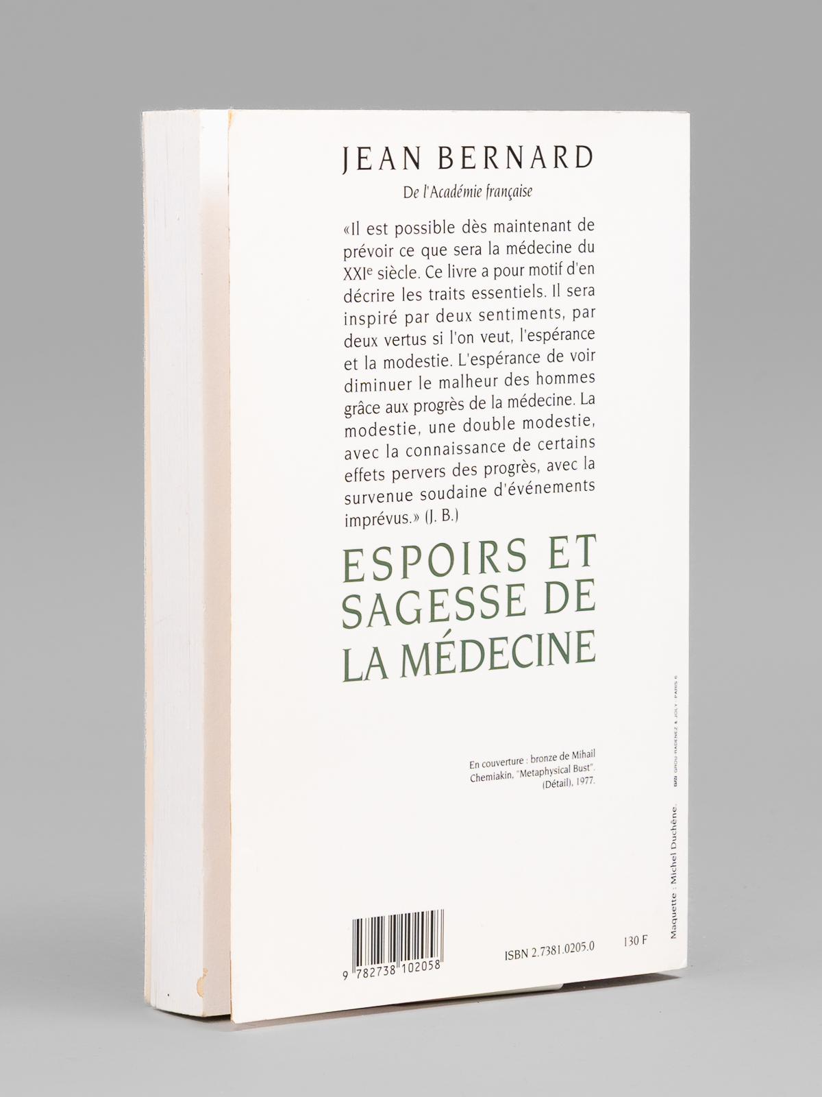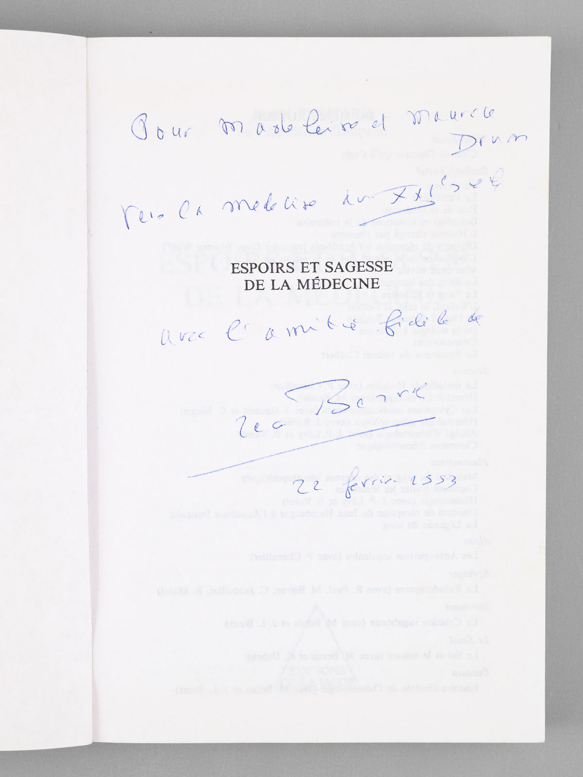 Envoi ms. de l'auteur, 1 vol. in-8 br., éditions Odile Jacob, Paris, 1993, 239 pp. Commentaire : Envoi de l'auteur à Maurice Druon et à son épouse: 'Pour Madeleine et Maurice Druon, vers la médecine du XXIe siècle, avec l'amitié fidèle de Jean Bernard'. L'auteur et le dédicataire étaient tous deux académiciens. Maurice Druon (1918-2009), auteur notamment de la célèbre saga historique des Rois maudits, fut élu à l'Académie Française en 1968. Il en devint le Secrétaire Perpétuel, de 1985 à 1999. L'auteur, quant à lui, fut élu à l'Académie Française en 1975, au fauteuil de Marcel Pagnol. Le professeur Jean Bernard, éminent hématologue et oncologue, présida le Comité National d'Ethique de 1983 à 1993. Etat très satisfaisant (couv. lég. frottées, bon état par ailleurs) pour cet exemplaire d'une origine prestigieuse.