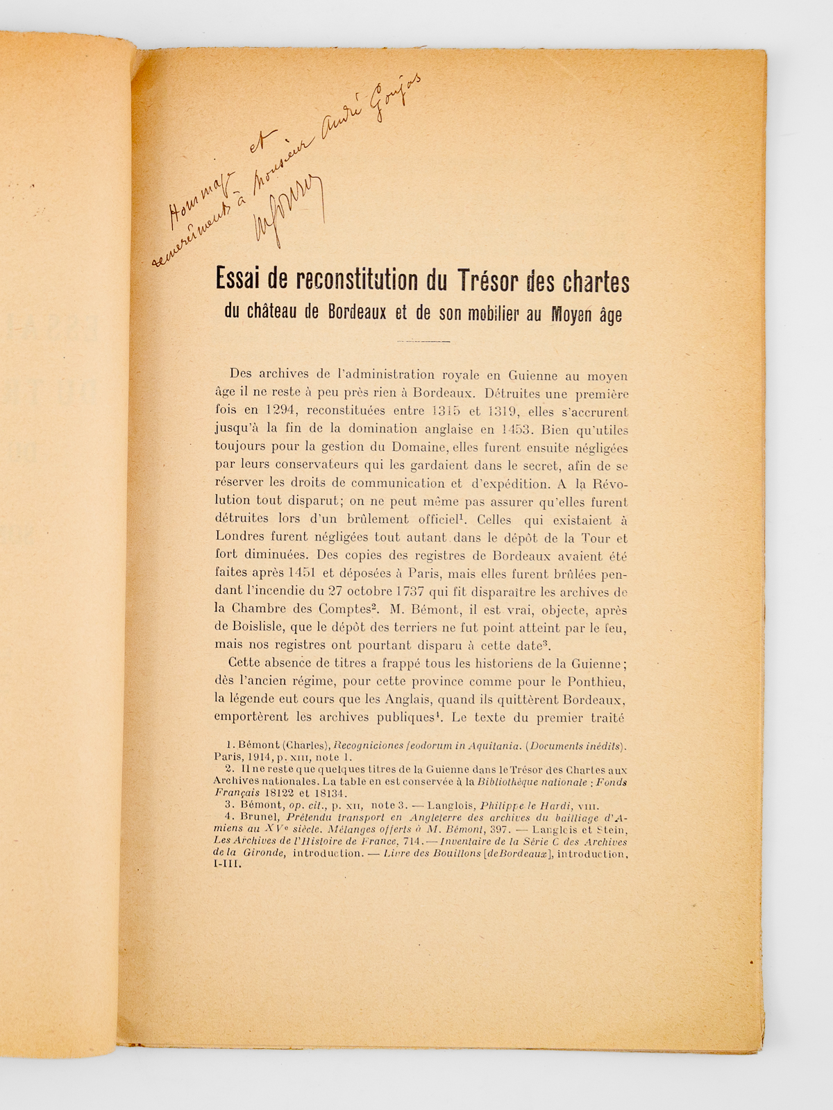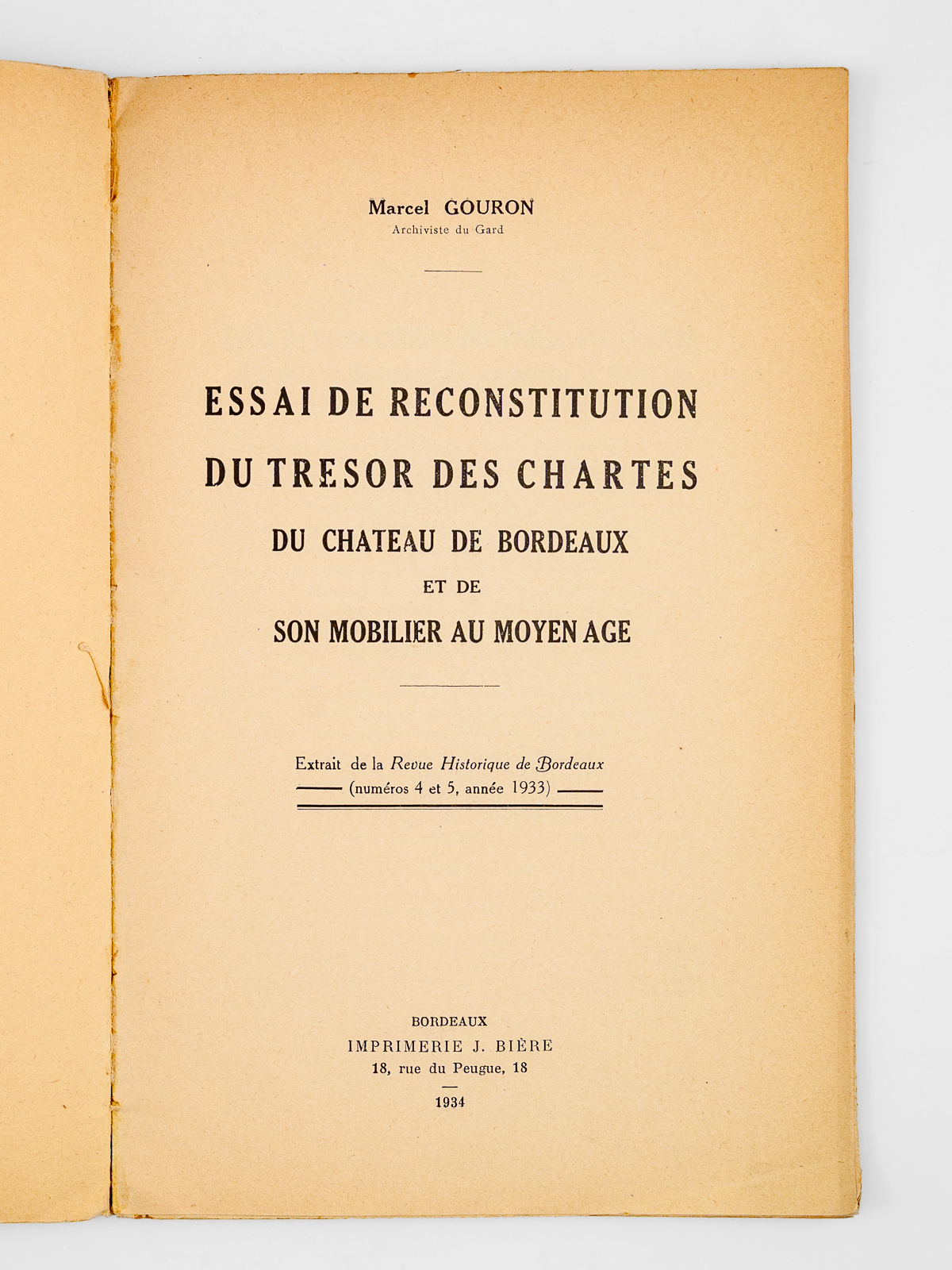 Essai de reconstitution du trésor des chartes du château de Bordeaux et de son mobilier au Moyen Age [ Livre dédicacé par l'auteur ] [ On joint : ] Ancien inventaire des cartulaires historiques de la Guienne - Auteur: GOURON, Marcel - Année d'édition: 1934
