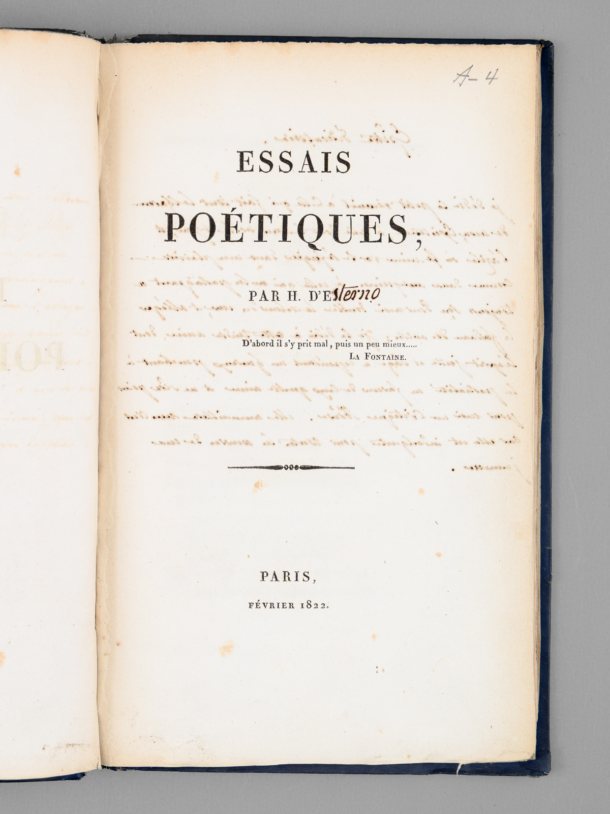 Essais Poétiques [ Edition originale - Avec une longue épître dédicatoire autographe ] - Auteur: D'E, H. ; [ D'ESTERNO, Ange Philippe Honoré marquis ] - Année d'édition: 1822 |