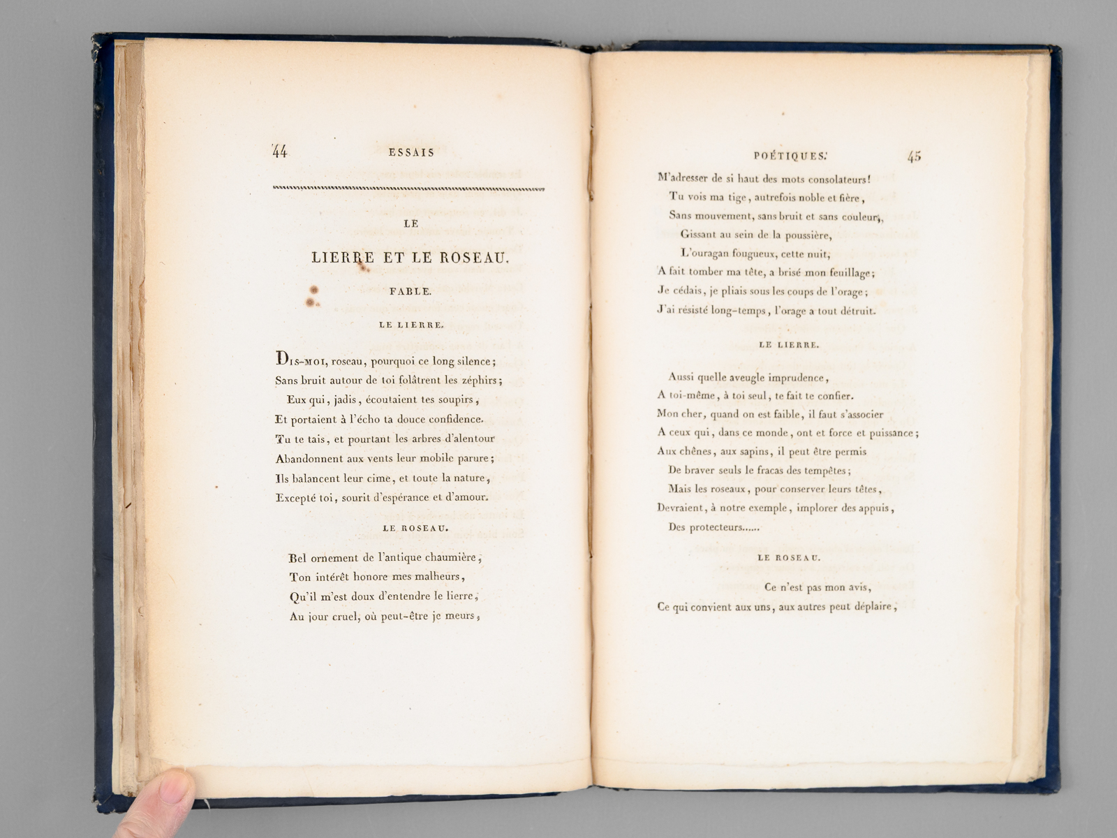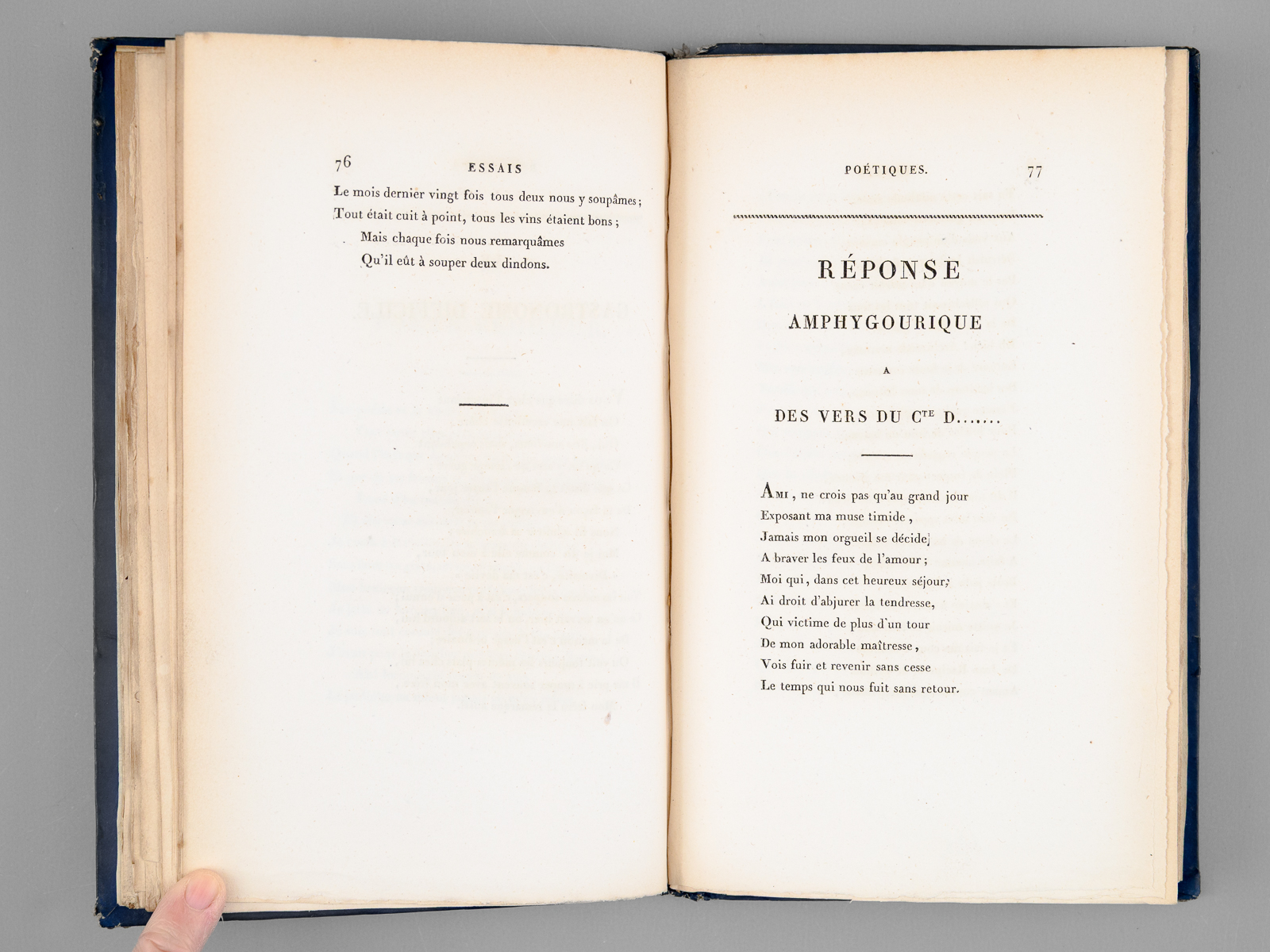Commentaire : L'exemplaire est enrichi d'une longue mention autographe non signée de l'auteur : 'Epitre dédicatoire. Je dédie ce petit recueil à celle qui fait tout le charme de mon existence, à celle dont le coeur noble et pur est l'asile où le mien va se réfugier dans mes plaisirs comme dans mes peines, à celle qui en les partageant a toujours su pour moi doubler la valeur des uns et alléger la faiblesse des autres ; je la dédie à cette tendre amie, dont l'esprit juste et sage a cependant un heureux penchant à la partialité en faveur de ceux qu'elle aime et ne sera point pour moi un critique sévère. Elle accueillera mes vers car elle est indulgente pour toutes les oeuvres de ma jeunesse'. Le présent ouvrage fait l'ouvrage d'un charmant chapitre dans le 'Bulletin du Bibliophile et du Bibliothécaire' de 1844 (pp. 878 s.) : 'Un des plus ardents désirs du bibliophile, et alors on peut très bien le classer parmi les bibliomanes, est de posséder des ouvrages tirés à petit nombre, uniques ou à peu près, et que le vulgaire des amateurs ne peut pas atteindre. L'utilité du livre recherché ne passe qu'après son originalité ou sa rareté [ .. ] On doit cependant dire à la décharge de la foiblesse des bibliophiles que ces livres rares qui attirent si bien leur attention , se distinguent ordinairement par une exécution soignée, aristocratique et recherchée, ce qui explique suffisamment la préférence que leur donne l'amateur délicat : ces livres n'étant pas destinés à être livrés au commerce, sont imprimés avec luxe, presque toujours sur papier vélin à marge grande et belle, et les pièces qu'ils contiennent dévoilent des noms illustres, qu'on ne voudroit pas livrer à une publicité mercantile et vulgaire, mais qu'on ne craint pas de confier à la discrétion d'un petit nombre de parents et amis. Telles sont les conditions d'existence' du présent ouvrage. L'auteur en est le Comte Honoré d'Esterno (1770-1823), dont le père fut longtemps ministre de France auprès de Frédéric II. 'Parent du duc de Vicence, il fut attaché de bonne heure à la cour napoléonienne et s'y fit remarquer par la grâce de ses manières et le brillant de son éducation. Il se distingua dans la carrière des armes ; il combattit avec les braves qui vainquirent à Austerlitz, à Iéna, à Friedland ; il étoit à Vienne en 1809, à Varsovie n 1812. Il eut le bonheur de résister au désastre de Moscou'. A la chute de Napoléon, il fut rapidement élu à la Chambre des Députés. 'Mais il ne resta pas longtemps à la Chambre, la mort l'enleva dans un âge peu avancé, en 1823. C'est l'année même qui précéda sa mort qu'il pensa à réunir ses pièces de poésies, composées pour la plupart à la cour de Napoléon, pour la comtesse d'Harville, sa parente, et imitées de l'anglois, langue qu'il possédoit aussi bien que l'allemand'. Bon état (coiffe sup. frottée, coupes lég. frottée, très bon état par ailleurs, ex-libris de Broglie Dampmartin).