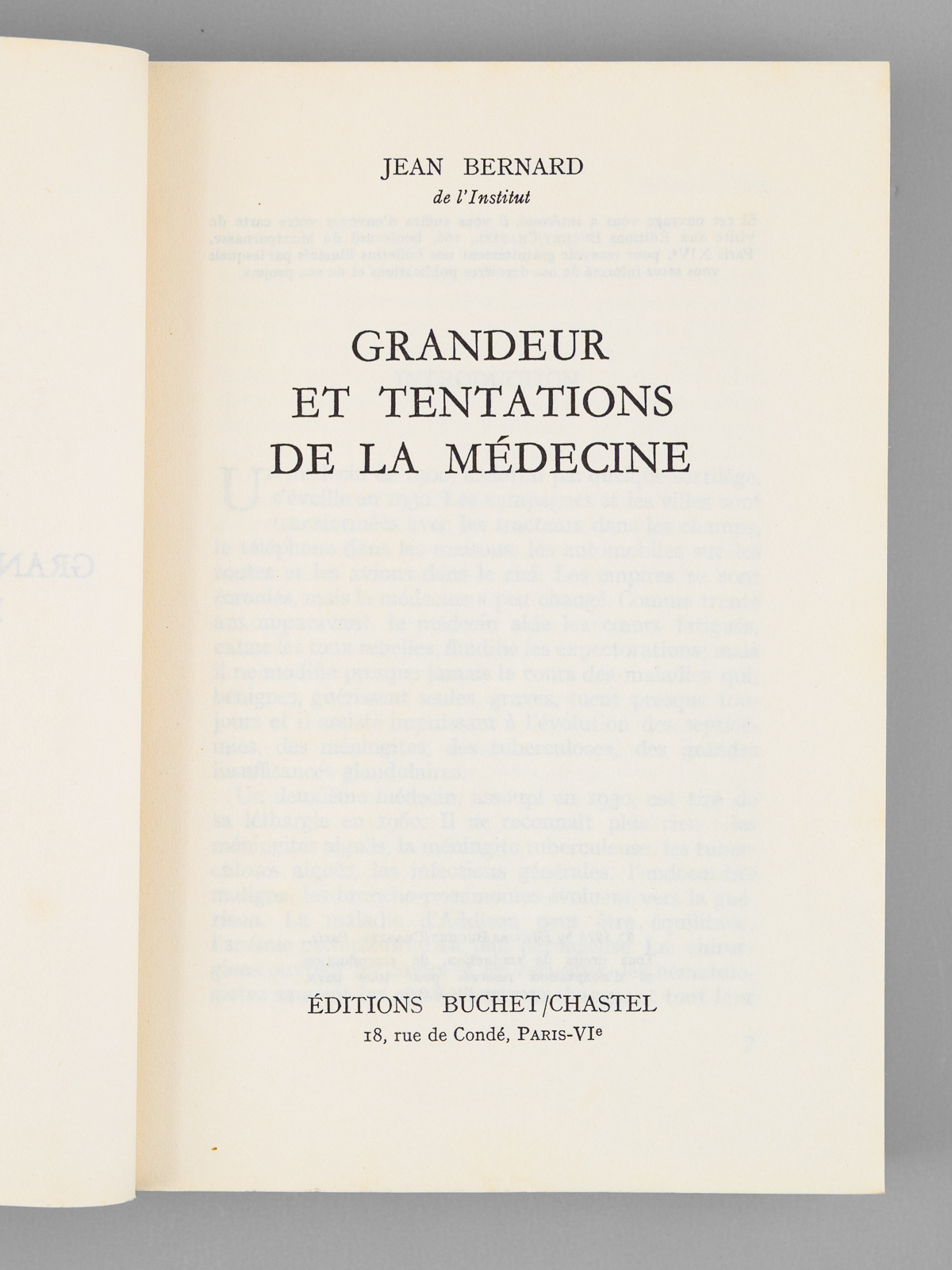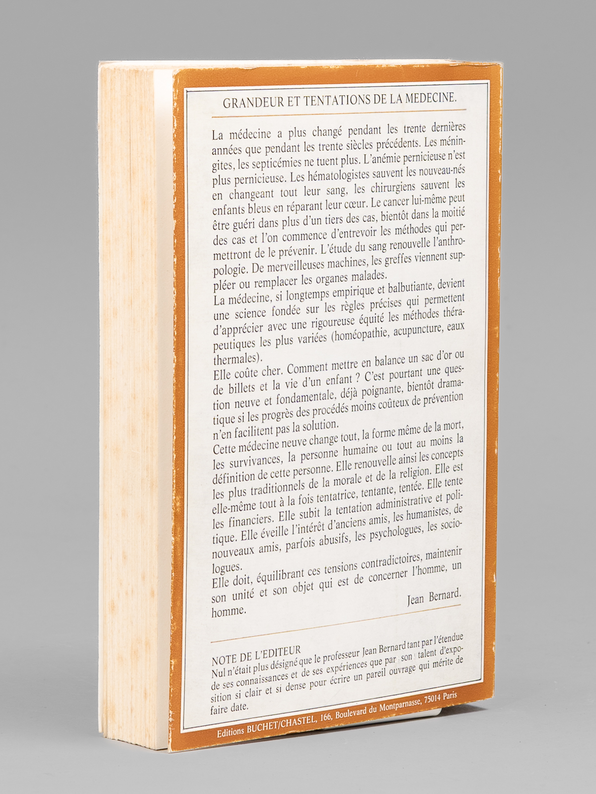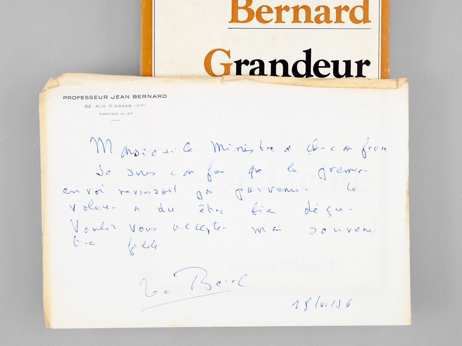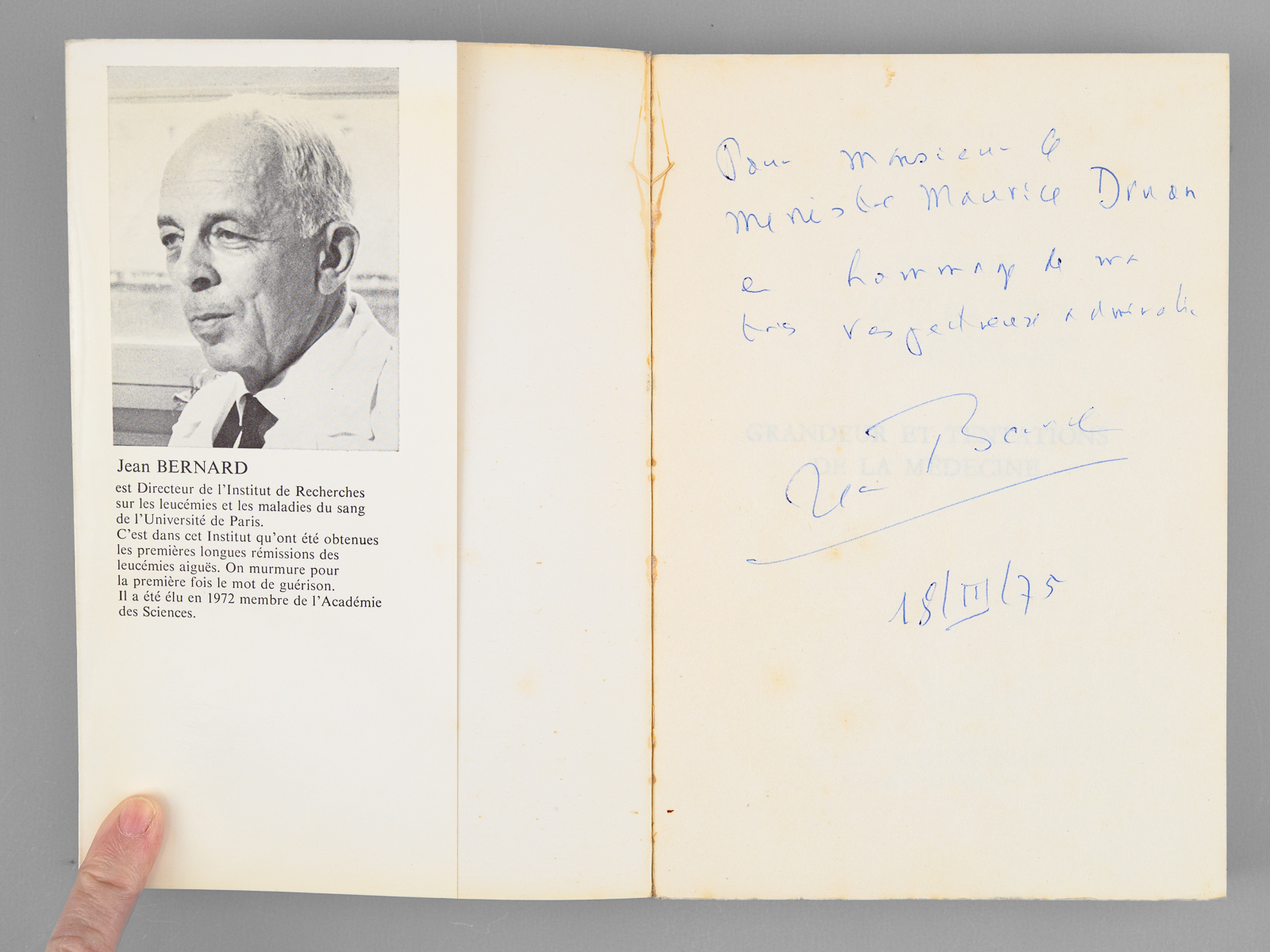 Envoi ms. de l'auteur, 1 vol. in-8 br., Buchet Chastel, Paris, 1973, 332 pp. Commentaire : Envoi et billet de l'auteur à Maurice Druon : 'Pour Monsieur le Ministre Maurice Druon, en hommage de ma très respectueuse admiration'. Dans le billet joint, Jean Bernard ajoute : 'Monsieur le Minisitre [..], Je suis confus que le premier envoi ne vous soit pas parvenu. Le voleur a dû être bien déçu. Voulez vous accepter mon souvenir très fidèle.' L'auteur et le dédicataire furent tous deux académiciens. Maurice Druon (1918-2009), auteur notamment de la célèbre saga historique des Rois maudits, fut élu à l'Académie Française en 1968. Il en devint le Secrétaire Perpétuel, de 1985 à 1999. L'auteur, quant à lui, fut élu à l'Académie Française en 1975, au fauteuil de Marcel Pagnol. Le professeur Jean Bernard, éminent hématologue et oncologue, présida le Comité National d'Ethique de 1983 à 1993. Etat très satisfaisant (lég. rousseurs sur tr., bon état par ailleurs) pour cette exemplaire d'une origine prestigieuse.