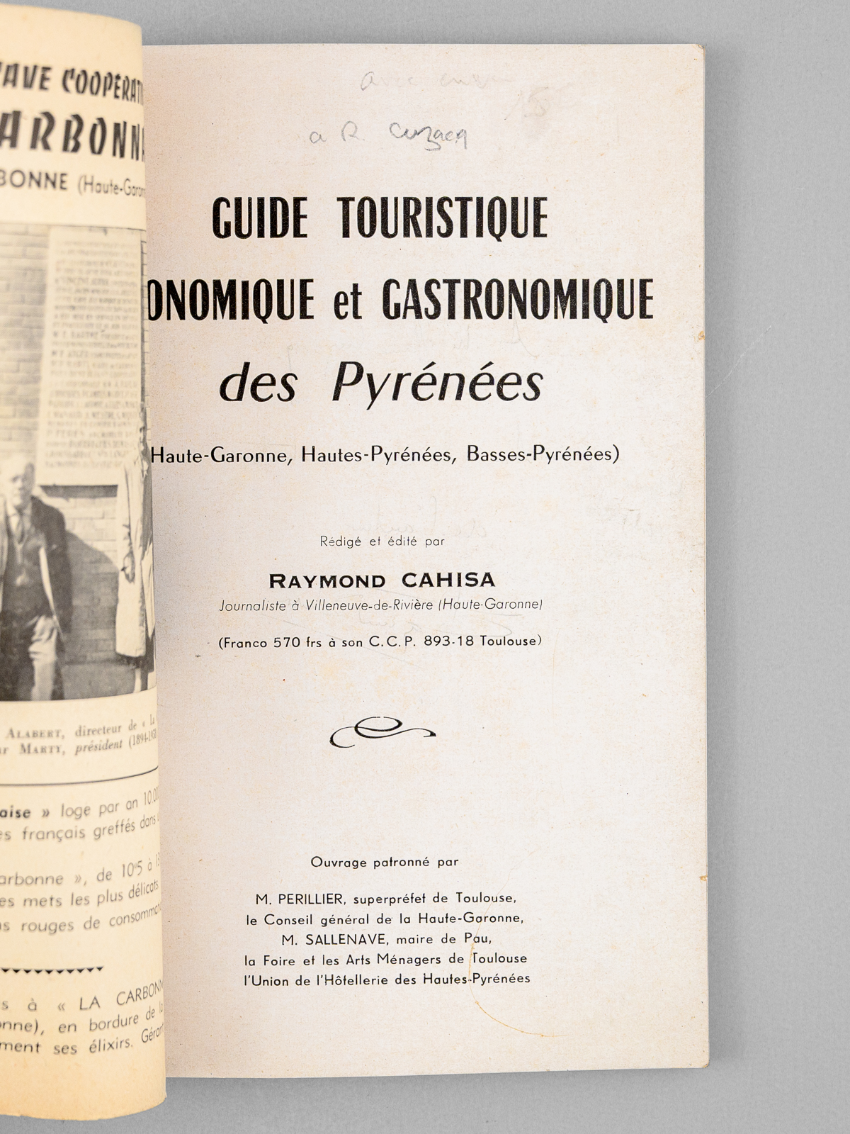 Rédigé et édité par Raymond Cahisa, journaliste à Villeneuve-de-Rivière (Haute-Garonne), 1 vol. in-8 br., Ouvrage patronné par M. Perillier, M. Sallenave et l'Union de l'Hôtellerie, , s.l.n.d. [ circa 1958 ], 128 pp.