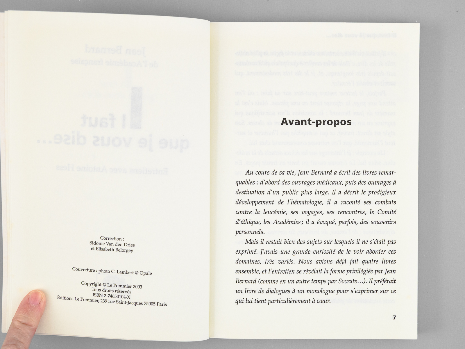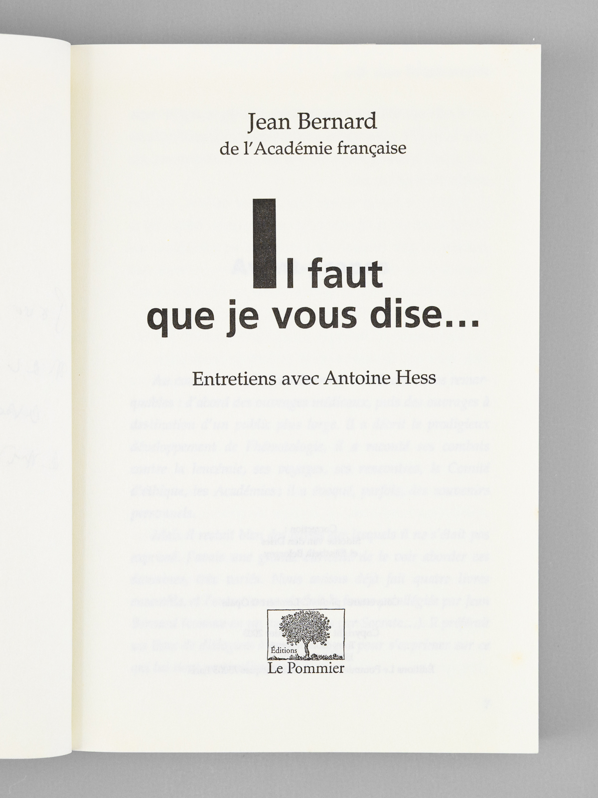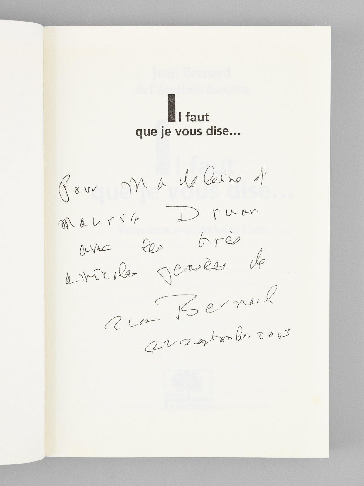 Il faut que je vous dise. Entretiens avec Antoine Hess [ Livre signé par l'auteur - Envoi à Maurice Druon ] - Auteur: BERNARD, Jean (1907-2006) - Année d'édition: 2003