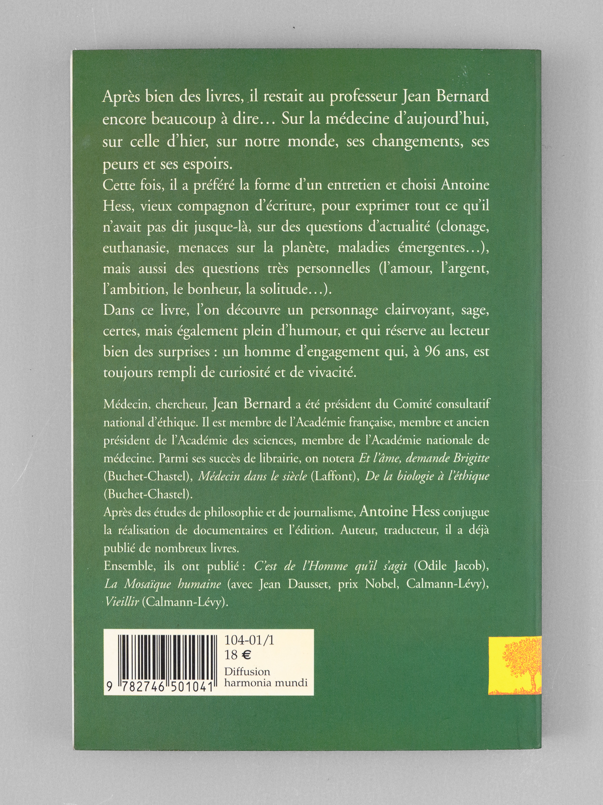 Envoi ms. de l'auteur, 1 vol. in-8 br., éditions Le Pommier, Paris, 2003, 180 pp. Commentaire : Envoi de l'auteur à Maurice Druon et à son épouse: 'Pour Madeleine et Maurice Druon, avec les amicales pensées de Jean Bernard'. L'auteur et le dédicataire étaient tous deux académiciens. Maurice Druon (1918-2009), auteur notamment de la célèbre saga historique des Rois maudits, fut élu à l'Académie Française en 1968. Il en devint le Secrétaire Perpétuel, de 1985 à 1999. L'auteur, quant à lui, fut élu à l'Académie Française en 1975, au fauteuil de Marcel Pagnol. Le professeur Jean Bernard, éminent hématologue et oncologue, présida le Comité National d'Ethique de 1983 à 1993. Etat très satisfaisant (lég. rouss. sur tr. sup., bon état par ailleurs) pour cet exemplaire d'une origine prestigieuse.