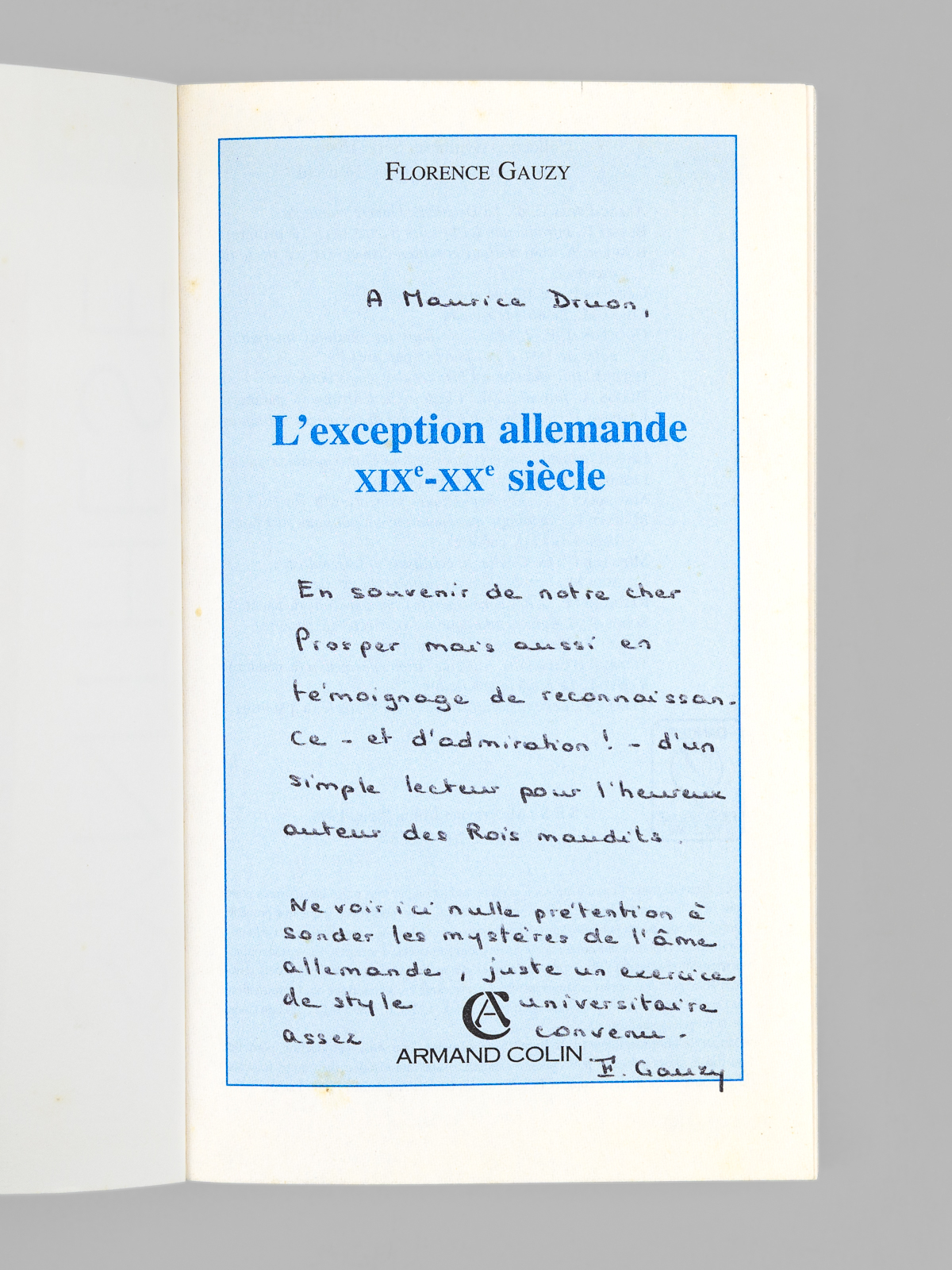 Commentaire : Bon état pour cet exemplaire avec une belle dédicace : 'Pour Maurice Druon, en souvenir de notre cher Prosper mais aussi en témoignage de reconnaissance - et d'admiration! - d'un simple lecteur pour l'heureux auteur des Rois Maudits. Ne voir ici aucune prétention à sonder les mystères de l'âme allemande, juste un exercice de style universitaire assez convenu.' De la bibliothèque du grand écrivain et auteur des 'Rois Maudits', Maurice Druon (1918-2009), Secrétaire Perpétuel de l'Académie Française de 1985 à 1999 et immortel auteur avec son oncle Joseph Kessel du texte du 'Chant des Partisans'.