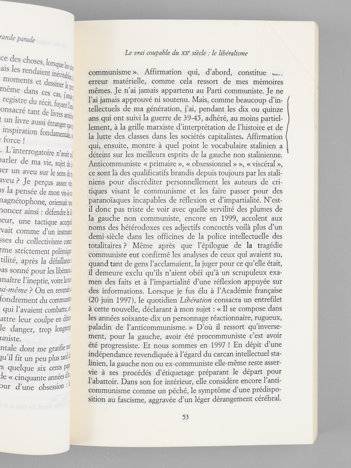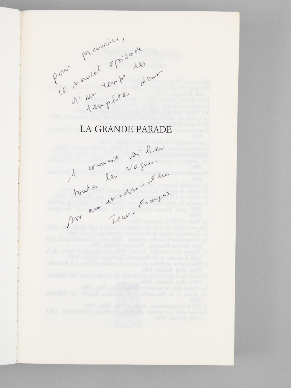 1 vol. in-8 br. , Plon, Paris, 2000, 342 pp. Commentaire : Bel envoi de l'auteur à Maurice Druon : 'Pour Maurice, Ce nouvel épisode d'un temps de tempêtes, dont il connut si bien toutes les vagues. Son ami et admirateur.' Etat très satisfaisant (lég. rousseurs sur tr., bon état par ailleurs). L'auteur et le dédicataire étaient tous deux académiciens. Maurice Druon (1918-2009), auteur notamment de la célèbre saga historique des Rois maudits, avait été élu à l'Académie Française en 1968, et en devint le secrétaire perpétuel, de 1985 à 1999. Jean-François Revel, quant à lui, avait été élu en 1997.