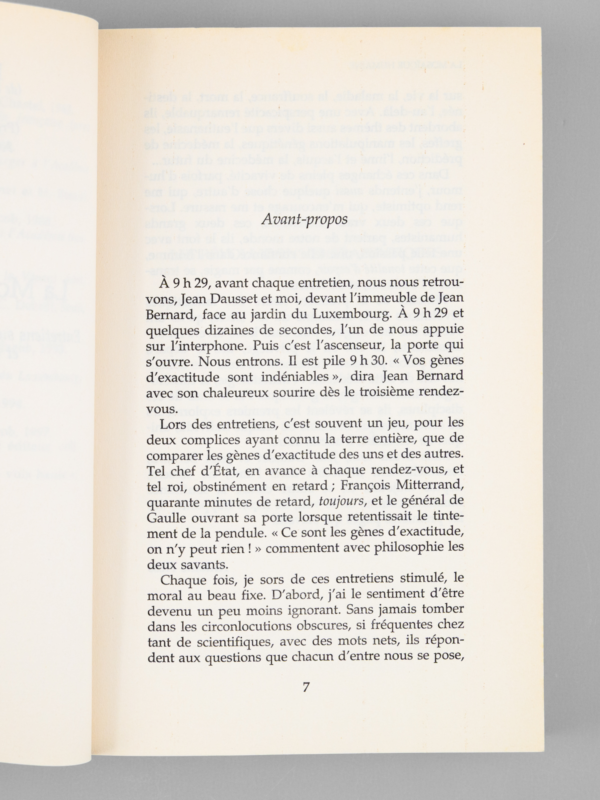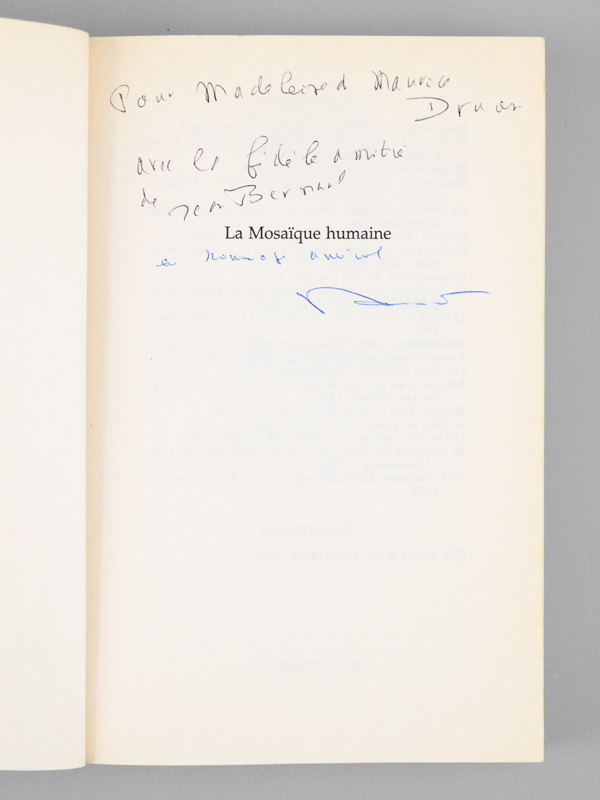 Envoi ms. des auteurs, 1 vol. in-8 br., Calmann-Lévy, Paris, 2000, 305 pp. Commentaire : Envoi de l'auteur à Maurice Druon et à son épouse: 'Pour Madeleine et Maurice Druon, avec la fidèle amitié de Jean Bernard. En hommage amical [ signé Jean Dausset ]'. Jean Bernard et le dédicataire étaient tous deux académiciens. Maurice Druon (1918-2009), auteur notamment de la célèbre saga historique des Rois maudits, fut élu à l'Académie Française en 1968. Il en devint le Secrétaire Perpétuel, de 1985 à 1999. L'auteur, quant à lui, fut élu à l'Académie Française en 1975, au fauteuil de Marcel Pagnol. Le professeur Jean Bernard, éminent hématologue et oncologue, présida le Comité National d'Ethique de 1983 à 1993. Etat très satisfaisant (lég. rouss. sur tranches, bon état par ailleurs) pour cet exemplaire d'une origine prestigieuse.