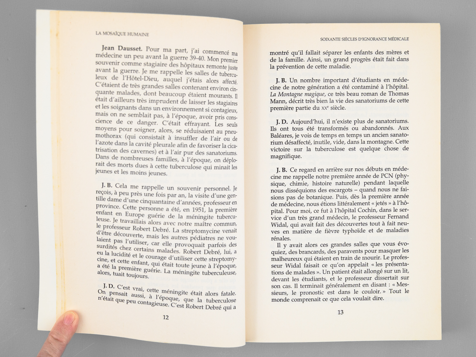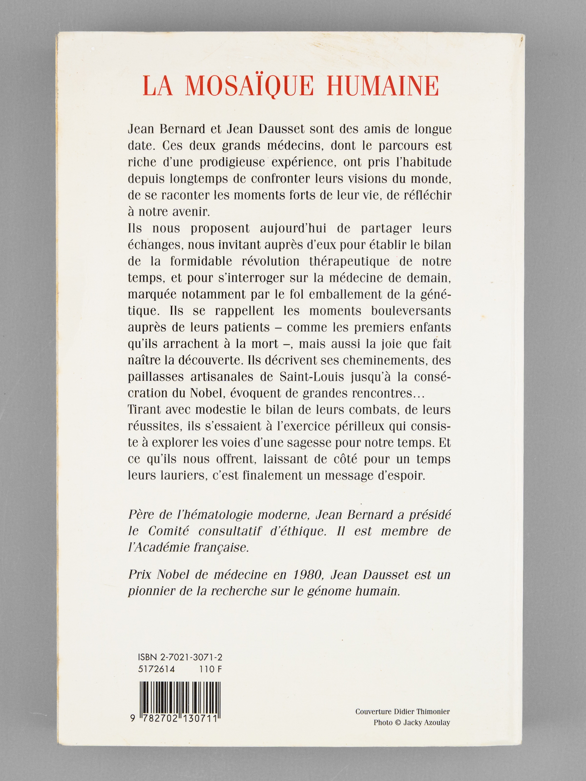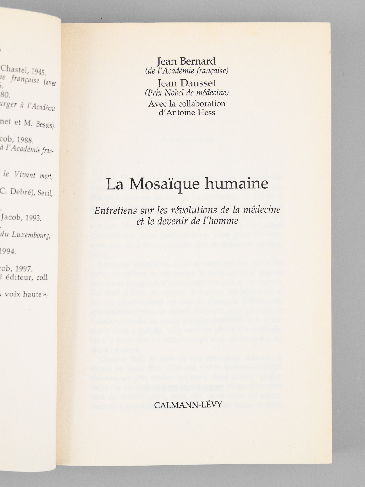 La mosaïque humaine. Entretiens sur les révolutions de la médecine et le devenir de l'homme. Avec la collaboration de Antoine Hess [ Livre signé par l'auteur - Envoi à Maurice Druon ] - Auteur: BERNARD, Jean (1907-2006); DAUSSET, Jean - Année d'édition: 2000
