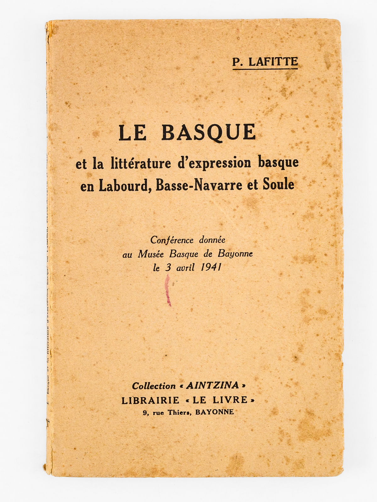 Le Basque et la littérature d'expression basque en Labourd, Basse-Navarre et Soule. Conférence donnée au Musée basque de Bayonne le 3 avril 1941 [ Edition originale - Livre dédicacé par l'auteur ] - Auteur: LAFITTE, P. - Année d'édition: 1941