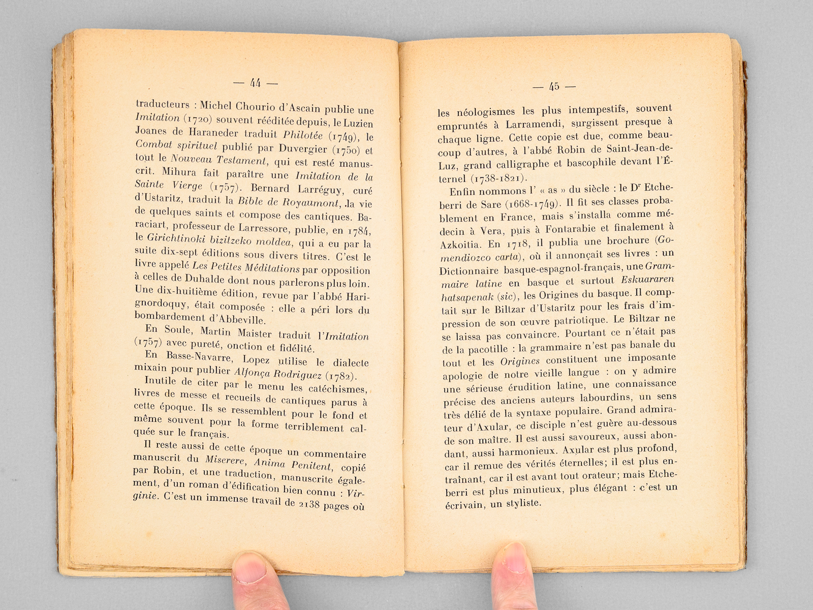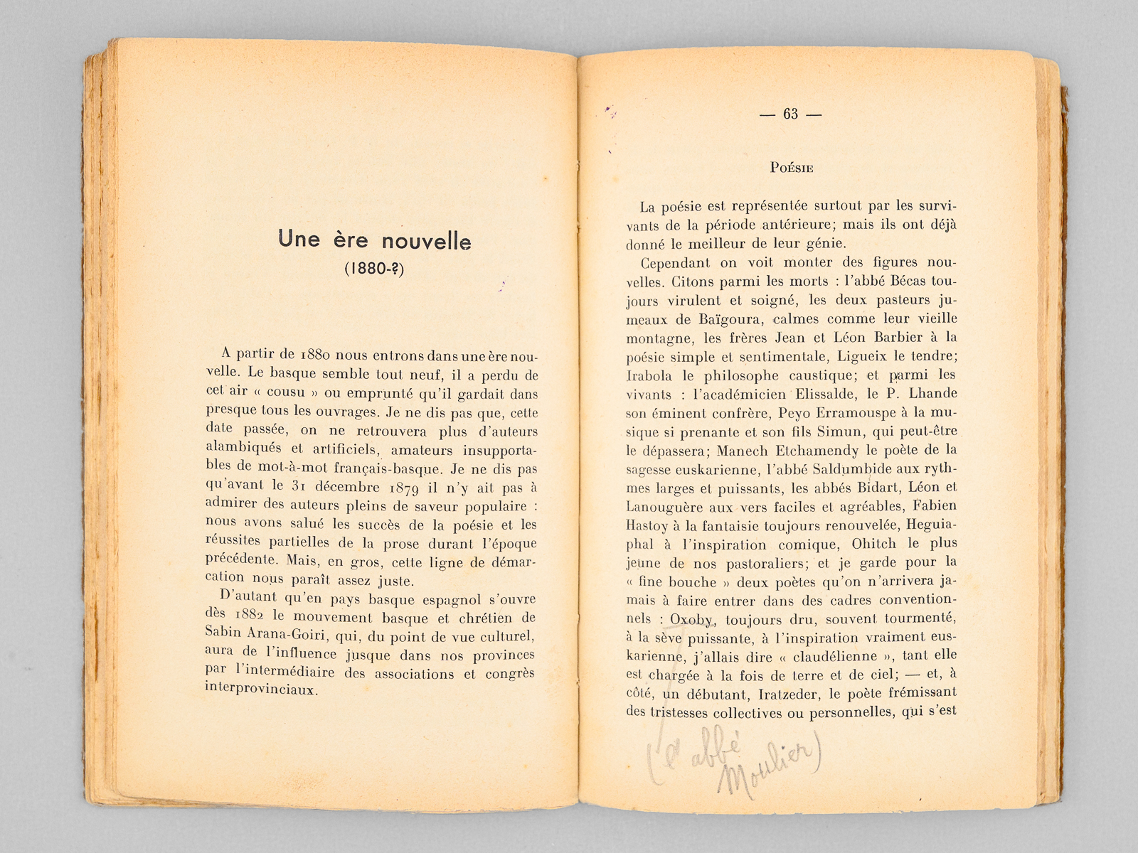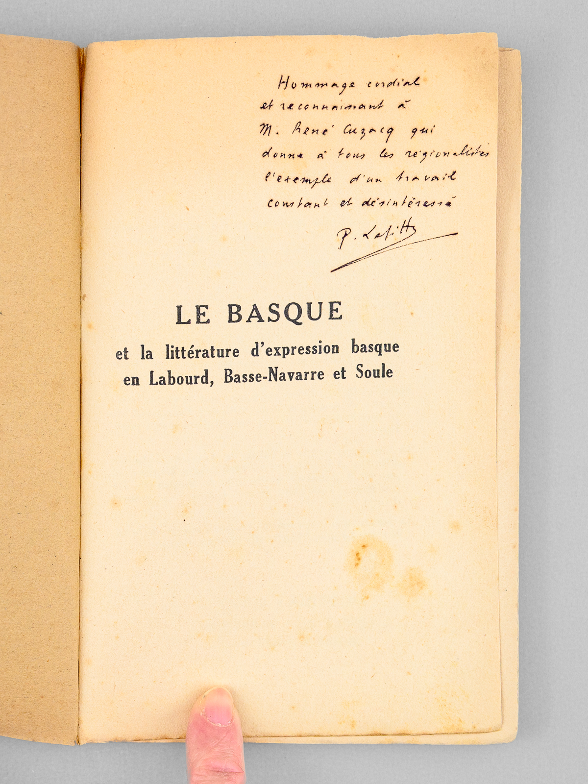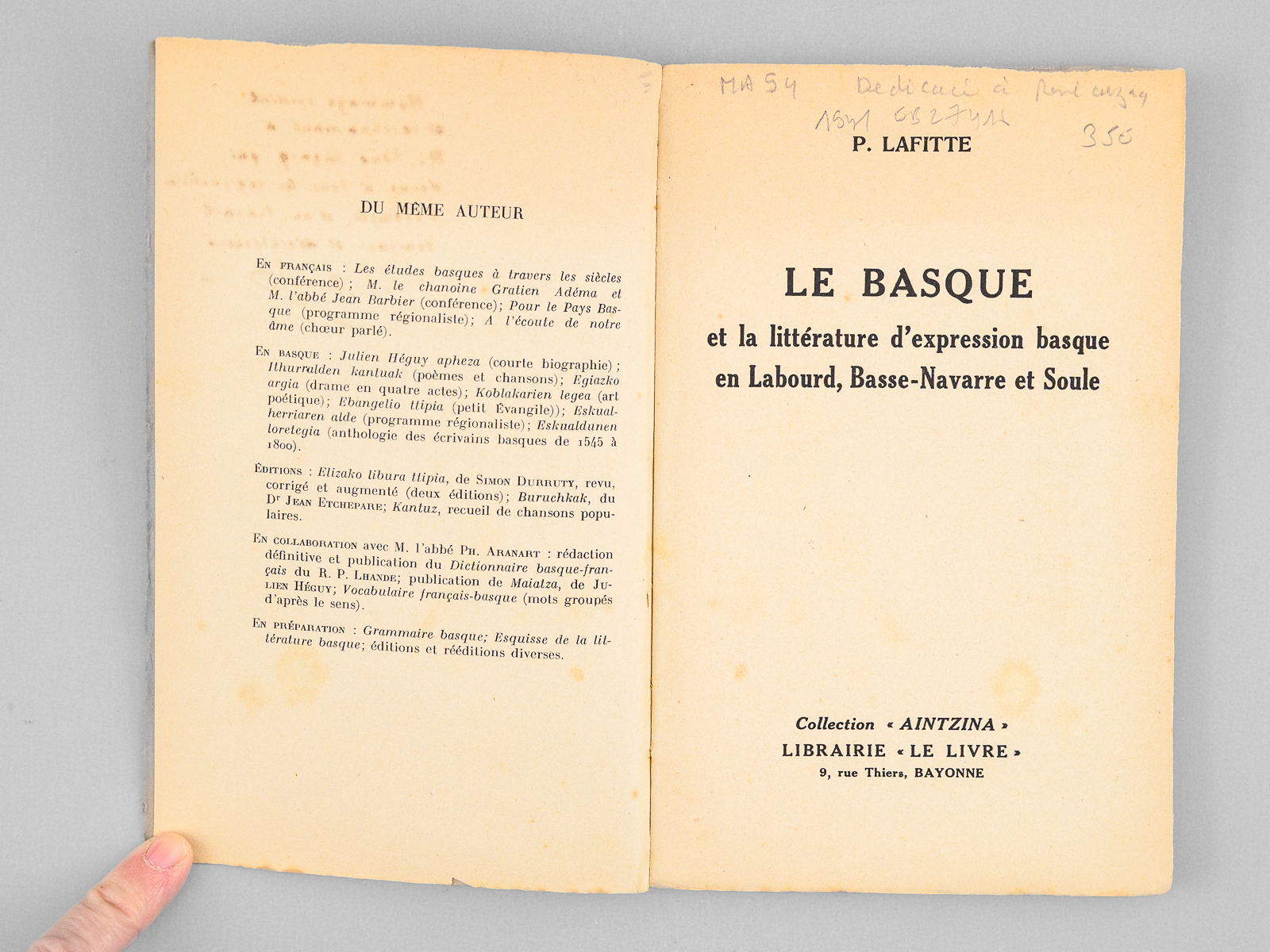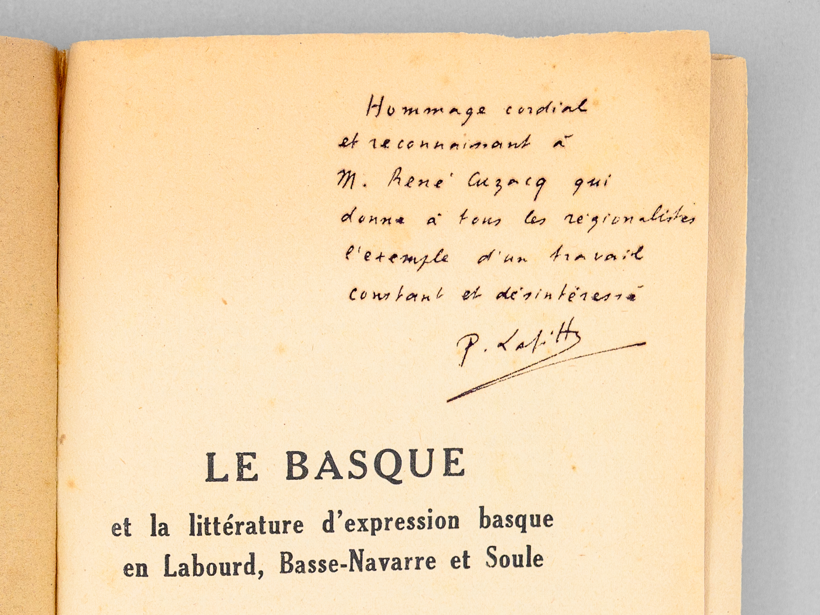 1 vol. in-12 br., Collection « Aintzina », Librairie « Le Livre », Bayonne, s.d. [1941 ] 96 pp. Commentaire : Bel envoi de l'auteur en 'hommage cordial et reconnaissant à M. René Cuzacq qui donne à tous les régionalistes l'exemple d'un travail constant et désintéressé'. René Cuzacq était professeur au lycée de Bayonne. Etat très satisfaisant (couv. un peu frottée).