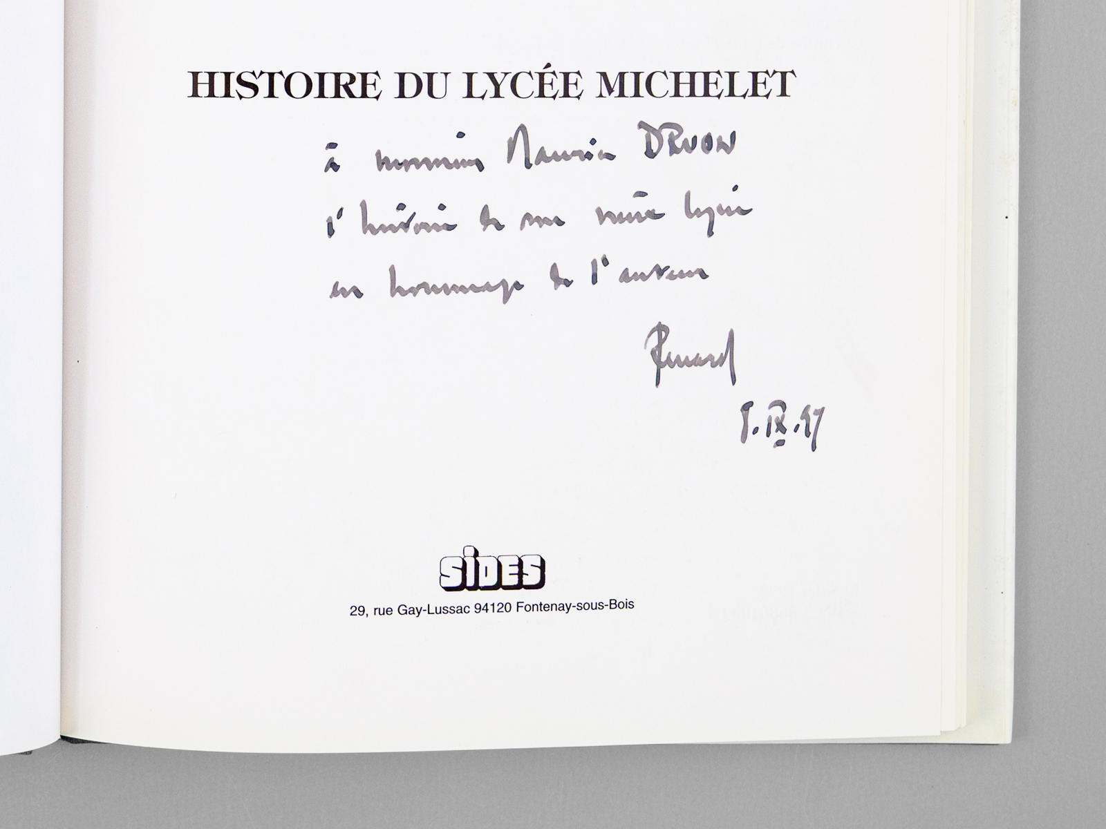 1 vol. in-8 reliure pleine toile bleue sous jaquette illustrée, Sides, Fontenay-sous-Bois, 1997 Commentaire : Envoi de l'auteur 'à Monsieur Maurice Druon l'histoire de son vieux lycée'. Superbe provenance : de la bibliothèque de Maurice Druon, alors Secrétaire Perpétuel de l'Académie Française, qui a signalé de 2 feuillets à en-tête de l'Académie Française les mentions de sa présence au Lycée Michelet de 1931 à 1937 (il sera lauréat du Concours Général en 1936).