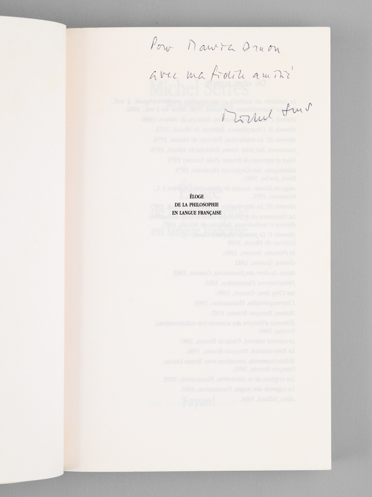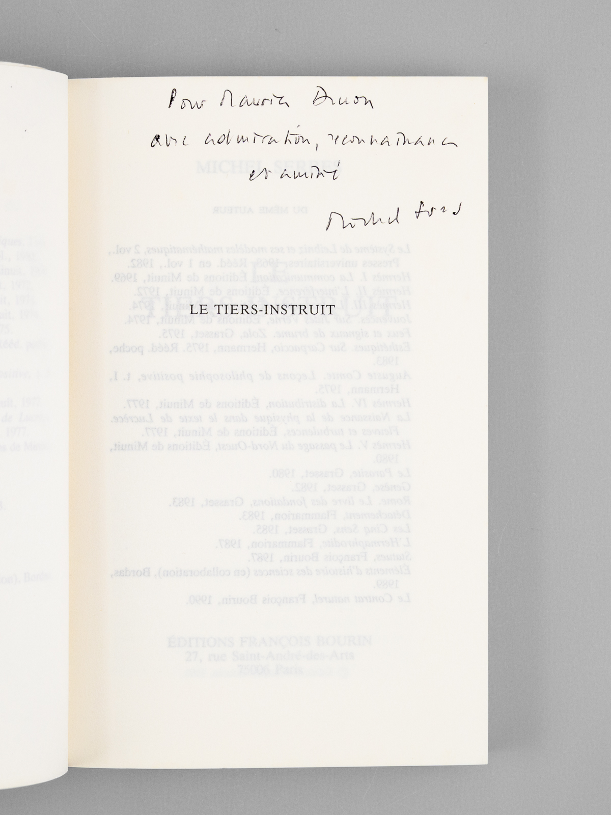 Envois ms. de l'auteur, 3 vol. in-8 br., François Bourin, Fayard, Paris, 1990, 1991 et 1995, 191, 249 et 276 pp. Commentaire : Etat très satisfaisant (lég. rouss. sur tr. sup., bon état par ailleurs), pour ces exemplaires avec de belles dédicaces à l'Académicien Maurice Druon : 'Pour Maurice Druon, avec admiration et amitié. Mille mercis pour votre accueil si chaleureux.' 'Pour Maurice Druon, avec mon remerciement pour ses bon livres et son amitié. Respectueusement.' 'Pour Maurice Druon, avec ma fidèle amitié'. Maurice Druon, qui était neveu de Joseph Kessel, fut résistant, écrivain auteur notamment de la saga historique des Rois maudits, et homme politique. Elu à l'Académie Française en 1968, il en devint le Secrétaire Perpétuel en 1985. Michel Serres fut quant à lui élu à l'Académie Française en 1990, qui qui explique certainement la teneur du premier envoi.
