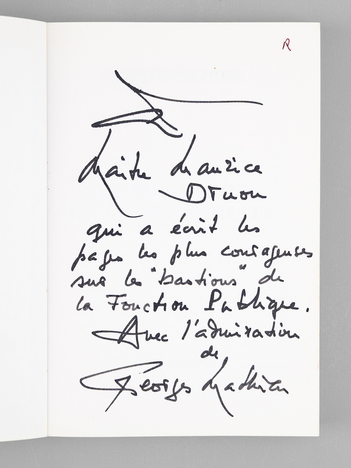 Commentaire : Bel envoi de Georges Mathieu 'A Maître Maurice Druon qui a écrit les pages les plus courageuses sur les 'bastions' de la Fonction Publique, avec l'admiration de Georges Mathieu'. Belle provenance : de la bibliothèque de Maurice Druon, futur Secrétaire Perpétuel de l'Académie Française, qui, conformément à son habitude, a plié l'angle des feuillets contenant des passages de l'ouvrage qui avaient retenu plus particulièrement son attention.