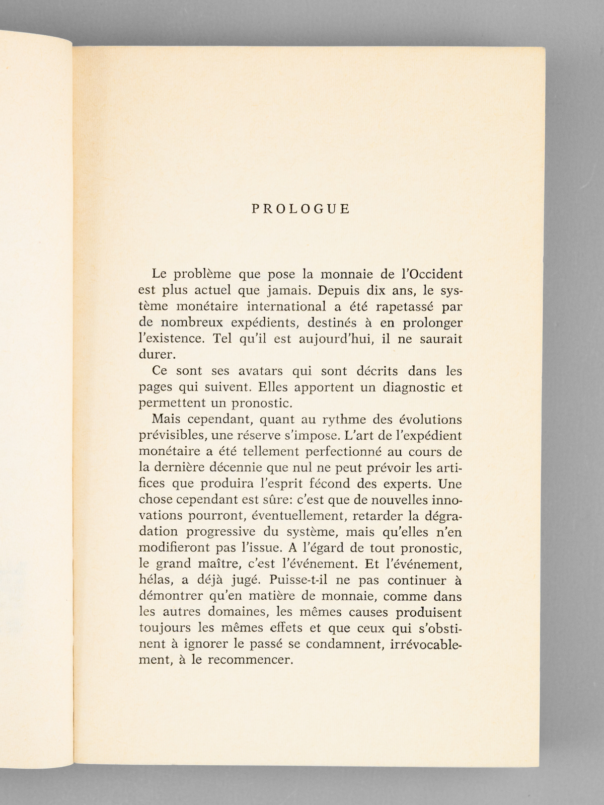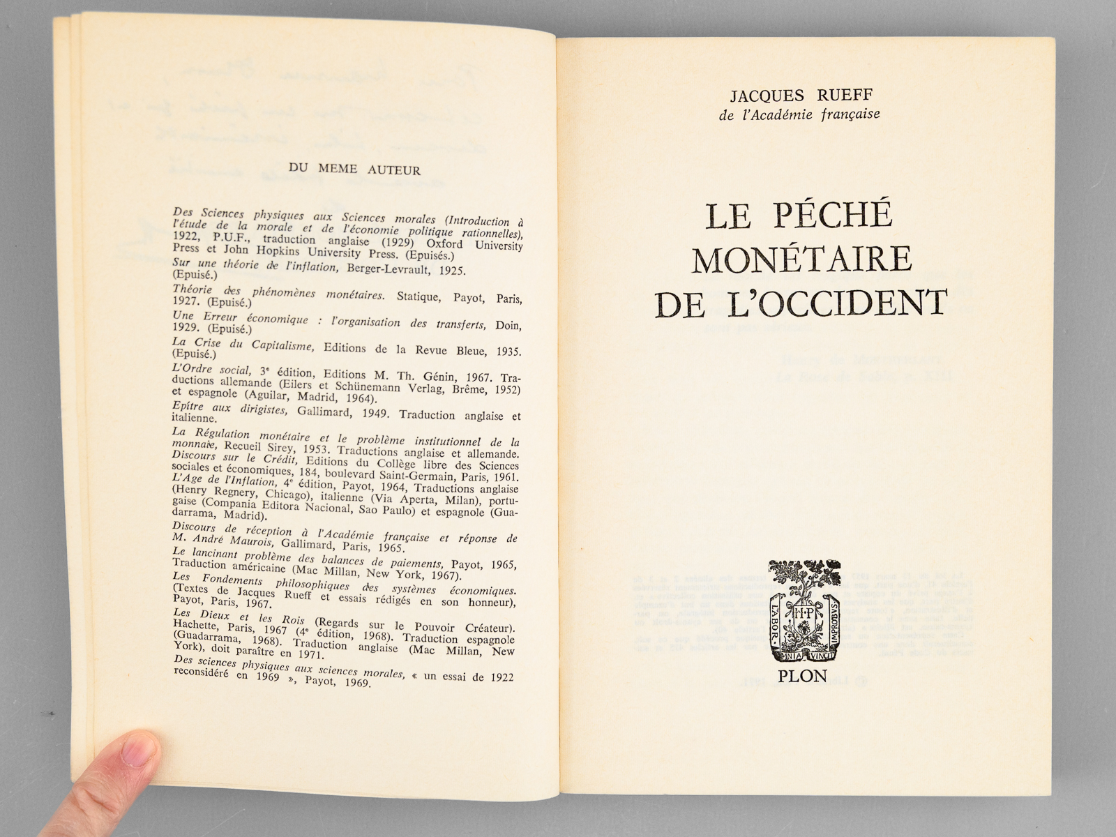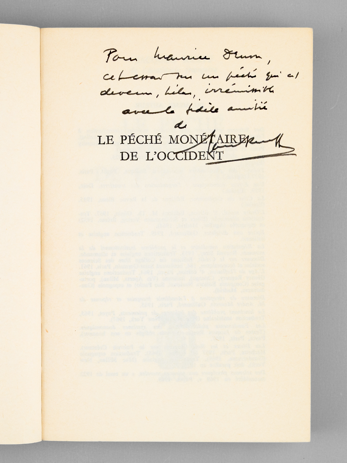 Envoi ms. de l'auteur, 1 vol. in-12 br., Plon, Paris, 1971, 285 pp. Commentaire : Avec un bel envoi : 'Pour Maurice Druon, cet essai sur un péché qui est devenu, hélas, irréverssible. Avec la fidèle amitié de Jacques Rueff'. Maurice Druon (1918-2009), neveu de Joseph Kessel, fut résistant, écrivain auteur notamment de la saga des Rois maudits, homme politique. Elu à l'Académie Française en 1968, il en devint le Secrétaire Perpétuel en 1985. Jacques Rueff, quant à lui, avait été élu à l'Académie en 1964. Etat très satisfaisant (rares annotations en marge par Maurice Druon) pour cet exemplaire d'une origine prestigieuse.
