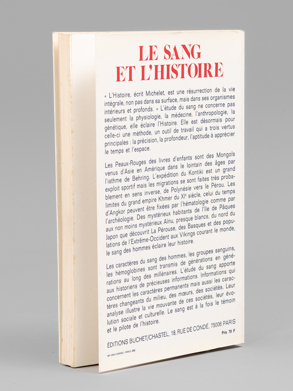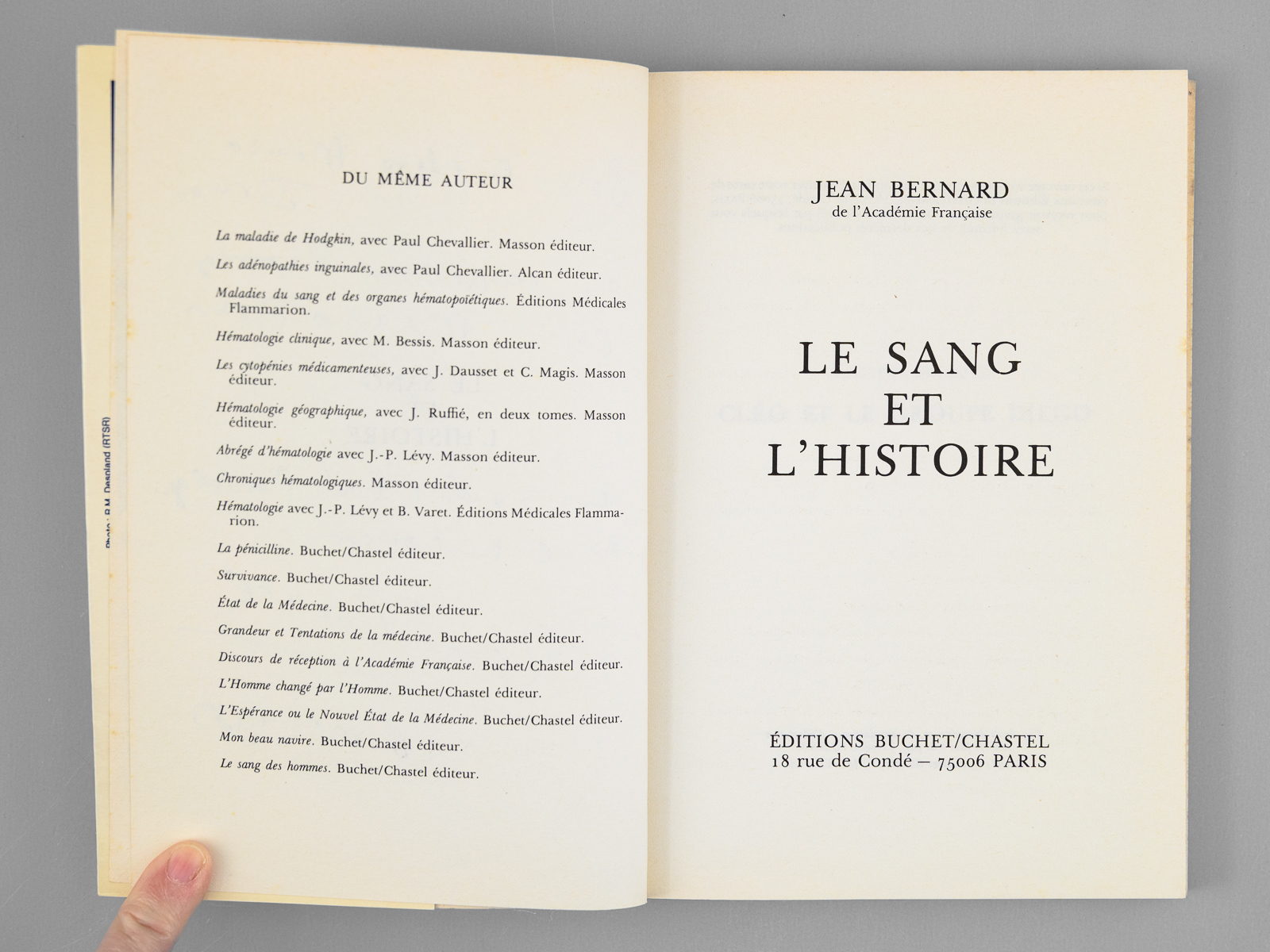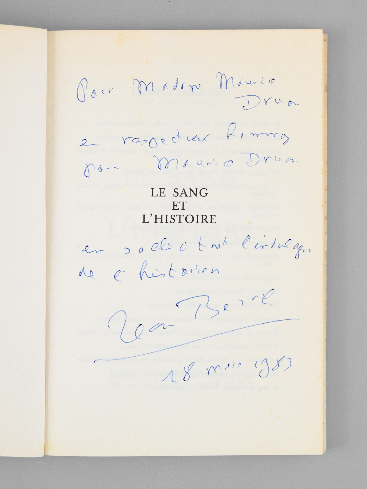 Envoi ms. de l'auteur, 1 vol. in-8 br., Buchet Chastel, Paris, 1983, 156 pp. Commentaire : Envoi de l'auteur à Maurice Druon et à son épouse: 'Pour Madame Maurice Druon, en respectueux hommage pour Maurice Druon, en sollicitant toute l'indulgence de l'historien'. L'auteur et le dédicataire étaient tous deux académiciens. Maurice Druon (1918-2009), auteur notamment de la célèbre saga historique des Rois maudits, fut élu à l'Académie Française en 1968. Il en devint le Secrétaire Perpétuel, de 1985 à 1999. L'auteur, quant à lui, fut élu à l'Académie Française en 1975, au fauteuil de Marcel Pagnol. Le professeur Jean Bernard, éminent hématologue et oncologue, présida le Comité National d'Ethique de 1983 à 1993. Etat très satisfaisant (lég. rouss. sur tr. sup., bon état par ailleurs) pour cette exemplaire d'une origine prestigieuse.