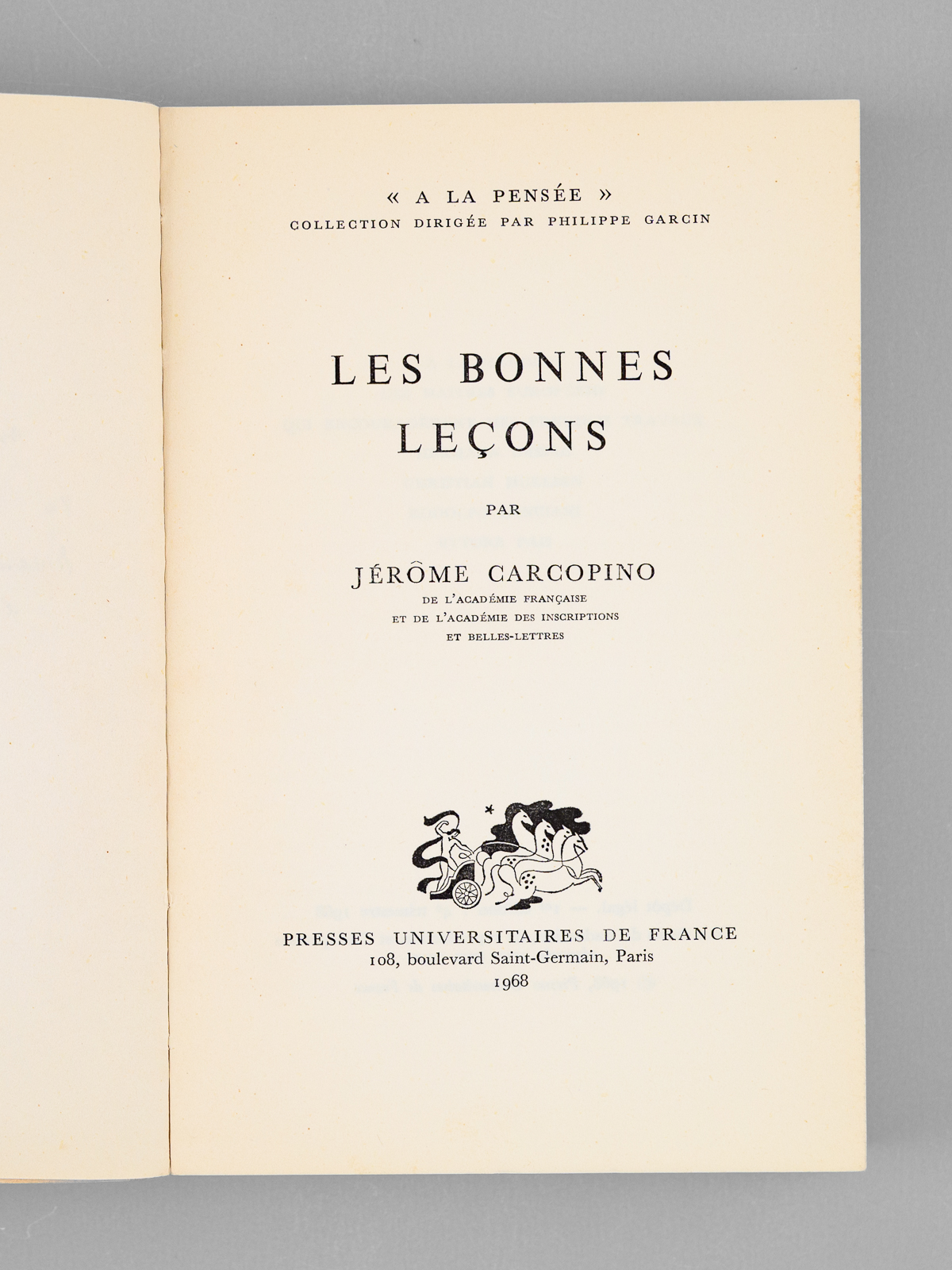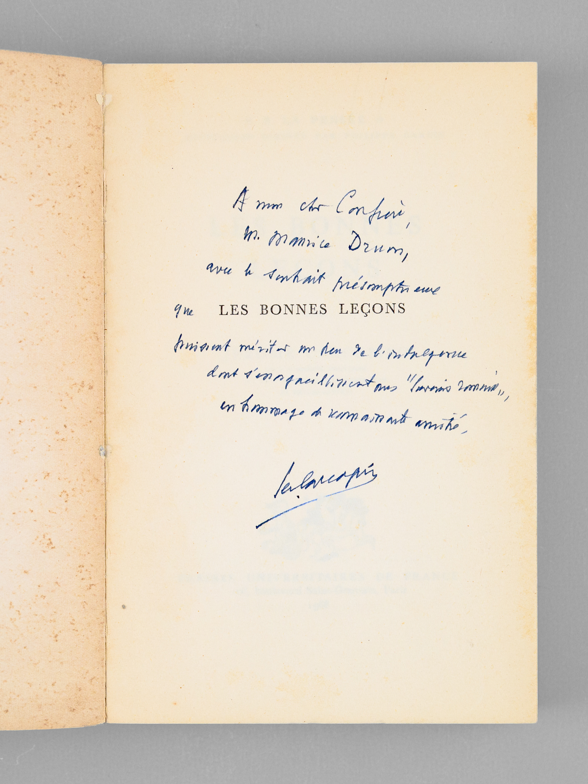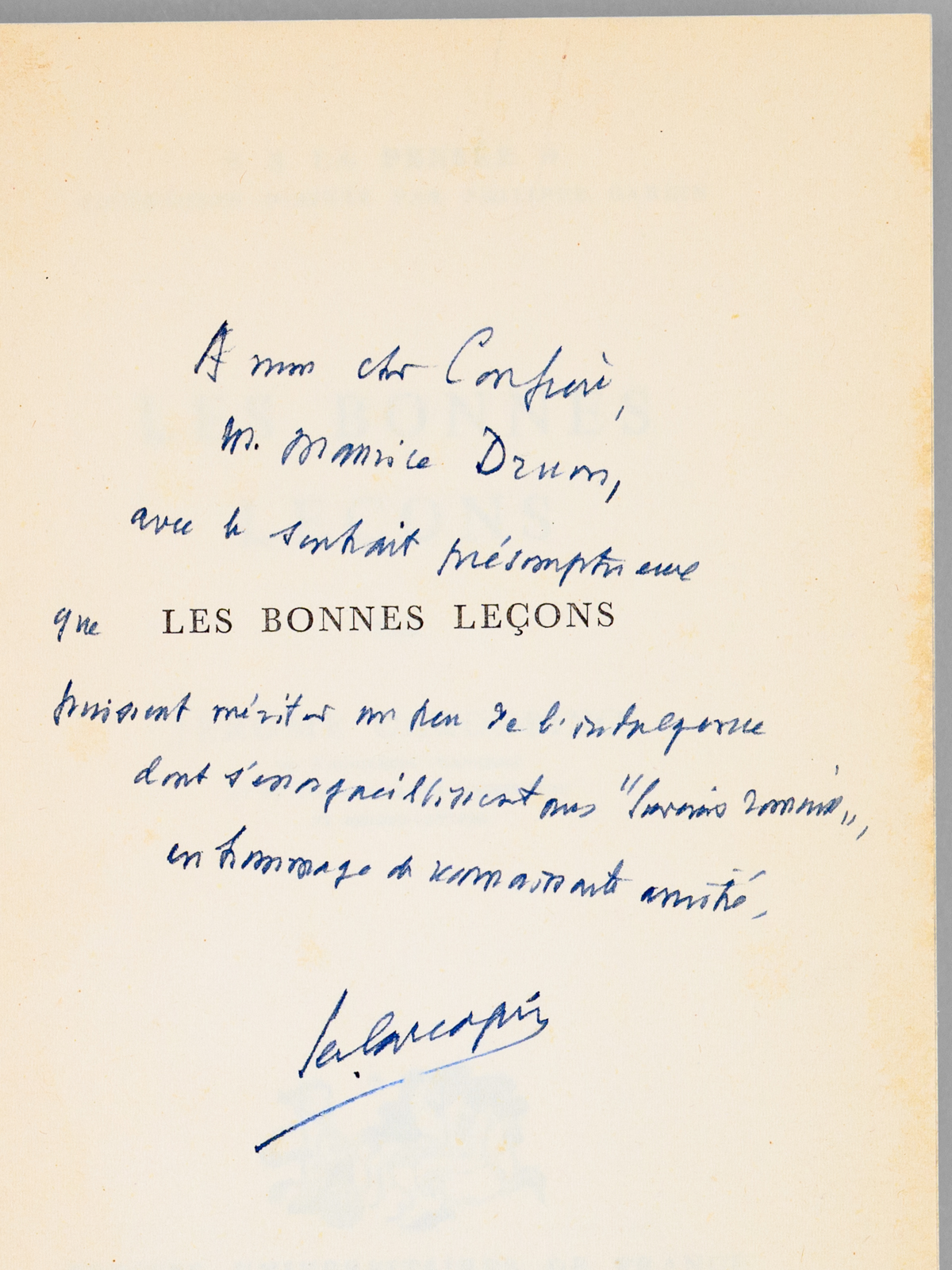 Commentaire : Bel envoi de Jérôme Carcopino 'A mon Cher Confrère, M. Maurice Druon, avec le souhait présomptueux que 'Les Bonnes Leçons' puissent mériter un peu de l'indulgence dont s'enorgueillissent nos 'Souvenirs Romains', en hommage de reconnaissante amitié'. Elu à l'Académie Française en 1956, Jérôme Carcopino y avait accueillit en 1966 Maurice Druon, futur Secrétaire Perpétuel. Bon état