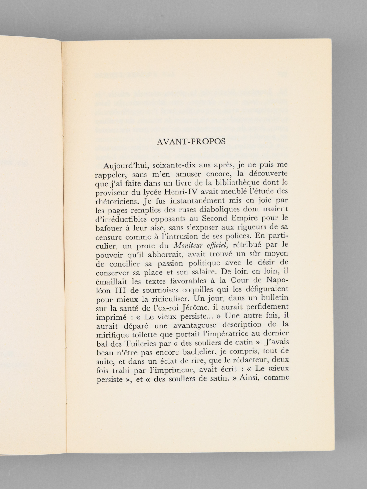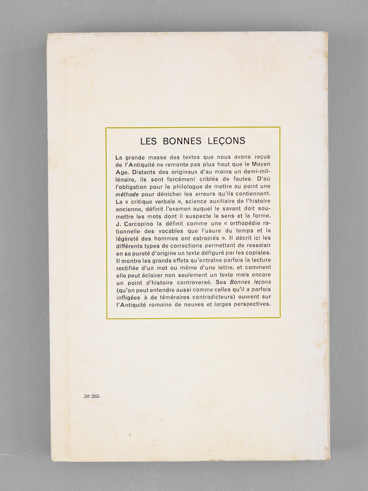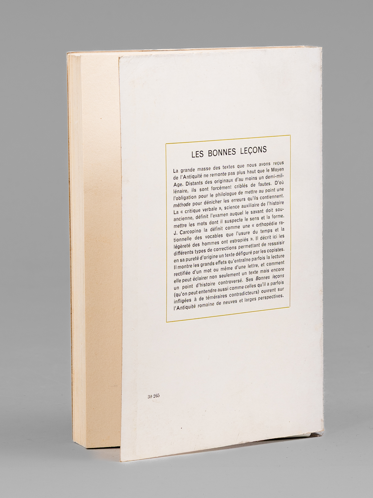 Commentaire : Bel envoi de Jérôme Carcopino 'A mon Cher Confrère, M. Maurice Druon, avec le souhait présomptueux que 'Les Bonnes Leçons' puissent mériter un peu de l'indulgence dont s'enorgueillissent nos 'Souvenirs Romains', en hommage de reconnaissante amitié'. Elu à l'Académie Française en 1956, Jérôme Carcopino y avait accueillit en 1966 Maurice Druon, futur Secrétaire Perpétuel. Bon état