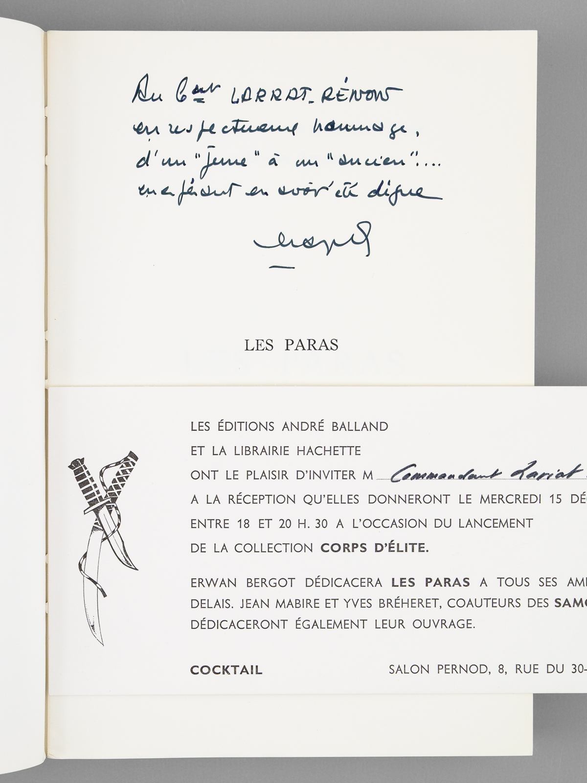Commentaire : Bel envoi d'Erwan Bergot 'au Commandant L...R... en respectueux hommage d'une 'jeune' à un 'ancien'.. en espérant en avoir été digne'. Bon état. L'ouvrage est accompagné du carton d'invitation de l'éditeur à l'occasion du lancement de la collection 'Corps d'Elite'.