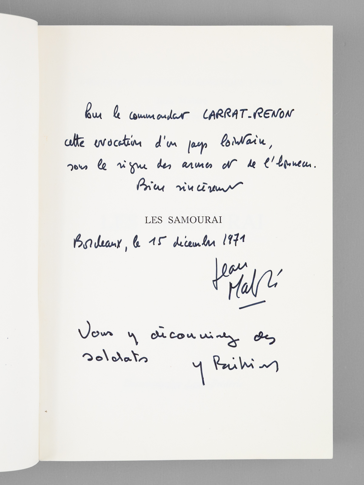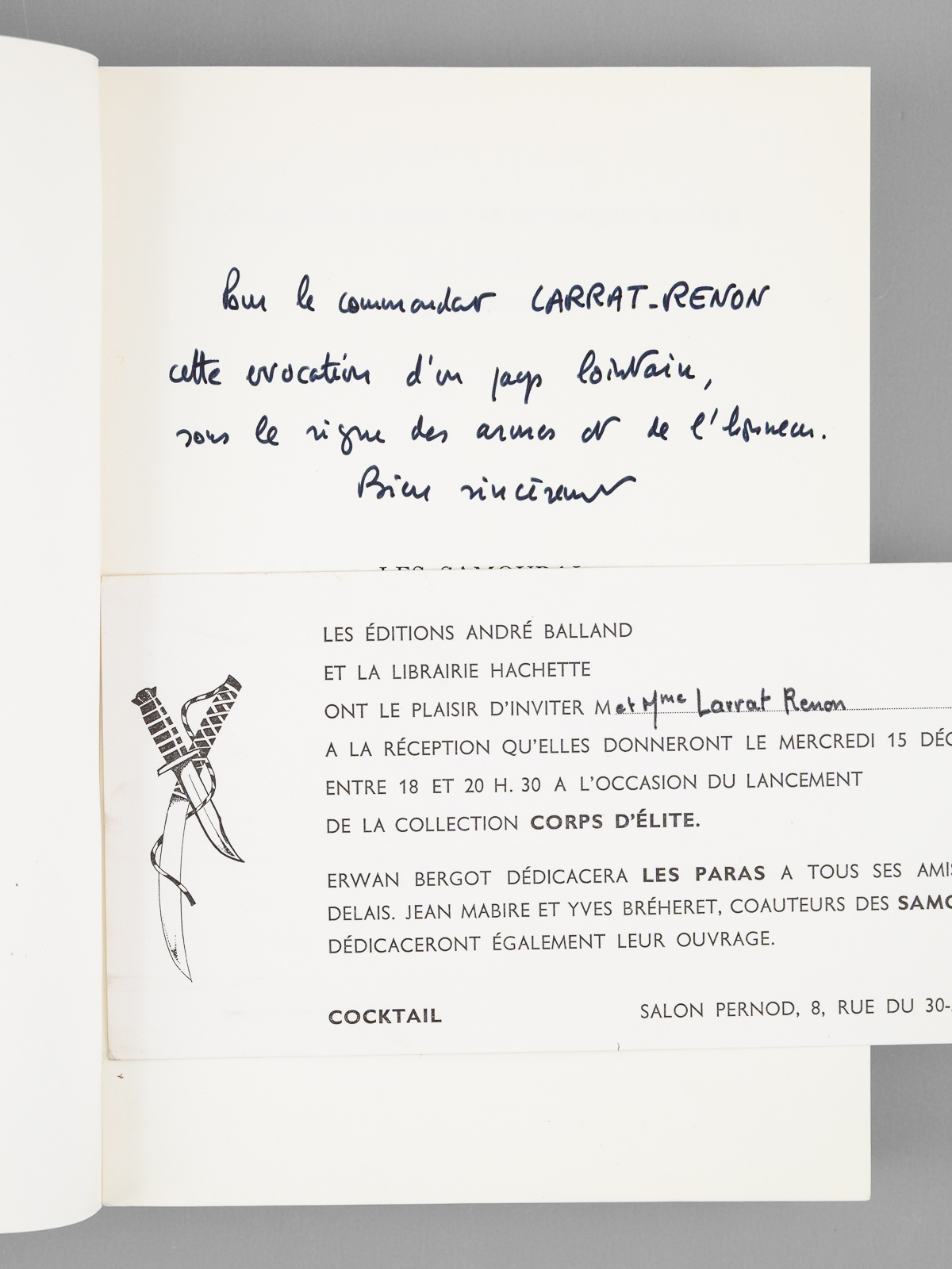 1 vol. in-8 br., collection 'Corps d'Elite' dirigée par Dominique Venner, Balland, Paris, 1971, 383 pp. Commentaire : Bel envoi de Jean Mabire 'Pour le Commandant L...R... cette évocation d'un pays lointain sous le signe des armes et de l'honneur' et de Yves Breheret : 'Vous y découvrirez des soldats'. Bon état. L'ouvrage est accompagné du carton d'invitation de l'éditeur à l'occasion du lancement de la collection 'Corps d'Elite'.