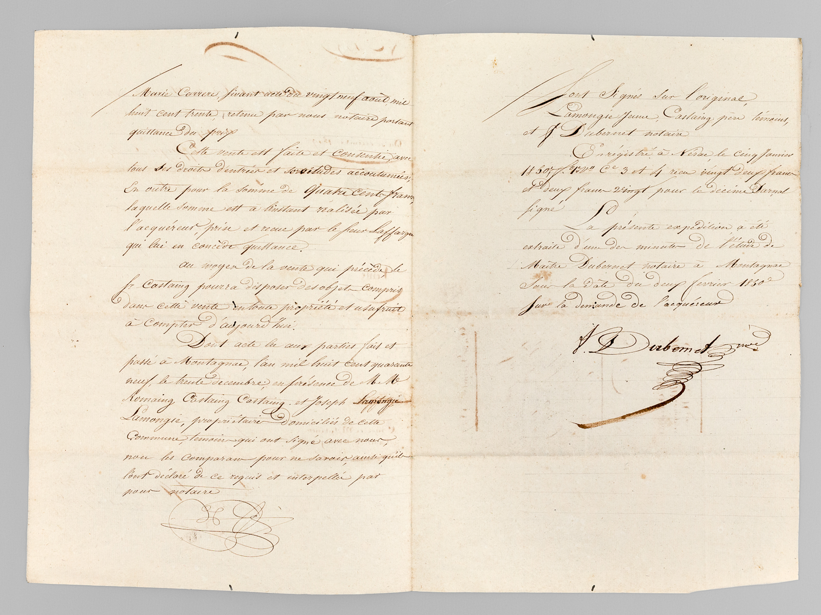 30 actes et documents manuscrits divers relatifs aux familles Descayrac, Baboulenne, Périssé et Caillau, dont : lettre ms. datée de Bourdeaux, le 19 août 1669, avec petit cachet de cire armorié, adressée à Monsieur de Combres, par Monsieur Descairac [ Descayrac ], portant reçu de 60 livres ; Acte de mariage daté du 12 may 1788 entre Joseph Perissé et Jeanne Caillau ; Acte de mariage daté de Floréal an X entre Joseph Perissé et Jeanne Duruy ; Acte de vente daté du 9 avril 1811 par Bertrand Lagourgue à Joseph Périssé, charpentier, habitant le lieu de Coulon, mairie de (Lot-et-Garonne), d'une maison située au lieu des Arrocs, mairie de Montagnac ; Traité daté du 28 octobre 1814 entre Joseph Périssé, Joseph Caillau et Antoine Dax ; Acte de mariage daté du 4 décembre 1836 entre Joseph Périssé, fils du précédent, et Marie Pinguet ; Quittance datée du 23 novembre 1838 par Jean Laffargue à Guillaume Baboulenne ; Acte de mariage daté du 14 novembre 1841 entre Guillaume Baboulenne, habitant au lieu de Lagavachotte, commune de Montagnac, et Jeanne Caillau ; Vente datée du 30 décembre 1849, par Jean Laffargue tailleur d'habit à Montagnac, à Jean Castaing, marchand ; Obligation datée du 14 décembre 1858 par les époux Baboulène et Baboulène fils à M. Lasserre ; Obligation datée du 31 mars 1879 pour prêt ameublement par Guillaume Baboulène à M. Barthélémy Lamude ; Contrat de mariage daté du 3 février 1861 entre Bernard Baboulenne, tailleur d'habit à Montagnac et Jeanne Périssé