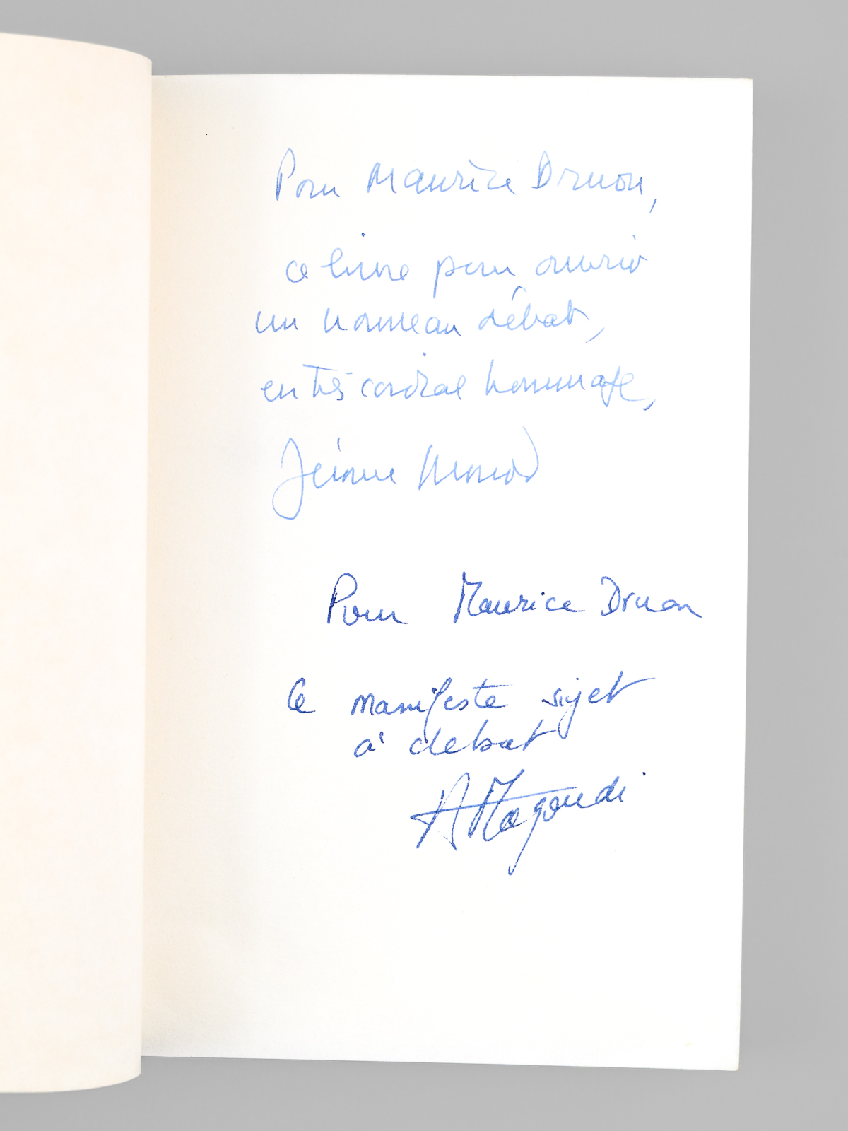 Commentaire : Etat très satisfaisant (qques annot. ms. par Maurice Druon, bon état par ailleurs) pour cet exemplaire avec des envois des deux auteurs : 'Pour Maurice Druon, ce livre pour ouvrir un nouveau débat. En très cordial hommage' (Jérôme Monod]. 'Pour Maurice Druon, ce manifeste sujet à débat' (Ali Magoudi). De la bibliothèque du grand écrivain et auteur des 'Rois Maudits', Maurice Druon (1918-2009), Secrétaire Perpétuel de l'Académie Française de 1985 à 1999 et immortel auteur avec son oncle Joseph Kessel du texte du 'Chant des Partisans'.