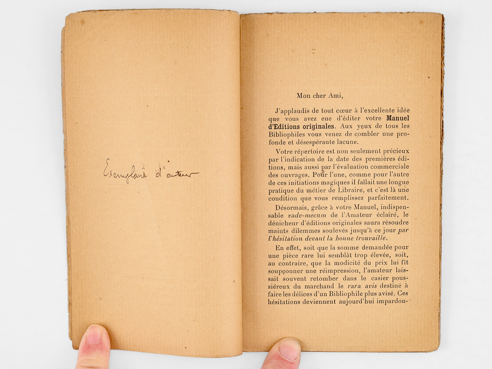 Commentaire : Très rare exemplaire de cet introuvable et curieux petit manuel, marqué à la plume 'exemplaire d'auteur', et dédicacé par l'auteur. Une véritable rareté bibliographique. Etat très satisfaisant (dos frotté). On joint la carte d'un libraire ancien bordelais, 'Sirgue & Cie'.