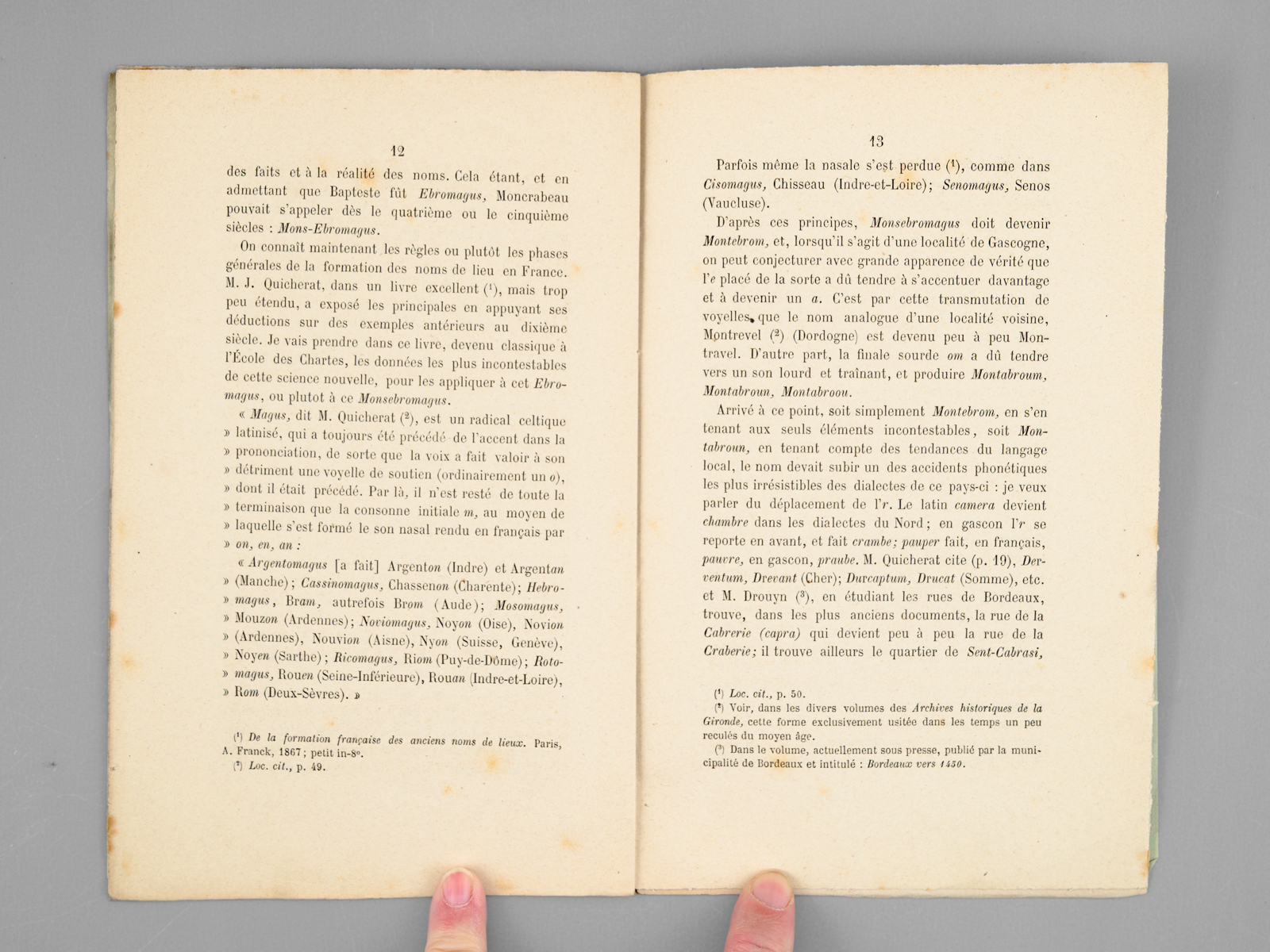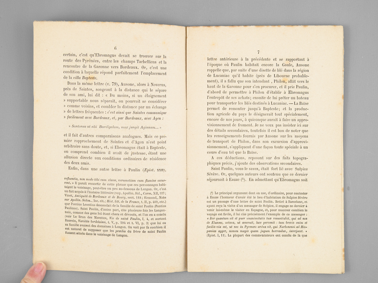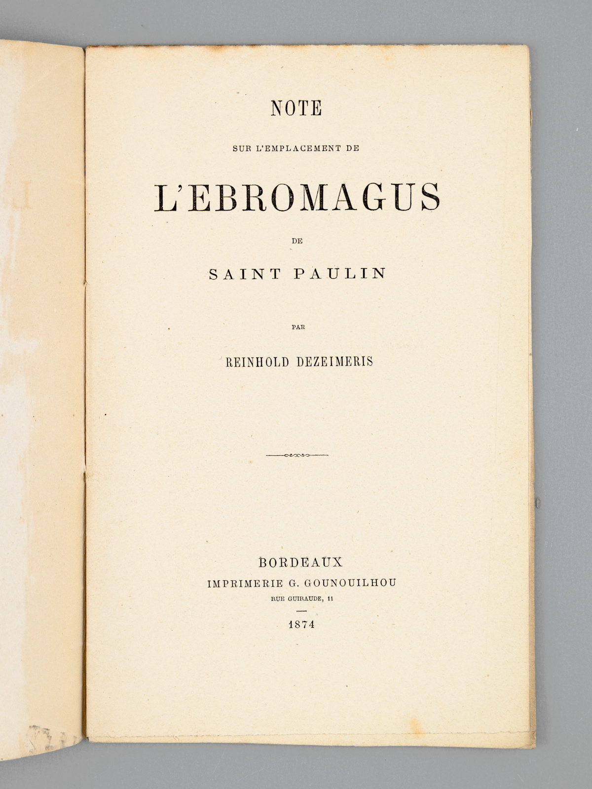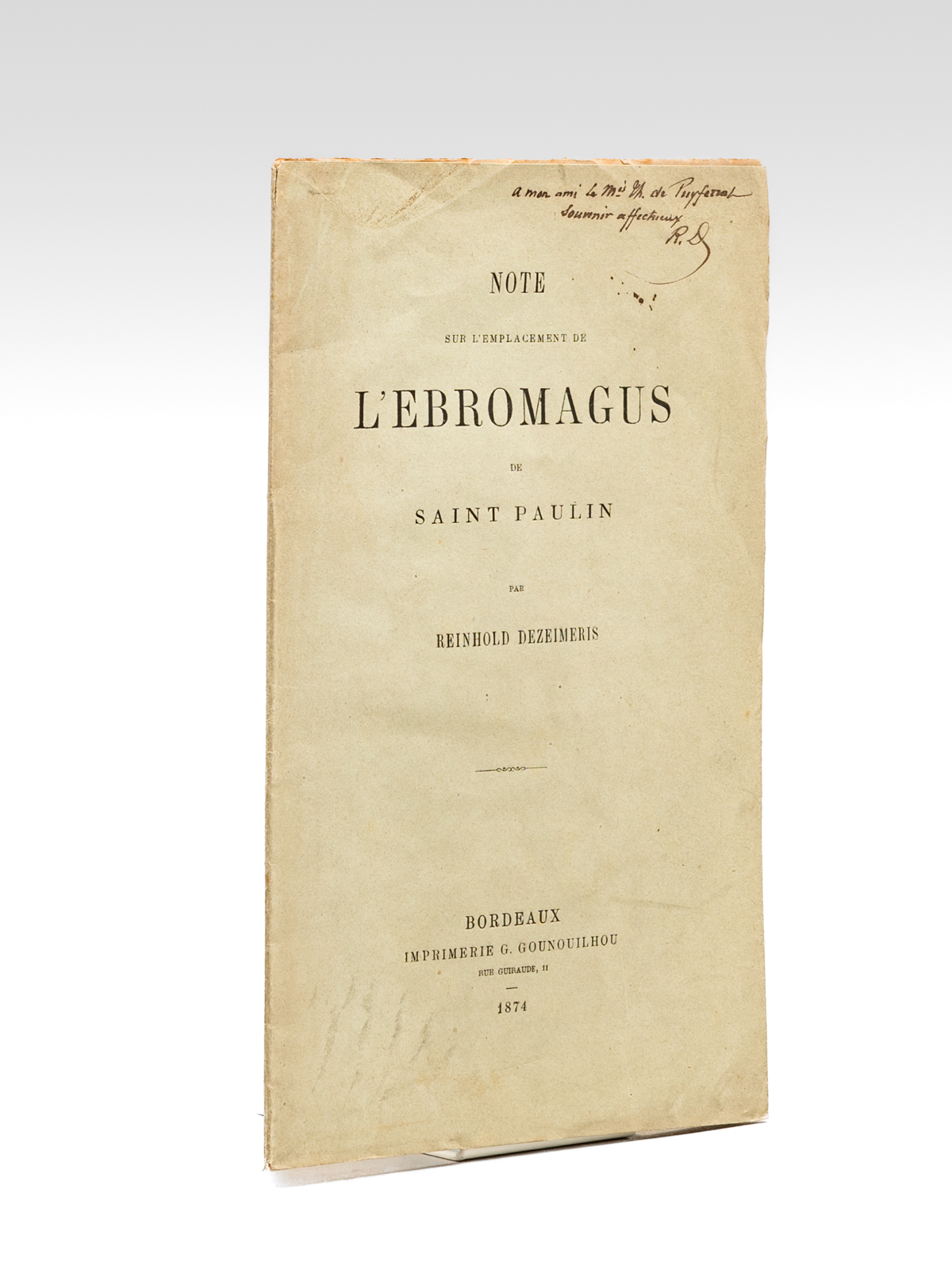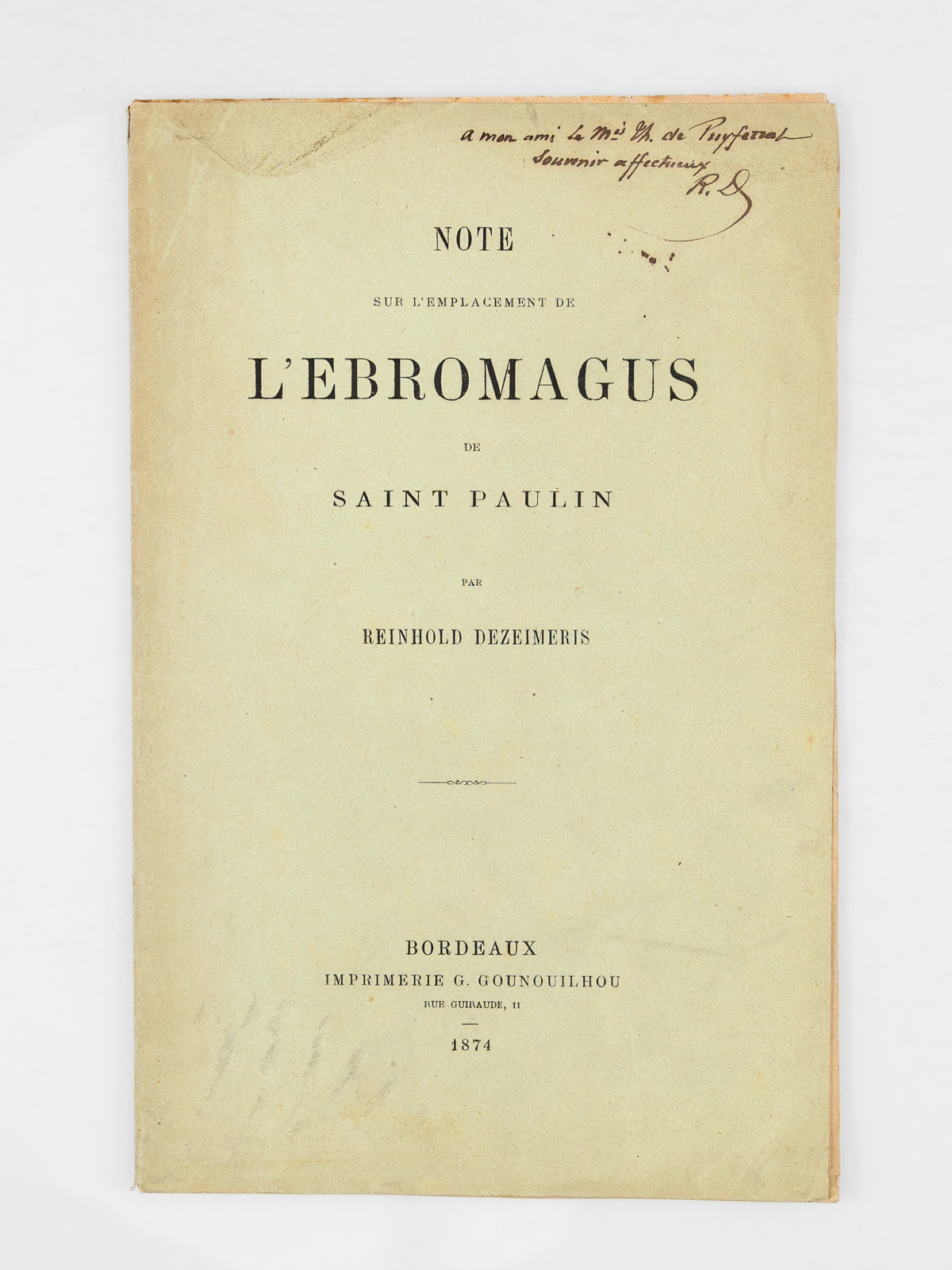 Commentaire : L'exemplaire est dédicacé à son ami le marquis 'Th. de Puyferrat, souvenir affectueux'. Reinhold Dezeimeris veut situer l'Ebromagus (ou Eburomagus) évoquée par Ausone dans sa correspondance à Saint Paulin de Nole, à Moncrabeau, en Gironde, contrairement à sa localisation traditionnelle dans l'Aude. Bon état