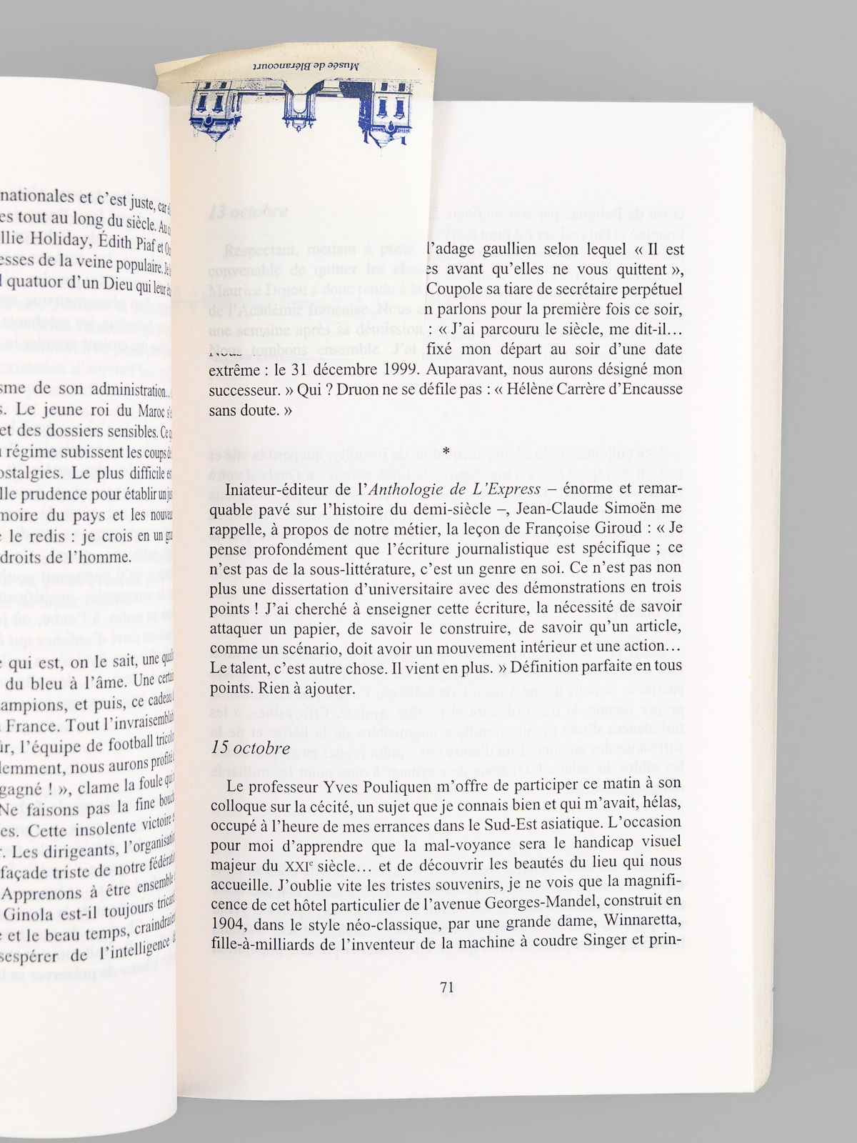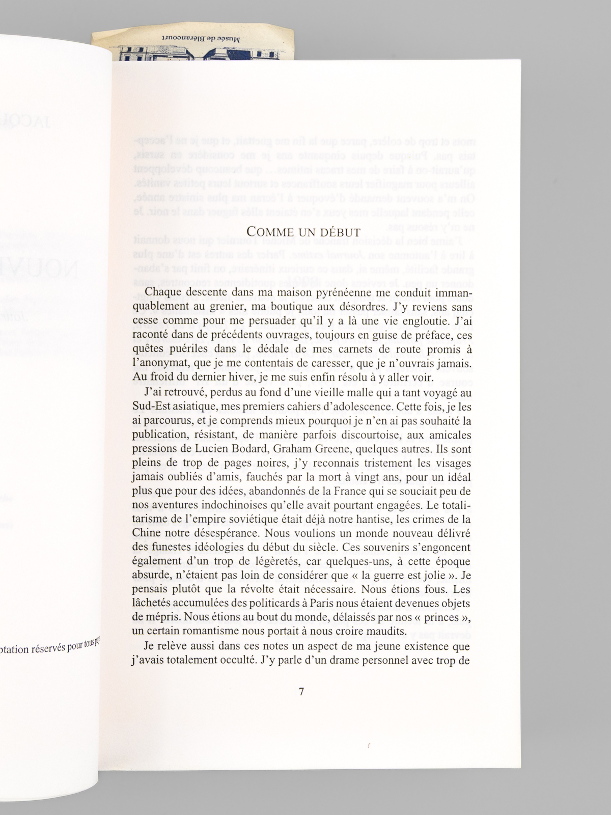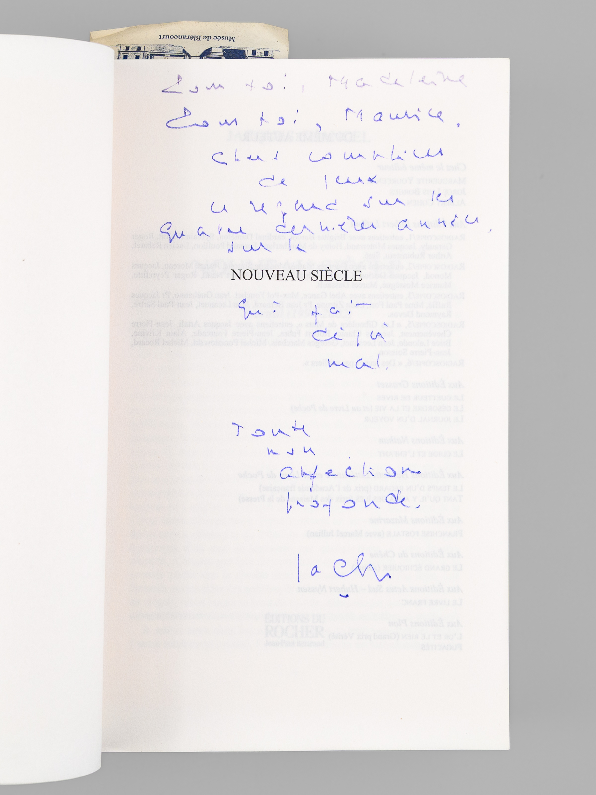 Envoi ms. de l'auteur, 1 vol. in-8 br., éditions du Rocher, 2003, 618 pp. Commentaire : Bon état. Avec un bel envoi à Maudrice Druon et à son épouse : 'Pour toi Madeleine. Pour toi, Maurice. Chers complices de jeux. Ce regard sur ces quatre dernières années, sur ce nouveau siècle qui fait déjà mal. Toute mon affection profonde.' Exemplaire provenant de la bibliothèque du grand écrivain et auteur des 'Rois Maudits', Maurice Druon (1918-2009), Secrétaire Perpétuel de l'Académie Française de 1985 à 1999 et immortel auteur avec son oncle Joseph Kessel du texte du 'Chant des Partisans'.