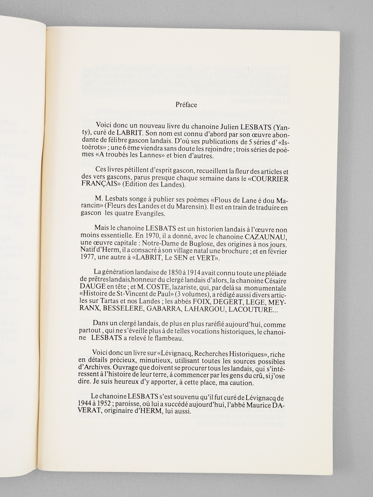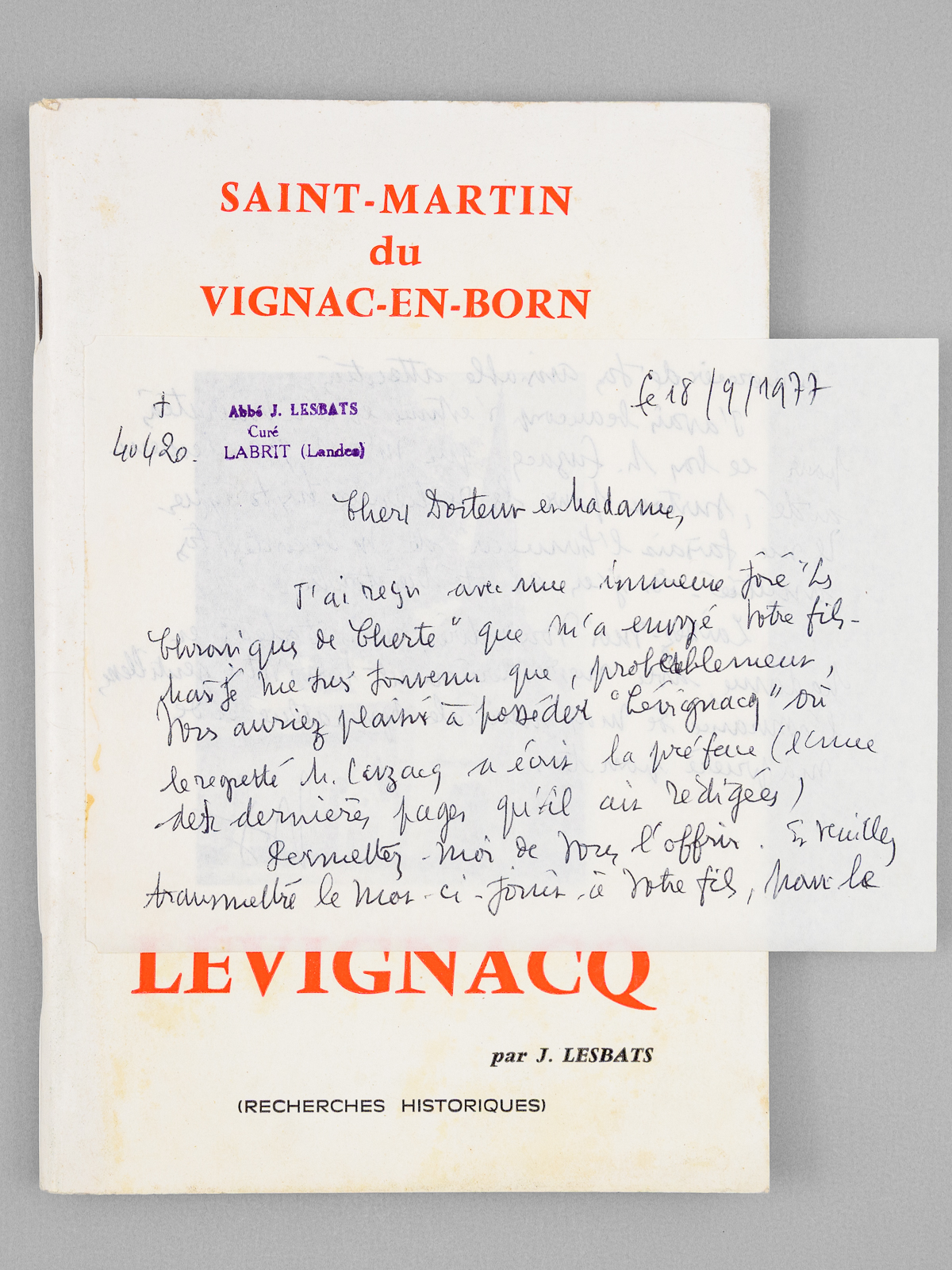 Commentaire : Bel envoi de l'abbé Lesbats, qui a également joint une lettre autographe signée. Les 2 écrits évoquent le professeur René Cuzacq, ami de l'auteur et préfacier du présent ouvrage.