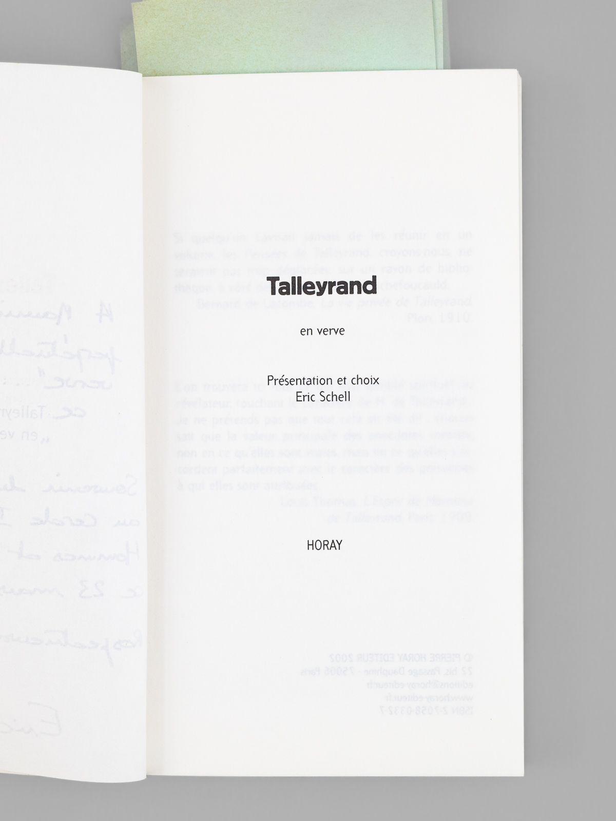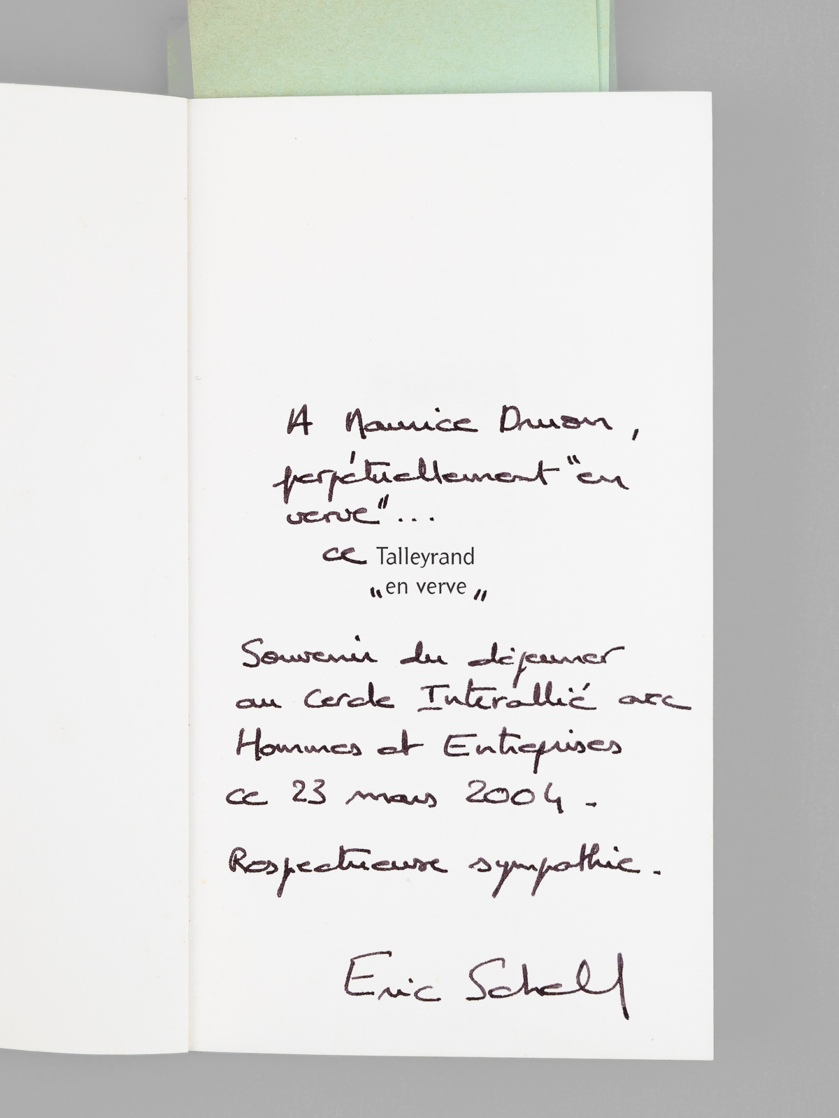 Emvoi ms. d'Eric Schell, 1 vol. in-12 br., coll. En verve, Pierre Horay éditeur, 2007, 124 pp. Commentaire : Etat très satisfaisant (annot. et soulignements ms. par Maurice Druon, bon état par ailleurs). Bel envoi à Maurice Druon : 'A Maurice Druon, perpétuellement 'en verve', ce Talleyrand 'en verve', souvenir du déjeuner du Cercle Interallié avec Hommes et Entreprises, ce 23 mars 2004. Respectueuse sympathie.'. De la bibliothèque du grand écrivain et auteur des 'Rois Maudits', Maurice Druon, Secrétaire Perpétuel de l'Académie Française de 1985 à 1999 et immortel auteur avec son oncle Joseph Kessel du texte du 'Chant des Partisans'.