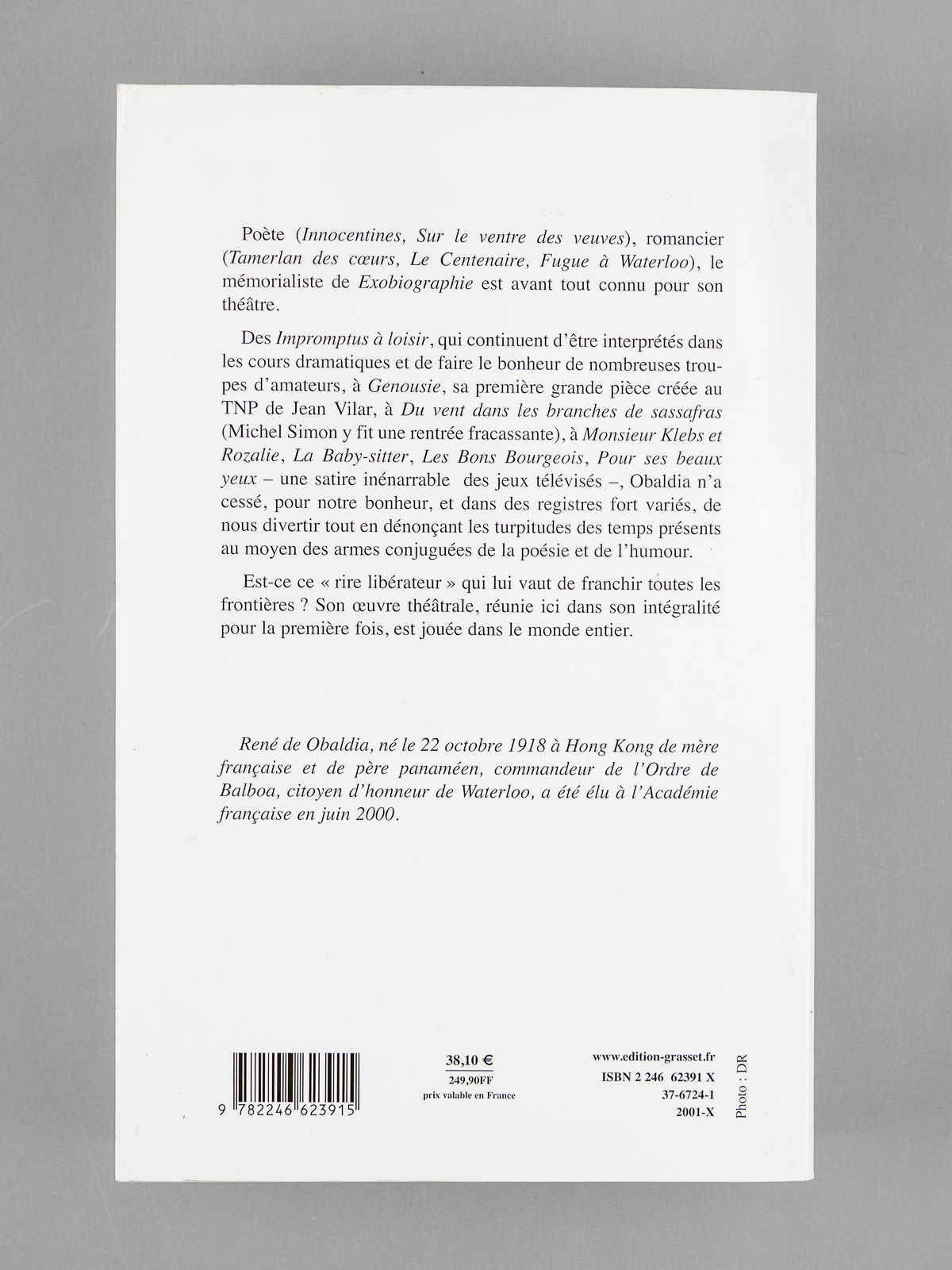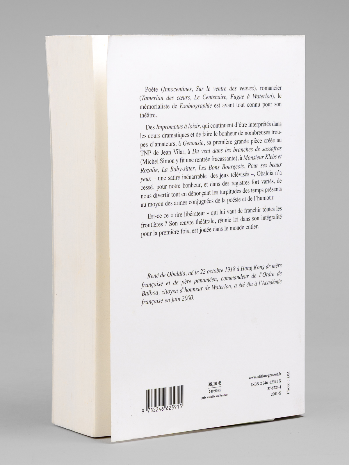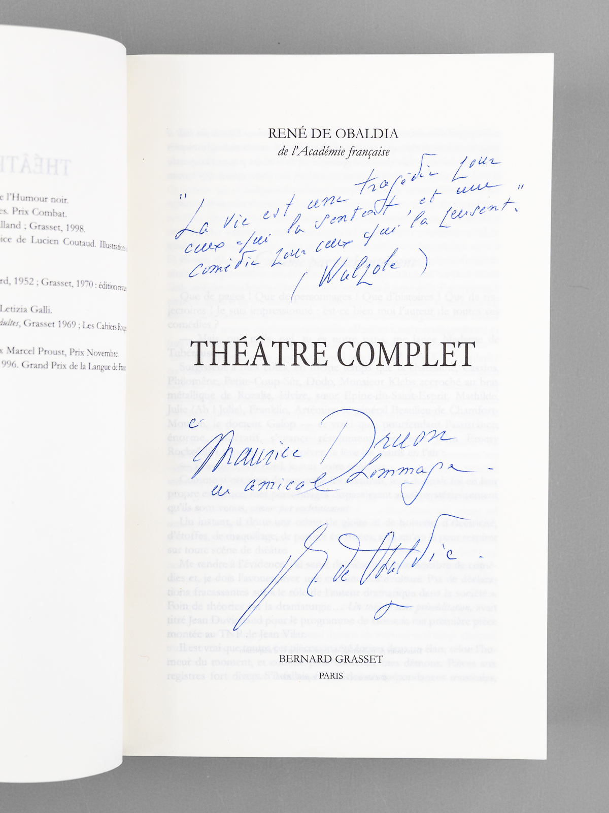 1 vol. fort in-8 br., Bernard Grasset, Paris, 2001, 1114 pp. Commentaire : Bel envoi de René de Obaldia : 'La vie est une tragédie pour ceux qui la sentent, et une comédie pour ceux qui la pensent (Walpole)'. A Maurice Druon en amical hommage'. Bon état (qq. rouss. sur tranche sup.) pour cet exemplaire de superbe provenance : de la bibliothèque du grand écrivain Maurice Druon, Secrétaire Perpétuel de l'Académie Française de 1985 à 1999.
