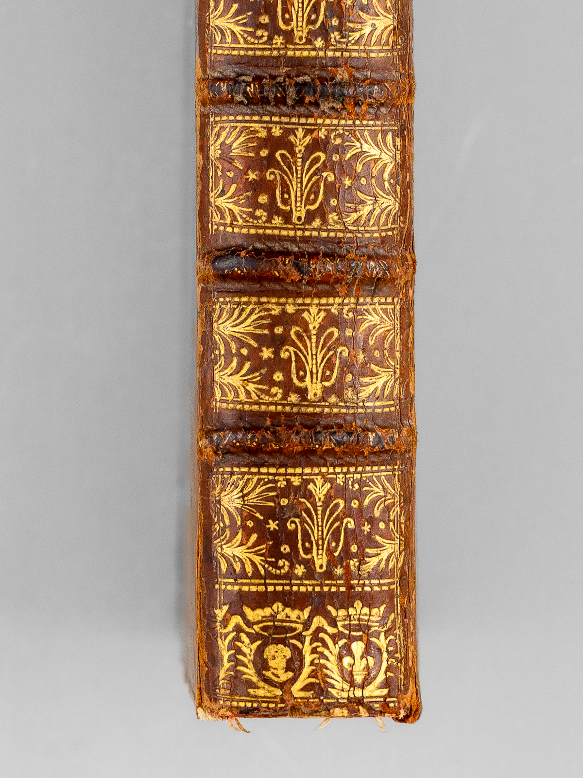 1 vol. in-12 reliure de l'époque plein veau brun, dos à 5 nerfs orné, roulette aux armes au dos en queue (mascaron couronné et lys couronné, chacuns entourés de palmes), Chez De Bure, Paris, 1737, 8 ff., 498 pp. et 3 ff. n. ch.