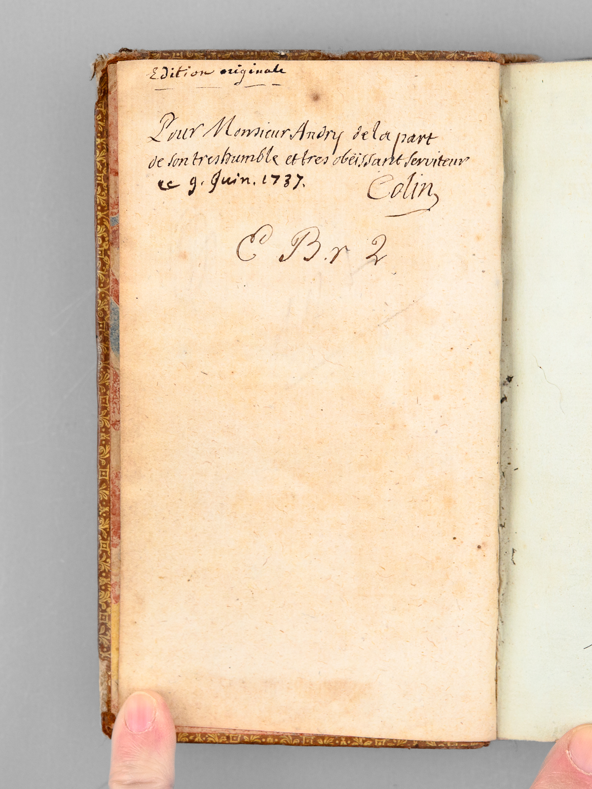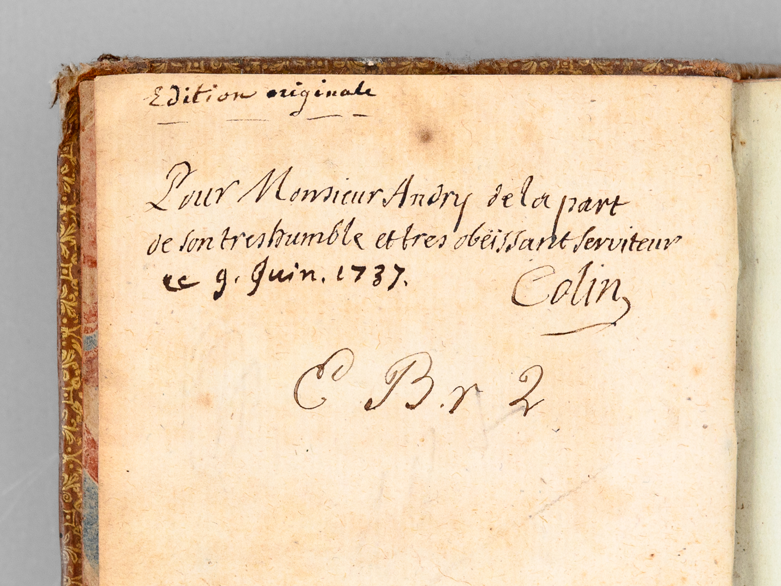 Commentaire : Remarquable exemplaire, dédicacé par l'Abbé Hyacinthe Colin 'Pour Monsieur Andry, de la part de son très humble et très obéissant serviteur' et daté d'une autre plume 'ce 9 juin 1737'. Le dédicataire est probablement Nicolas Andry de Bois-Regard (1658-1742), fameux médecin doyen de la Faculté de Paris, et homme de lettres puissant et redouté, qui avait commencé son oeuvre par une traduction du latin, le Panégyrique de l'empereur Théodose du Bordelais Drepanius Pacatus. Critique littéraire influent, il était un pilier du 'Journal des Savants' et est l'inventeur du mot 'orthopédie'. L'Abbé Hyacinthe Colin (1690-1745), latiniste distingué, fut un traducteur réputé. L'exemplaire est orné d'une jolie roulette aux armes au dos en queue (mascaron et lys couronnés, chacuns entourés de palmes). Etat satisfaisant (coiffes arasées, coupes frottées, bon état par ailleurs).
