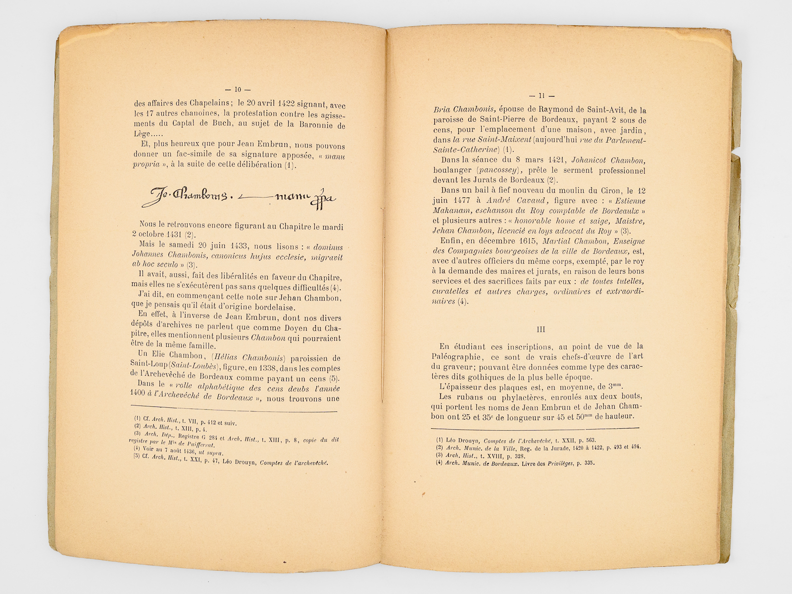 Commentaire : Il s'agit de 3 inscriptions funéraires gravées sur bronze, des XIVe et XVe siècles se rapportant à Jean Embrun, chanoine et doyen de l'église métropolitaine de Saint-André de Bordeaux, et à Jehan Chambon, chanoine au même chapitre. Etat très satisfaisant (marges un peu frottées)