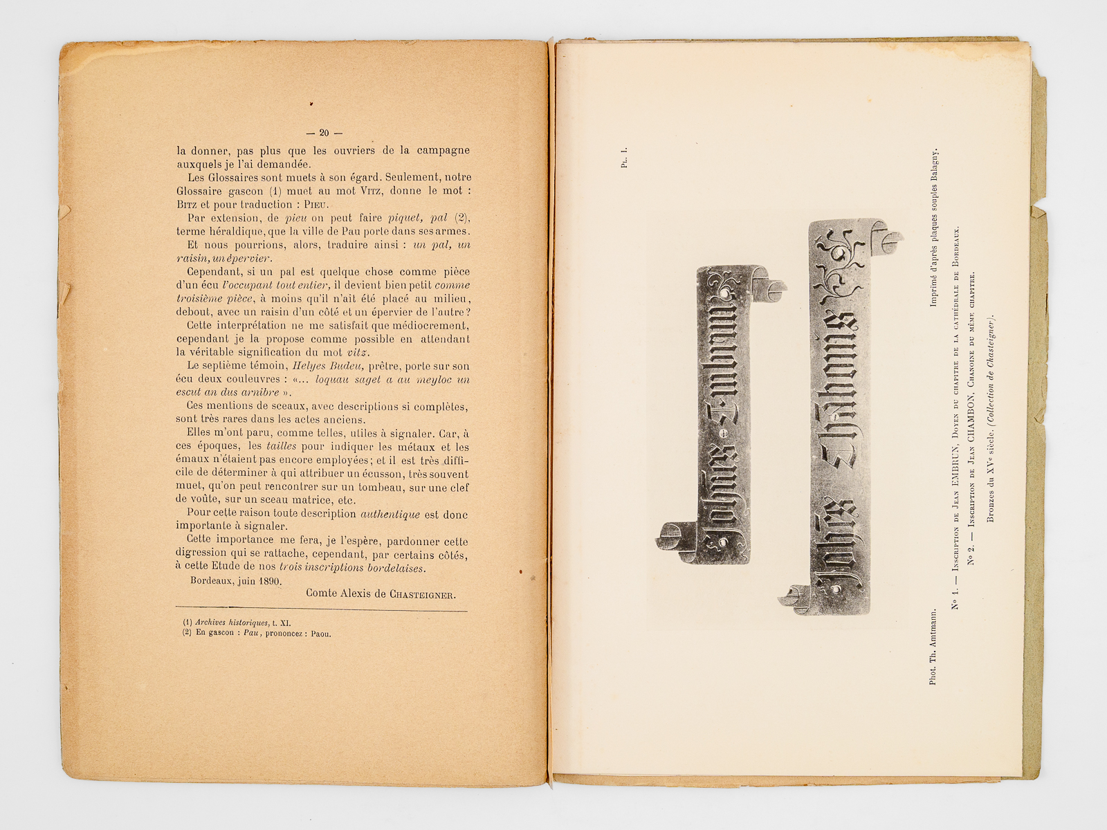 Par M. le comte A. de Chasteigner Président de la Société Archéologique de Bordeaux, 1 brochure in-8, Extrait des Actes de la Société archéologique de Bordeaux T. XV, fasc. III ; Imprimerie Vve Cadoret, Bordeaux, 1891, 20 pp. avec 3 planches dépliantes
